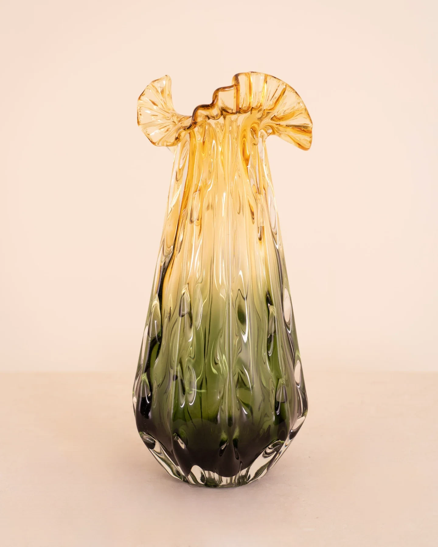 Jarrón fabricado en vidrio templado. Su acabado en tonos amarillos y verdes lo es todo.
