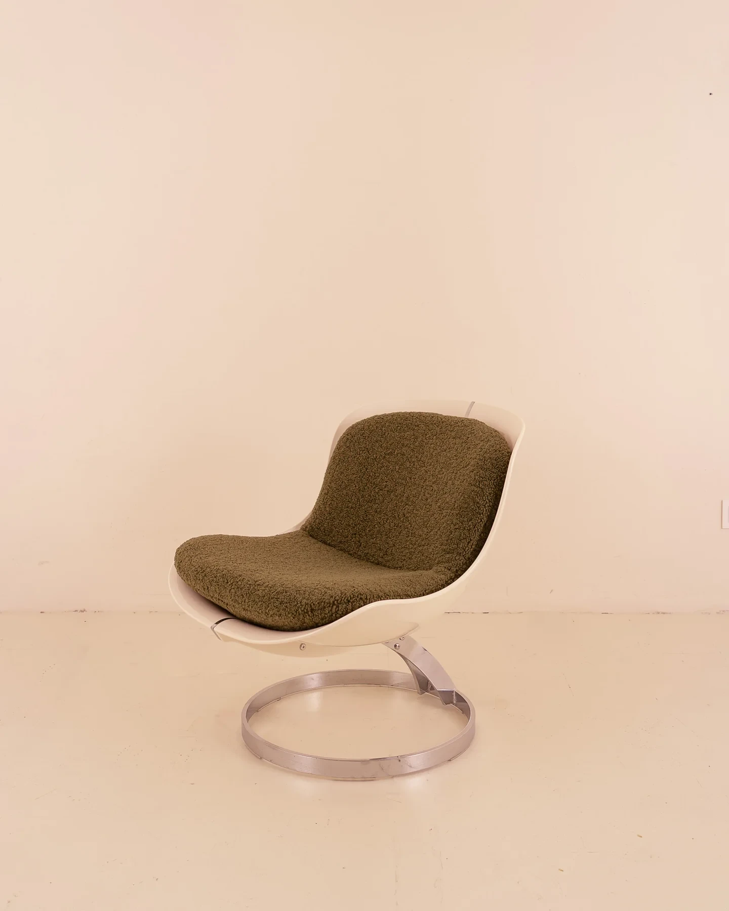 Butaca de estilo mid century fabricada en plexiglás, hierro plateado y asiento tapizado en verde. Una inspiración para los seguidores del diseño retro.