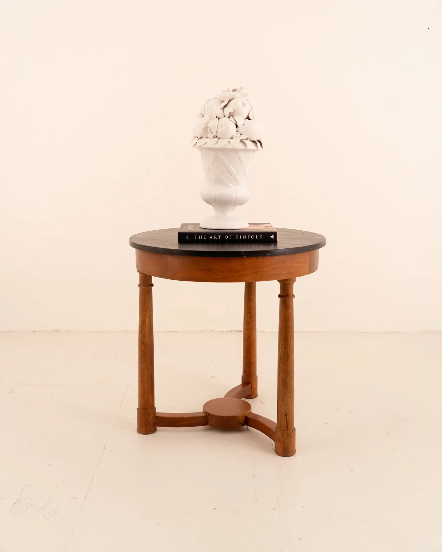 Espectacular velador fabricado en madera de mango con acabado colonia y tapa circular en mármol negro. Su diseño clásico lo convierte en una apuesta elegante y atemporal.