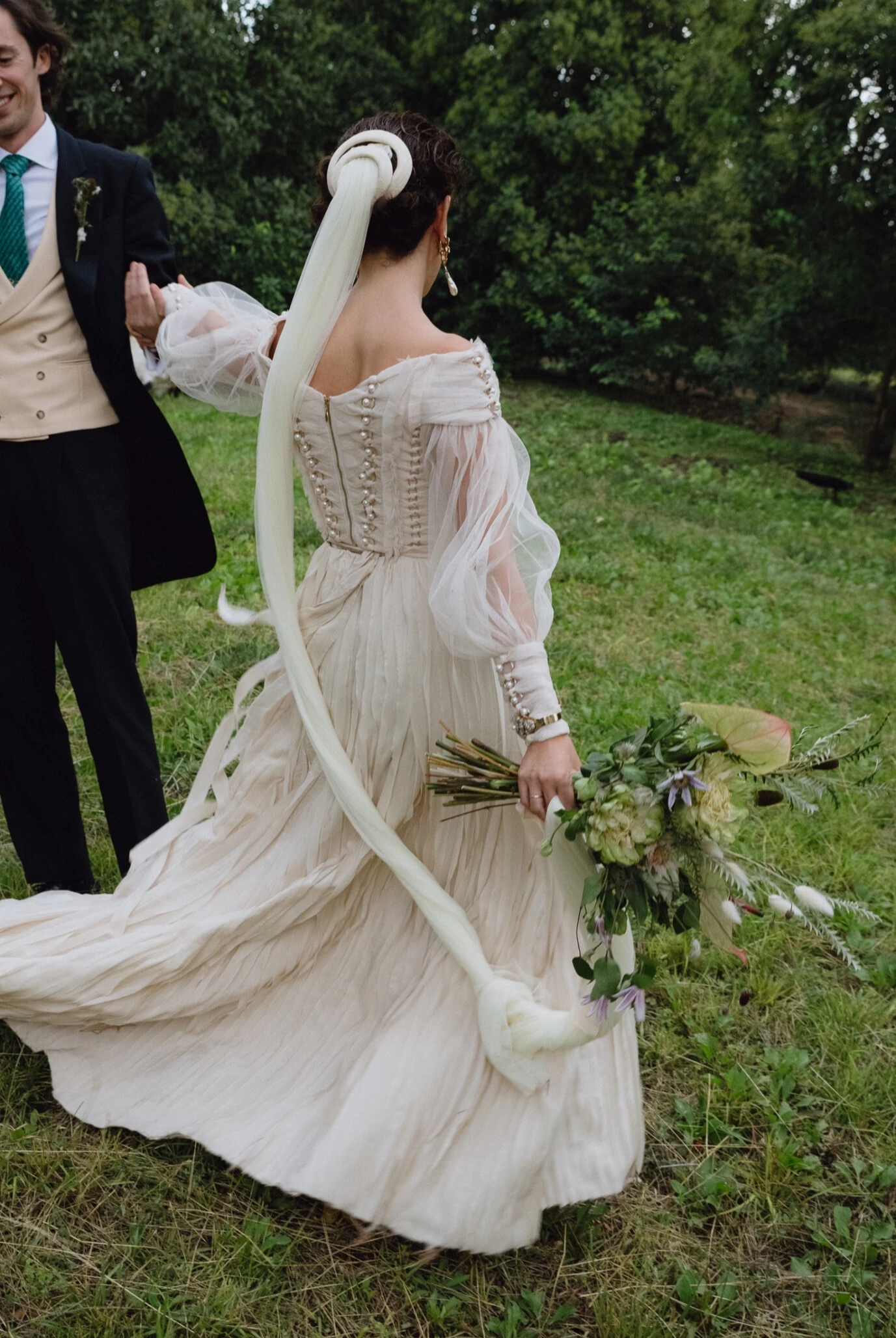 Sobre el vestido, Sofía llevaba una capa también plisada que hacía de cola, con nudos en las mangas y en la parte delantera «para conseguir la forma que Lorenzo quería», después de varios meses modelando el vestido sobre ella. «Cinco minutos antes de salir de casa, decidí ponerme un velo de tul muy fino que llevé solo en la iglesia».