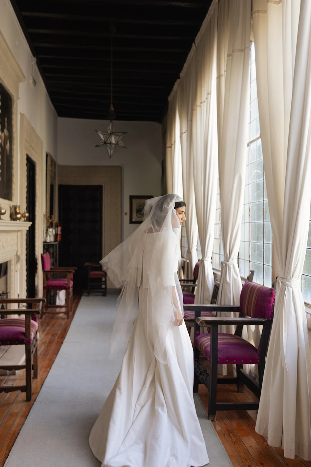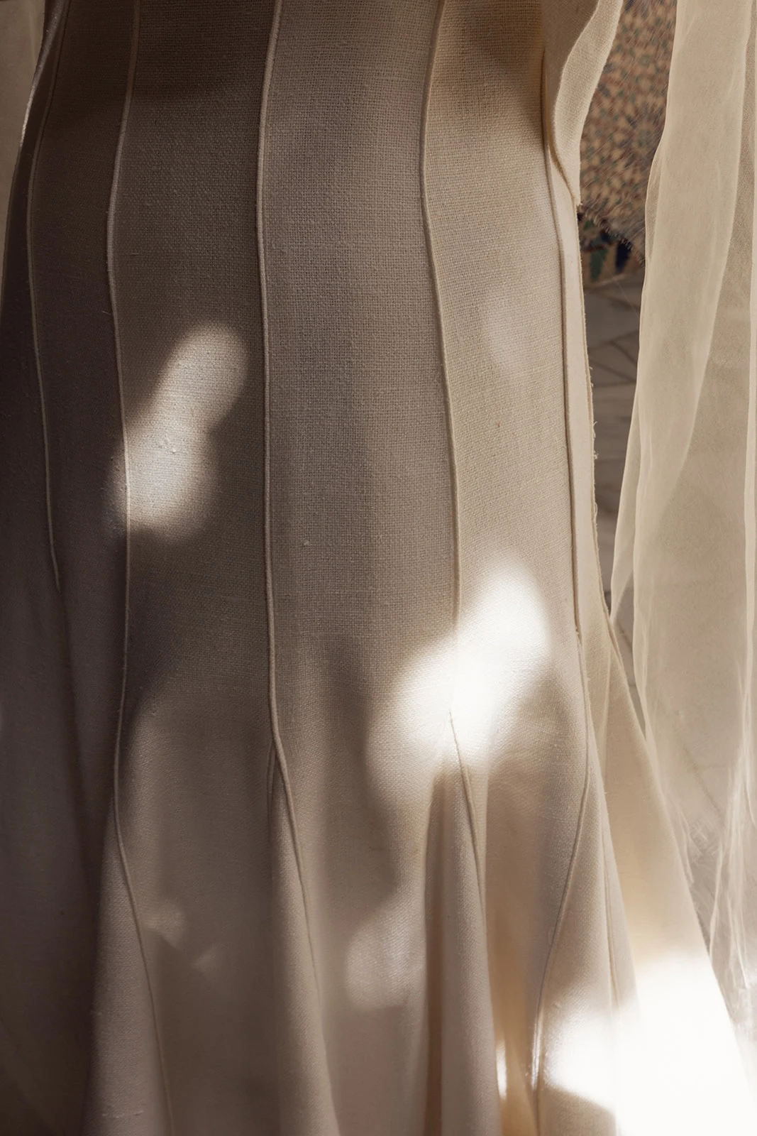 Guetaria y me enamoré de sus patrones atemporales y sobriedad. Cuando llegó el momento de hacerme el vestido di con Sofía Delgado. Dio en el clavo con una propuesta y enseguida me sacó una falda maravillosa a base de pequeños pliegues que más tarde fusionaríamos con una camisa superpuesta, todo ello en seda rústica, un tejido natural en color crudo».