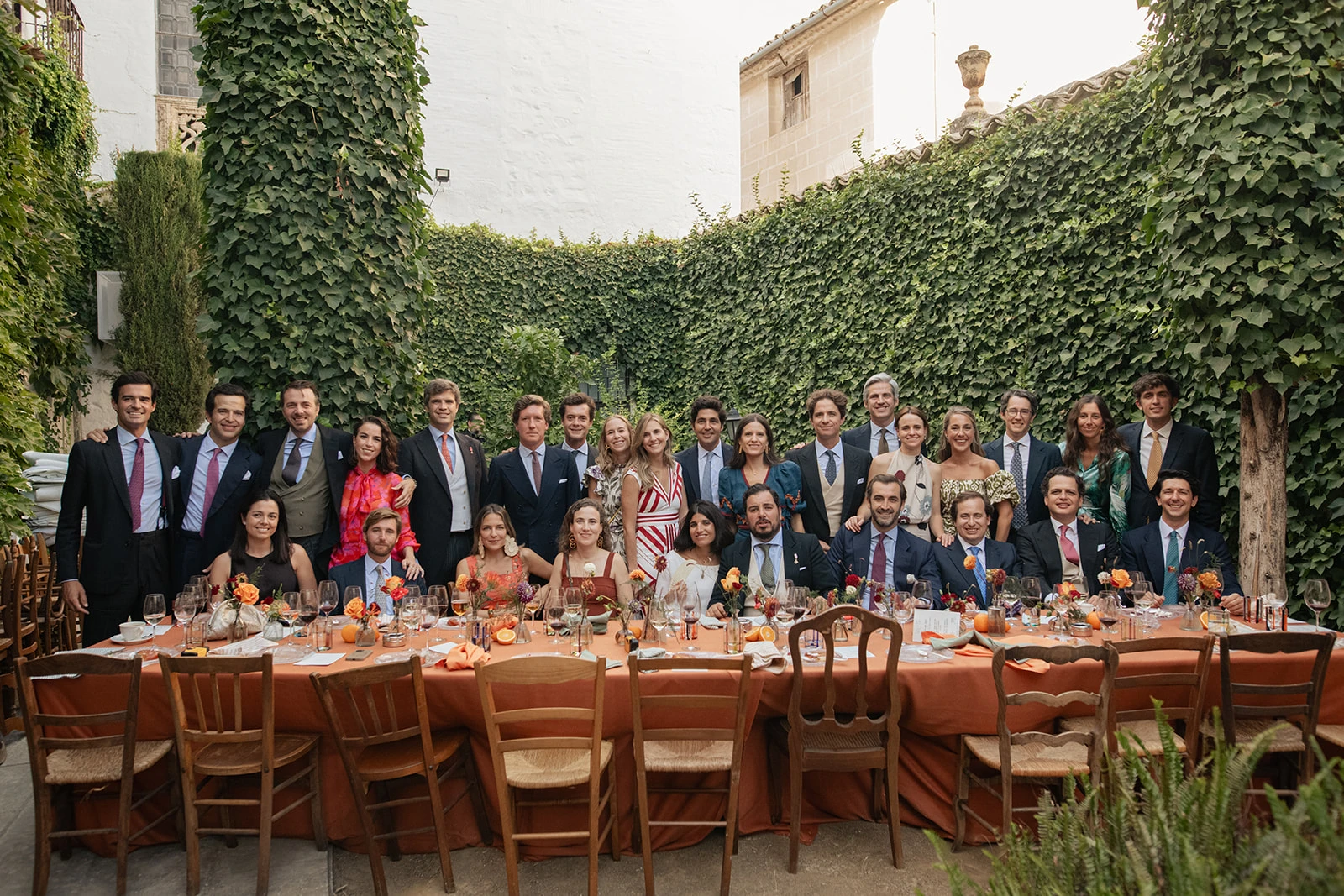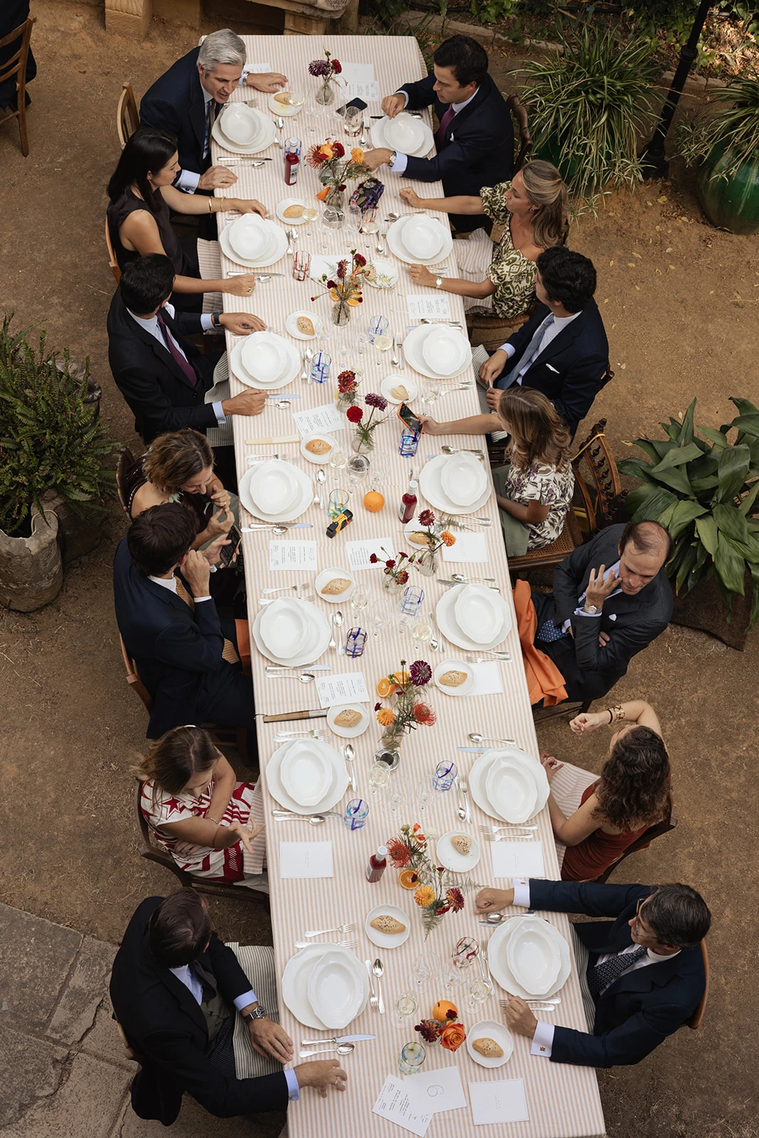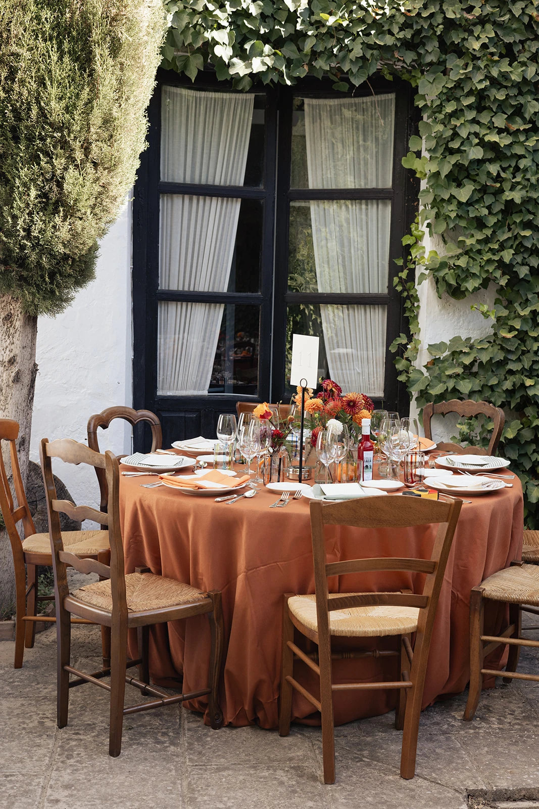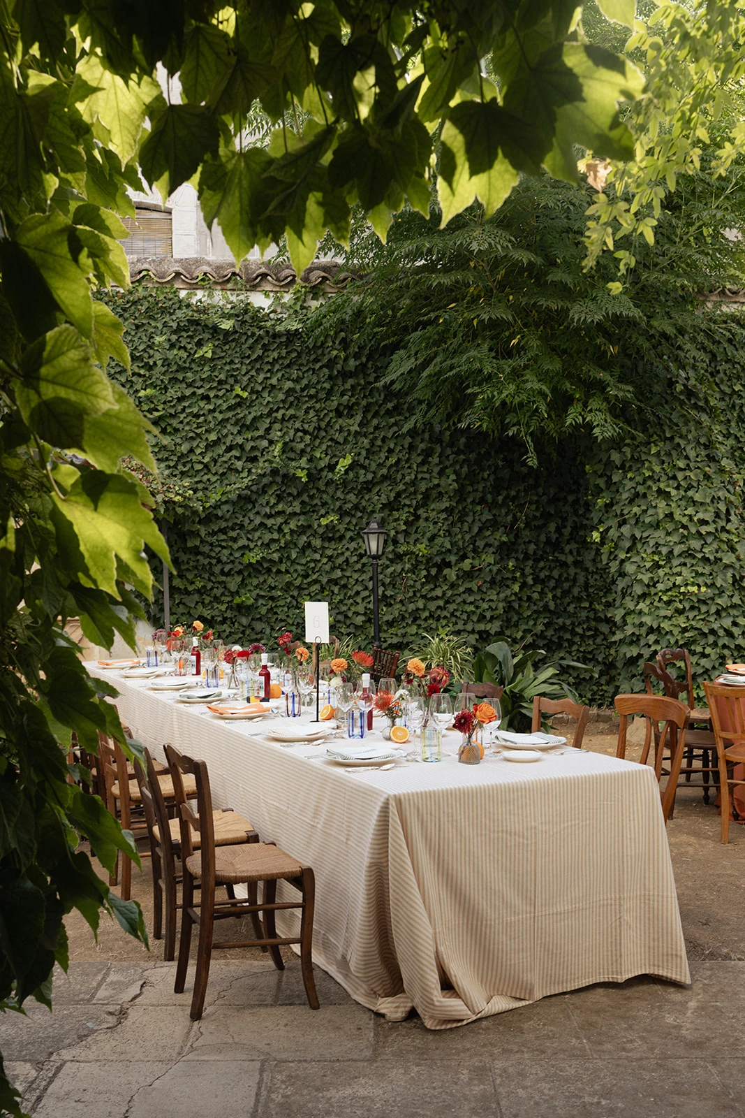 «Después de la ceremonia fuimos al Palacio de la Rambla, renacentista del siglo XVI. Mantenemos un vínculo muy especial porque pertenece a mi familia», explica la novia. Aunque el espacio no estuviese del todo adaptado para grandes celebraciones lo organizaron todo para celebrar allí su boda como un almuerzo familiar e íntimo, bonito y divertido por igual.