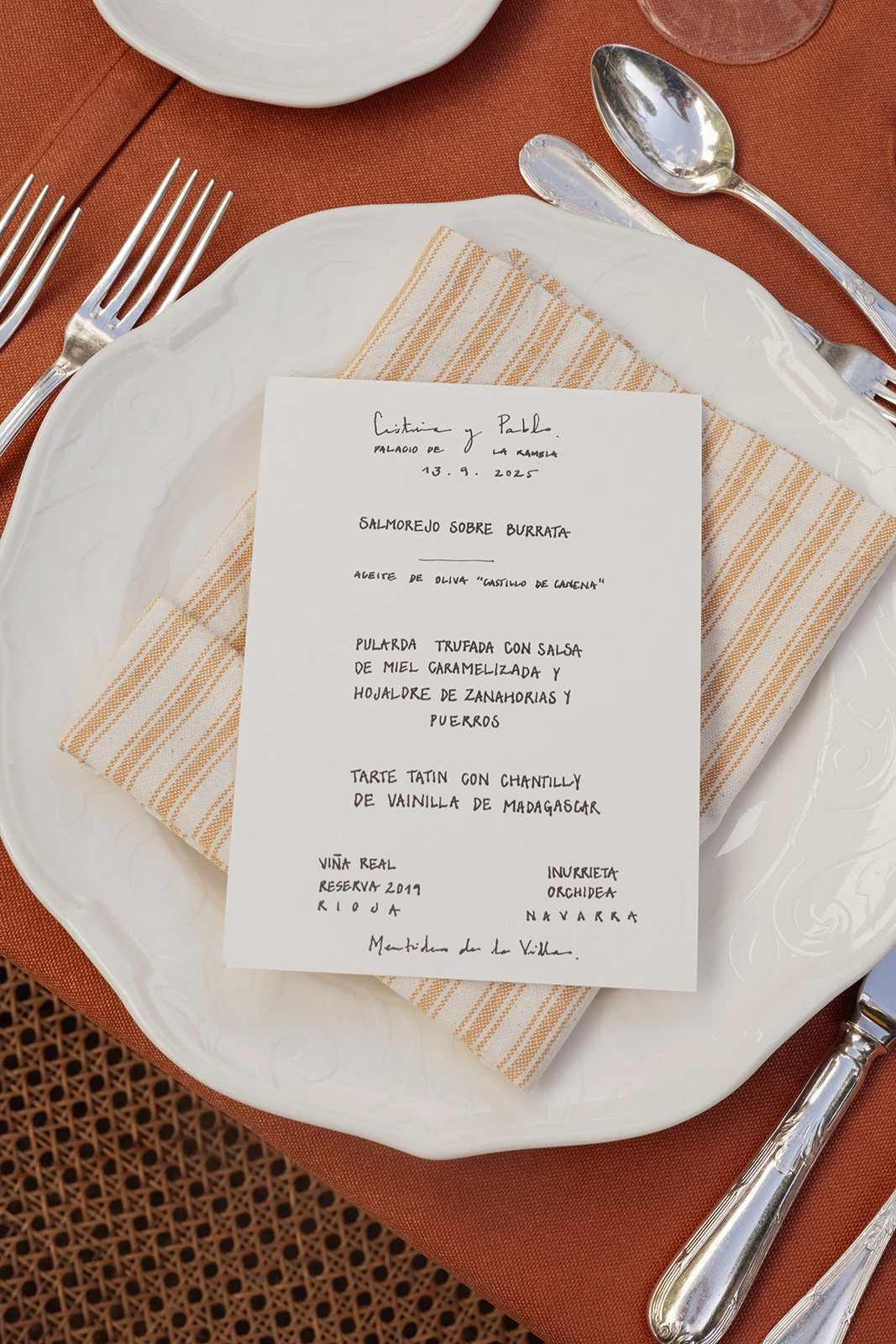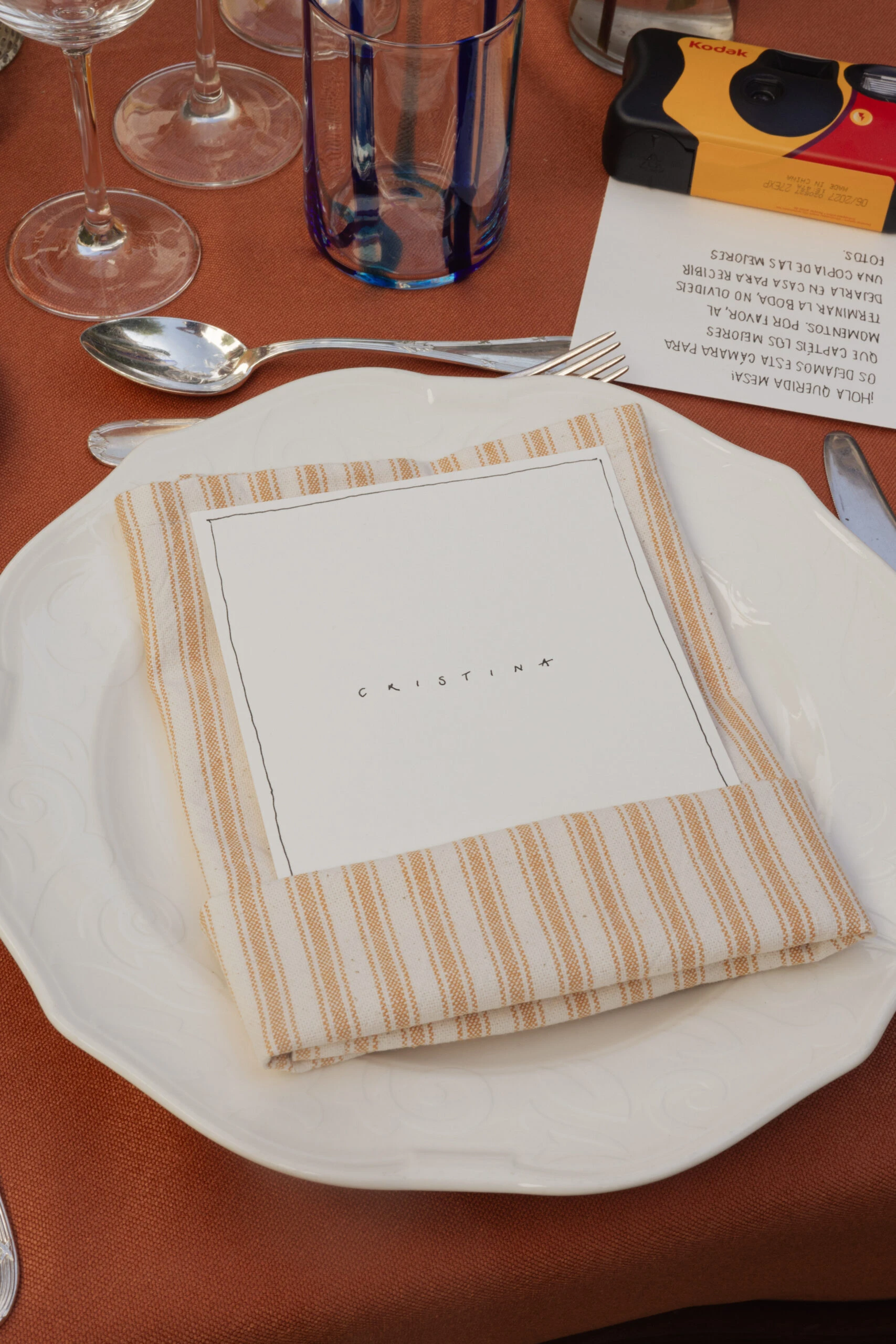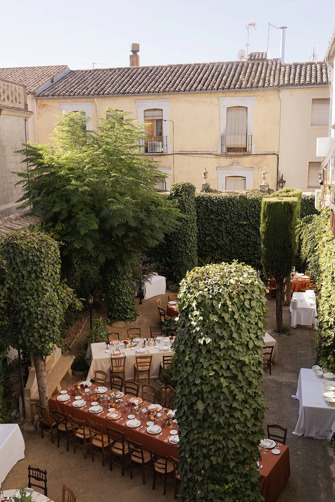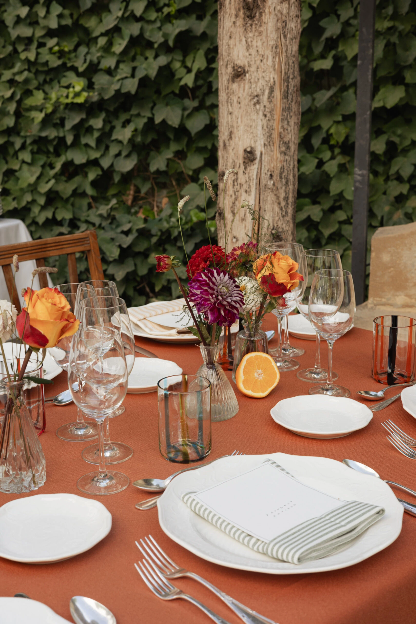 «Después de la ceremonia fuimos al Palacio de la Rambla, renacentista del siglo XVI. Mantenemos un vínculo muy especial porque pertenece a mi familia», explica la novia. Aunque el espacio no estuviese del todo adaptado para grandes celebraciones lo organizaron todo para celebrar allí su boda como un almuerzo familiar e íntimo, bonito y divertido por igual.