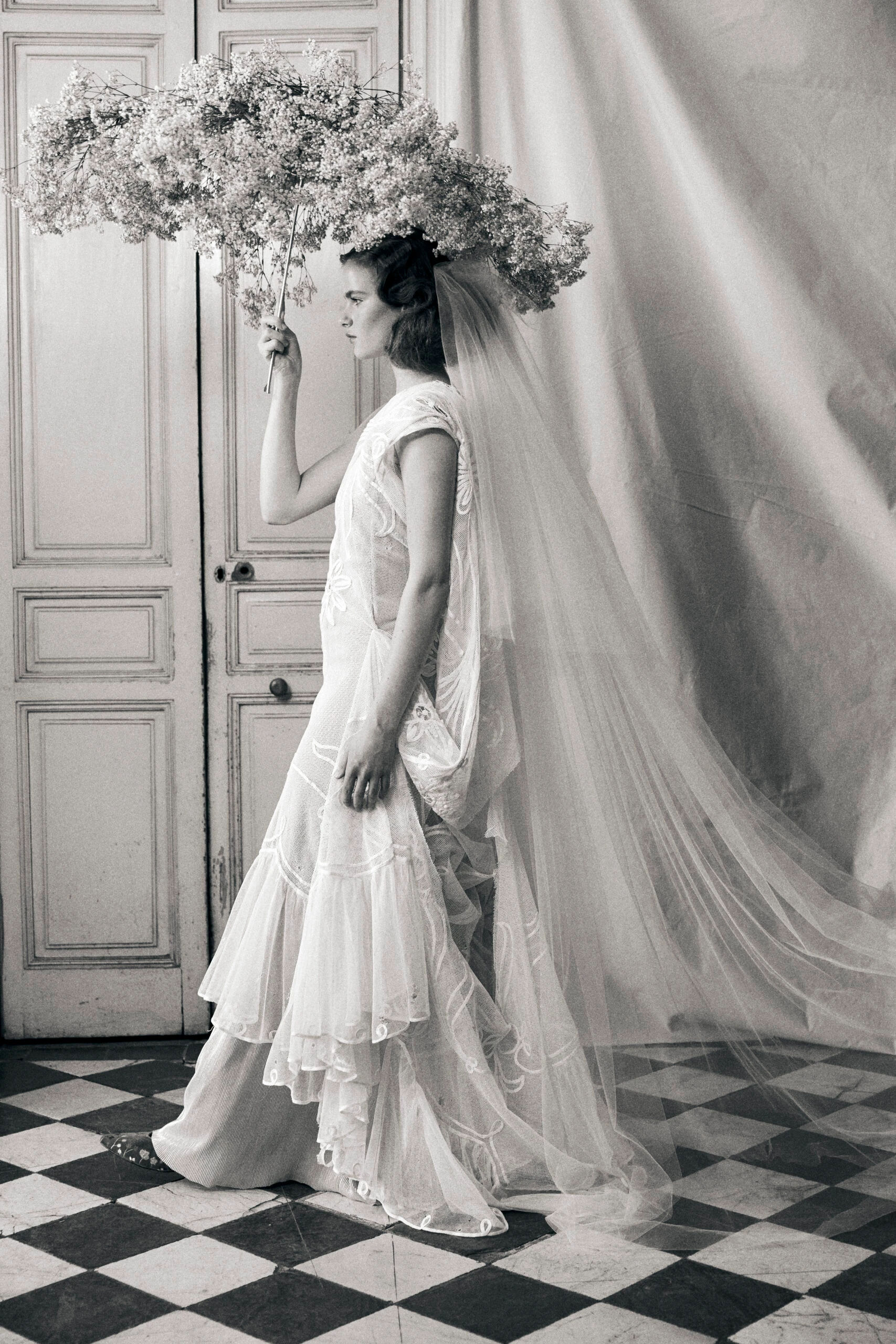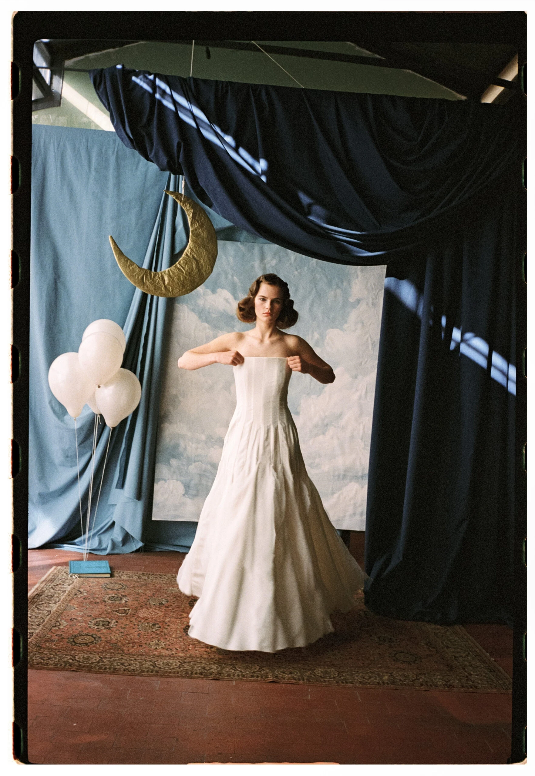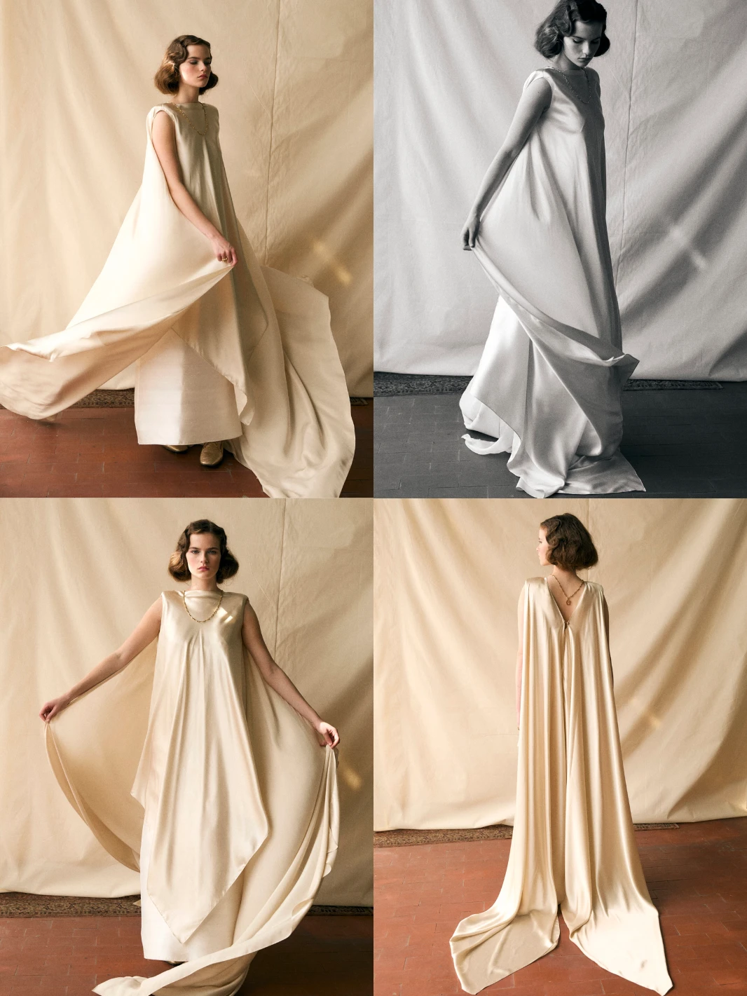 Lejos de los patrones rígidos, Paula trabaja directamente sobre la modelo, dejando que el vestido se construya solo, con la naturalidad de quien confía en el poder de la intuición y la artesanía. “Es la misma manera en la que trabajo con mis novias”, explica. “Me gusta ver qué surge en el momento, cómo el tejido guía la forma, el resultado son siluetas modernas y relajadas, pensadas para la novia actual que busca sentirse cómoda y auténtica; aquella que quiere bailar hasta el amanecer sin preocuparse de nada más que disfrutar de su día”.