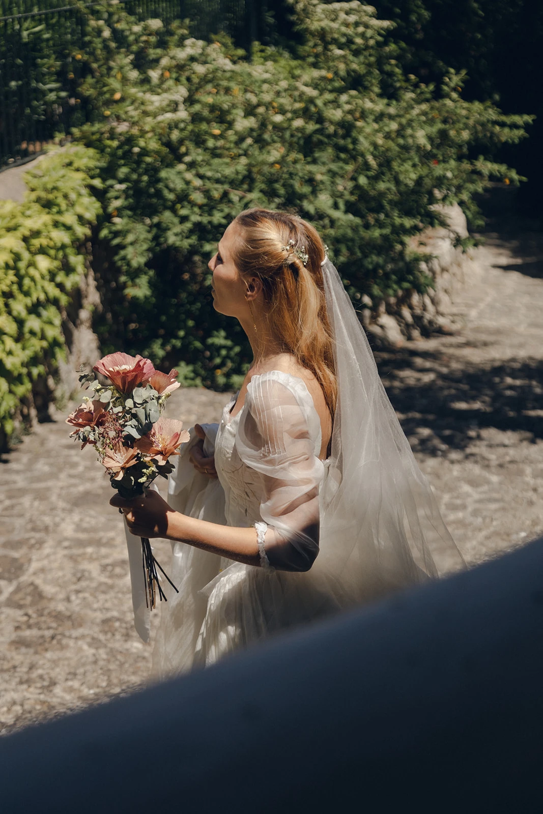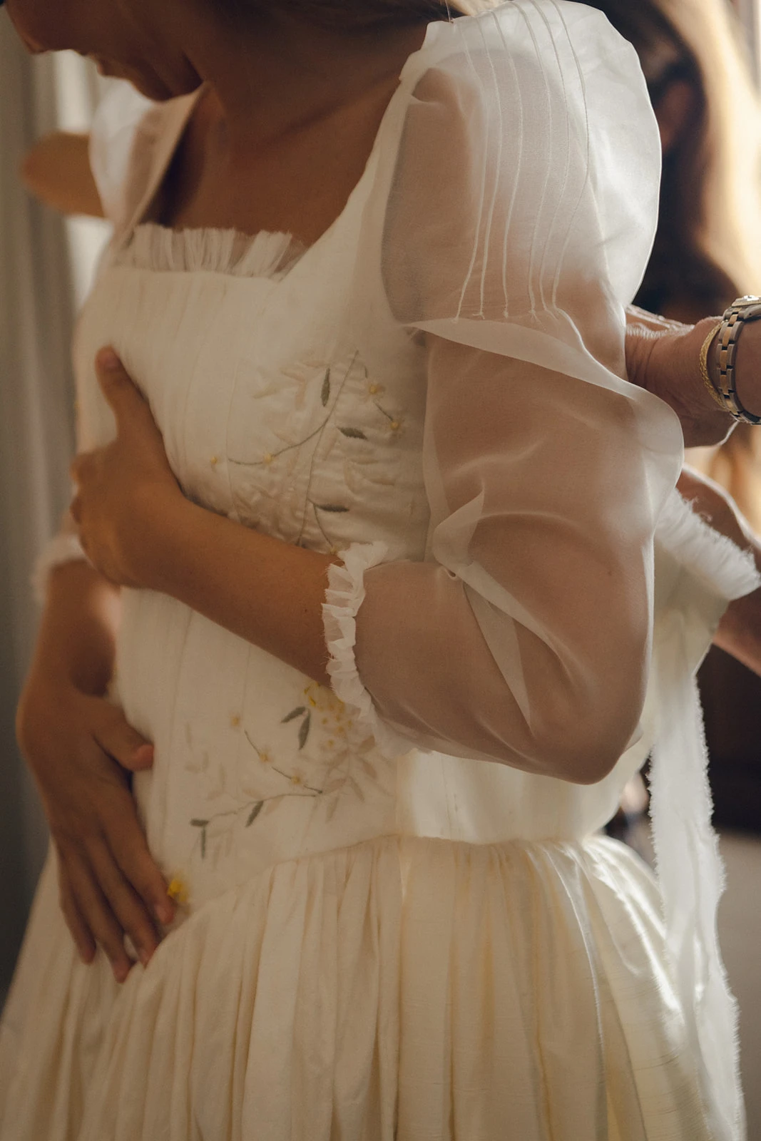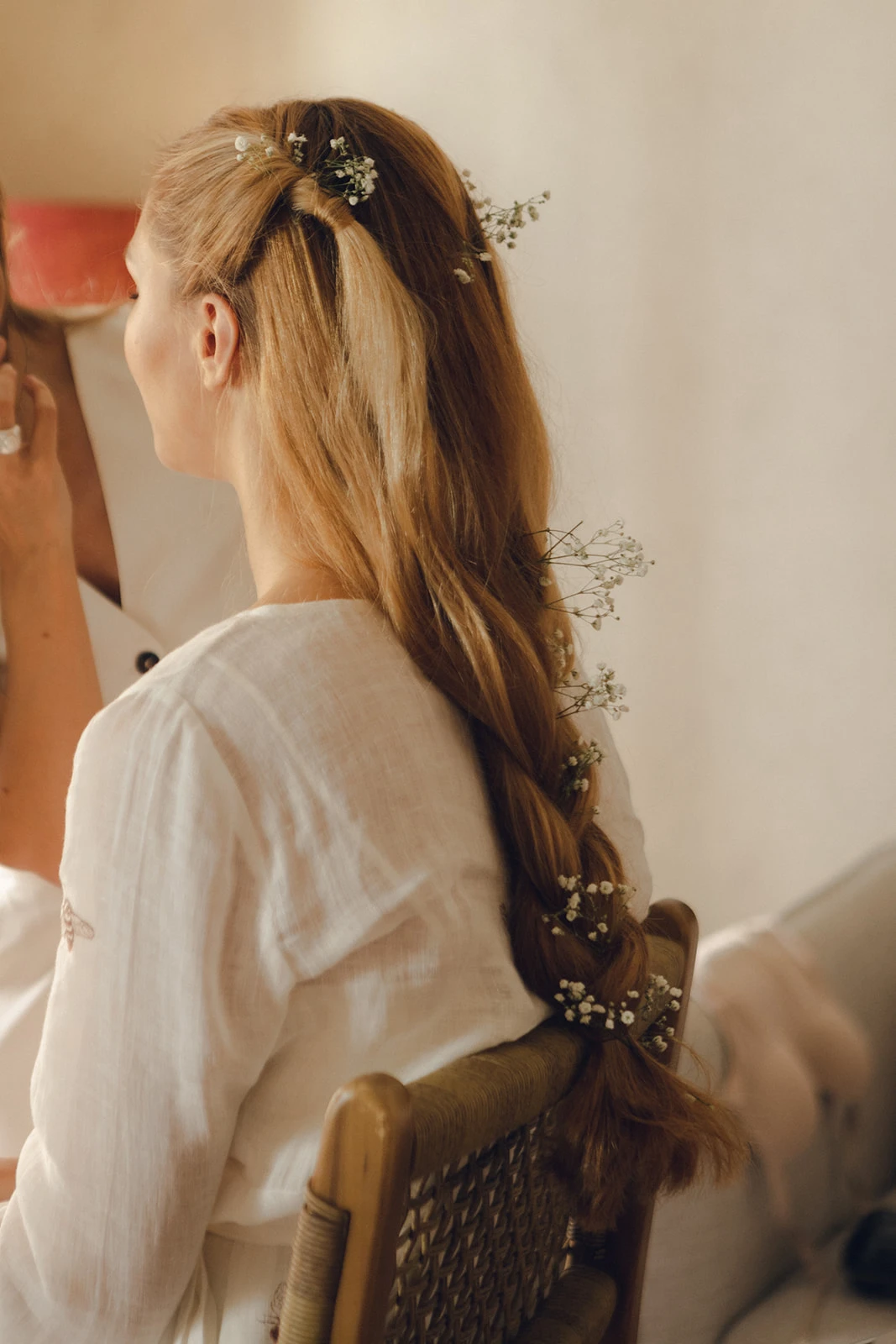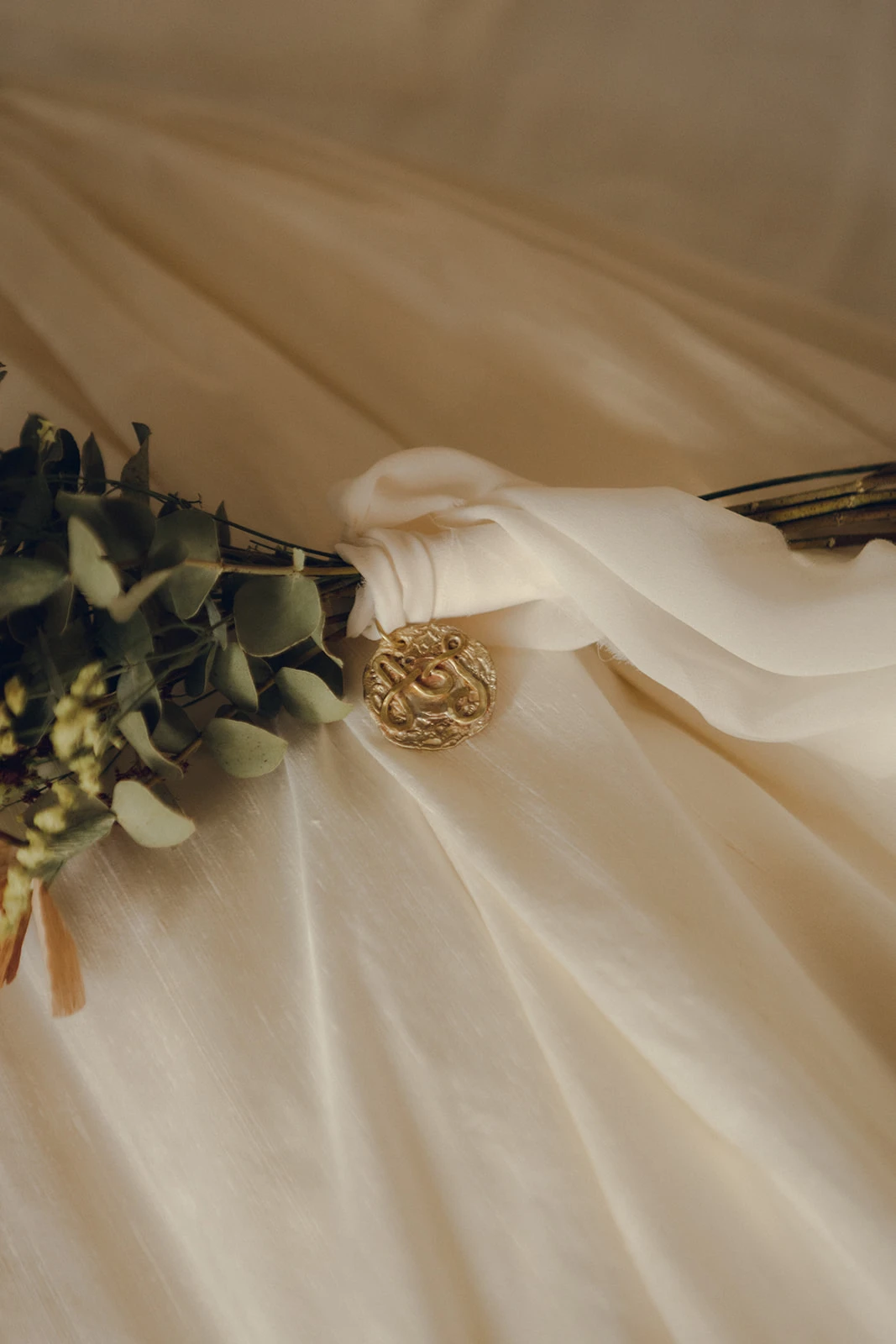 «Para el vestido confié en Claudia Llagostera. Tenía claro que quería un vestido elegante y clásico, pero adaptado a mi personalidad, más bohemia y campestre. Hicimos un híbrido estilo Bridgerton con seda salvaje y bordados de flores y ramitas». Llevaba un velo de seda salvaje, que combinaba perfecto con el peinado que le hizo Francesca Moreno.