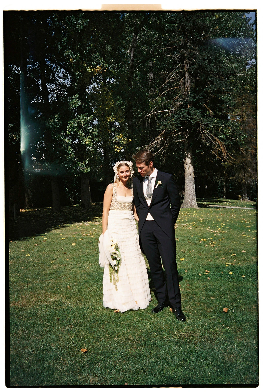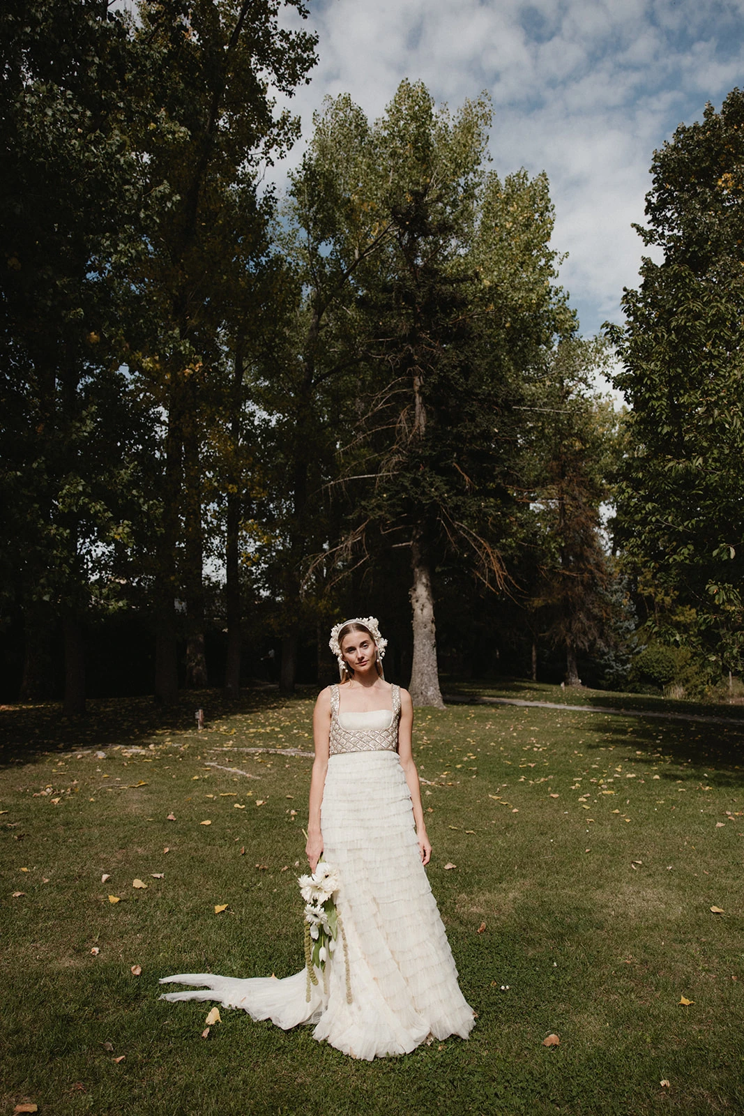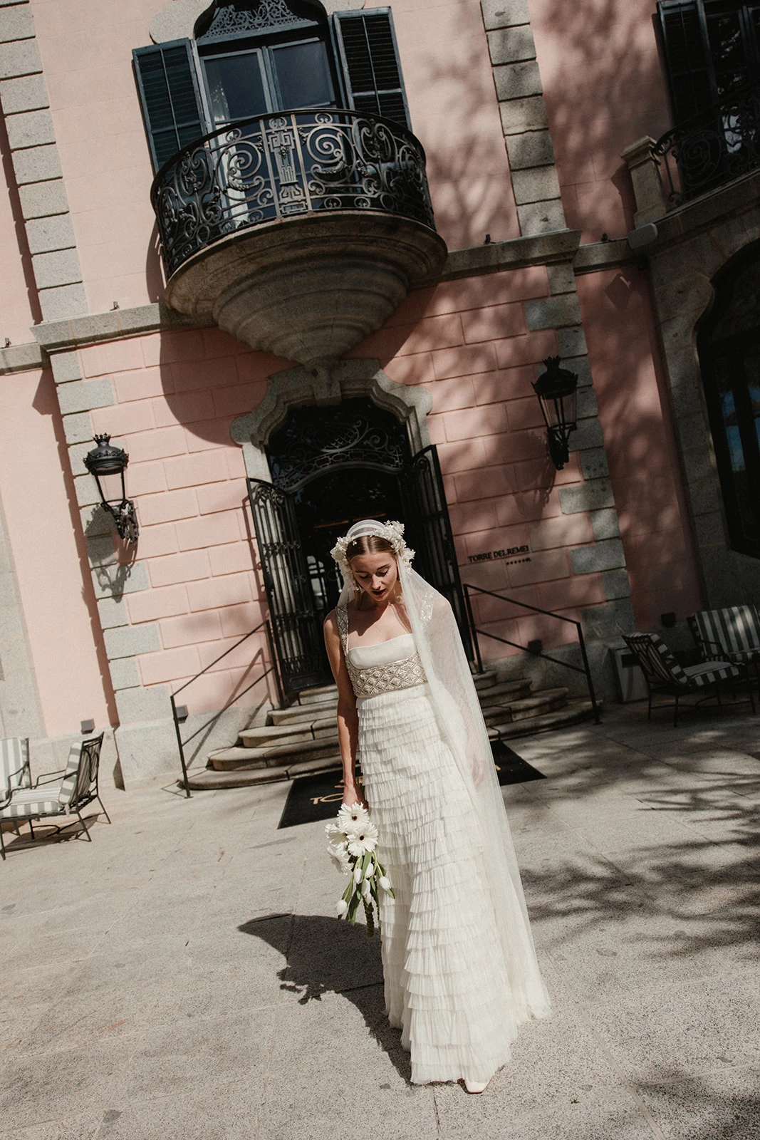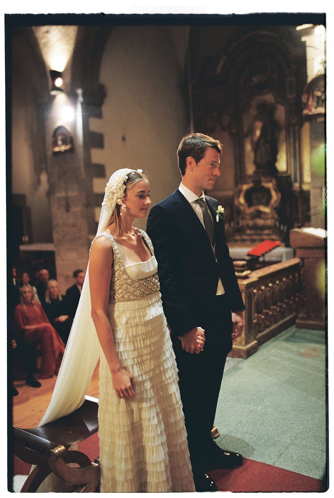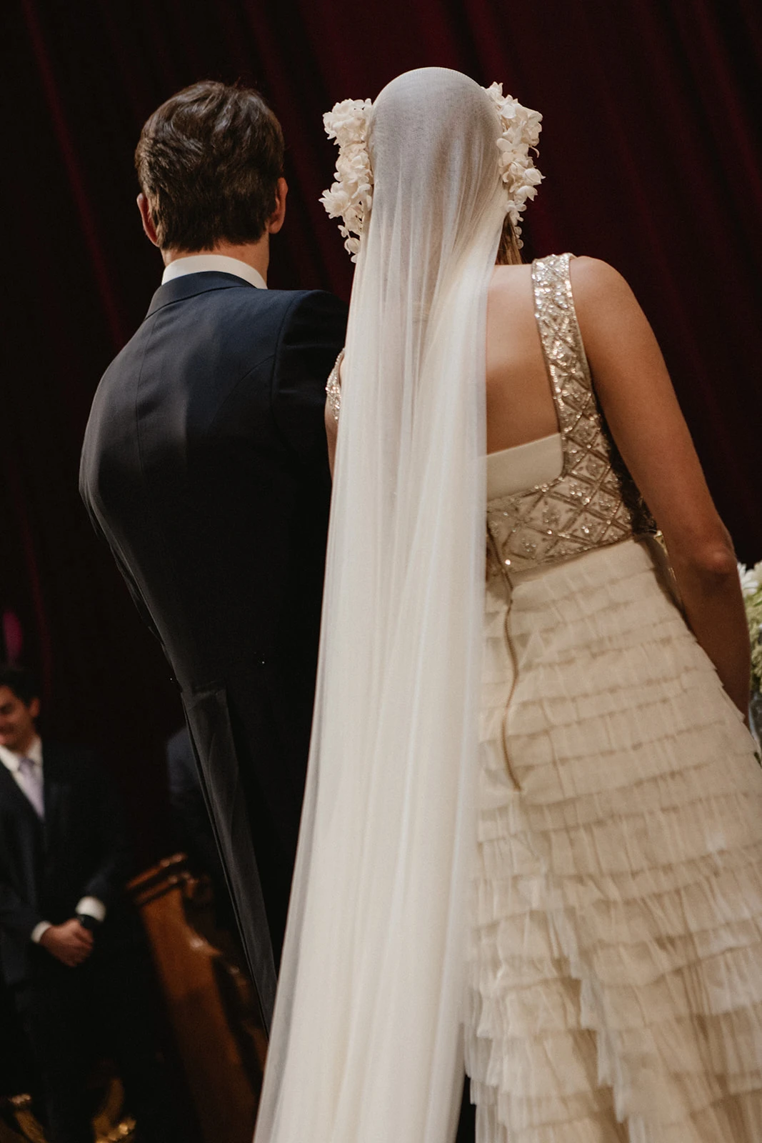 «Cuando conocí a Teresa y Leire, del equipo Helbig, vi muy claro que tenían que ser ellas quienes diseñaran mi vestido. Quería algo que respirara aire nostálgico, casi renacentista, pero a la vez moderno. Fue entonces cuando construimos juntas un dos piezas formado por un chaleco bordado con cristales y un vestido de tul de seda». Siguiendo los consejos de la diseñadora, esto lo combinó con un peinado que incluía velo y diadema.