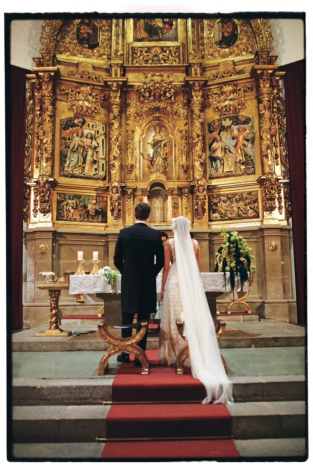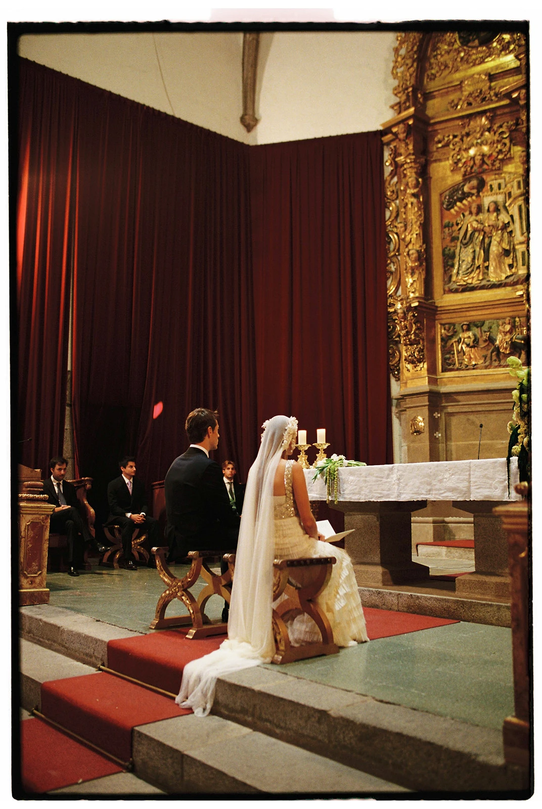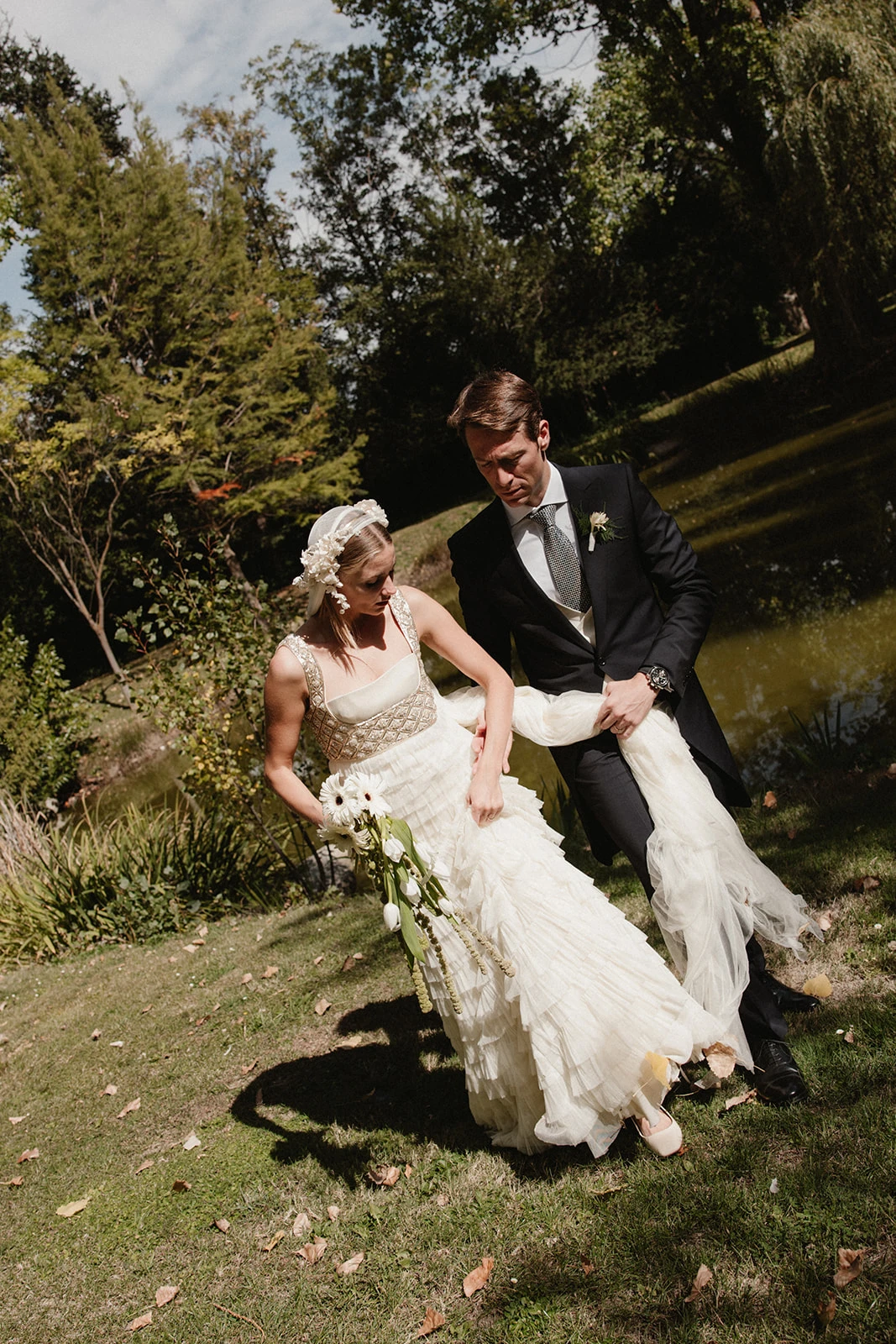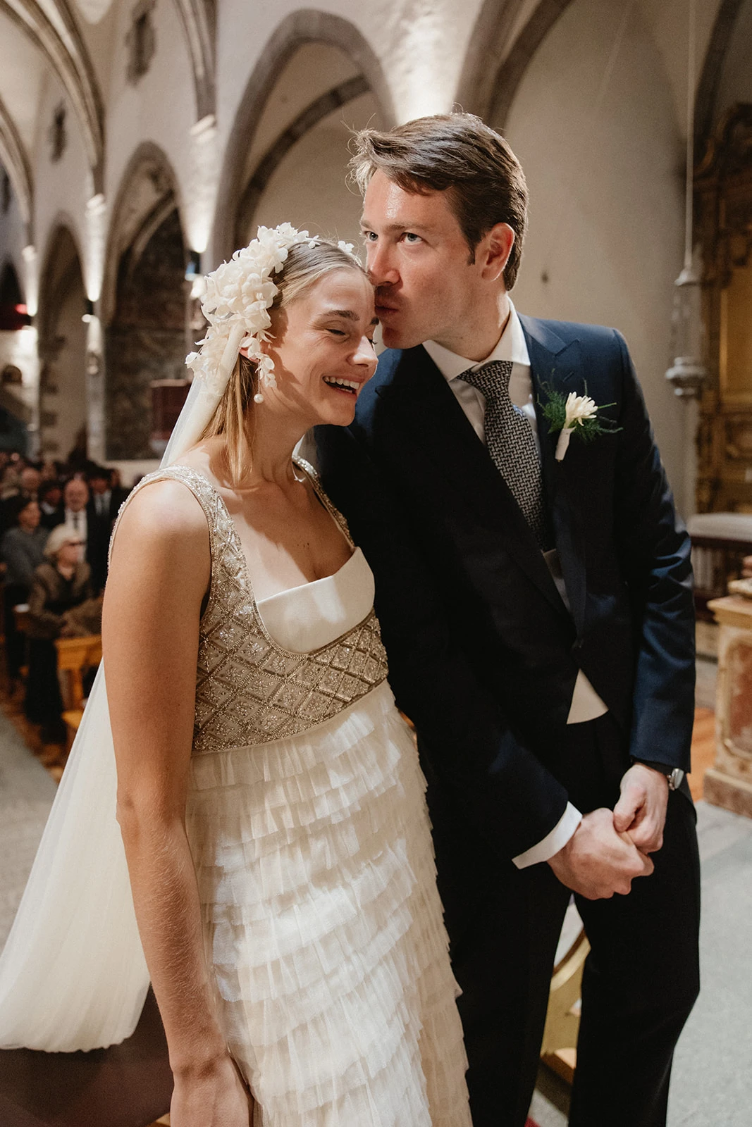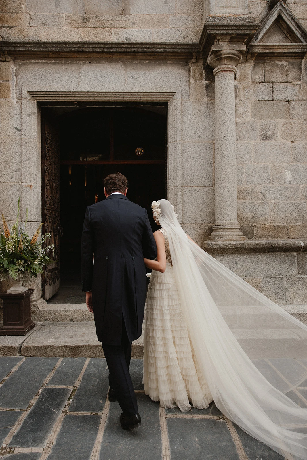 «Cuando conocí a Teresa y Leire, del equipo Helbig, vi muy claro que tenían que ser ellas quienes diseñaran mi vestido. Quería algo que respirara aire nostálgico, casi renacentista, pero a la vez moderno. Fue entonces cuando construimos juntas un dos piezas formado por un chaleco bordado con cristales y un vestido de tul de seda». Siguiendo los consejos de la diseñadora, esto lo combinó con un peinado que incluía velo y diadema.