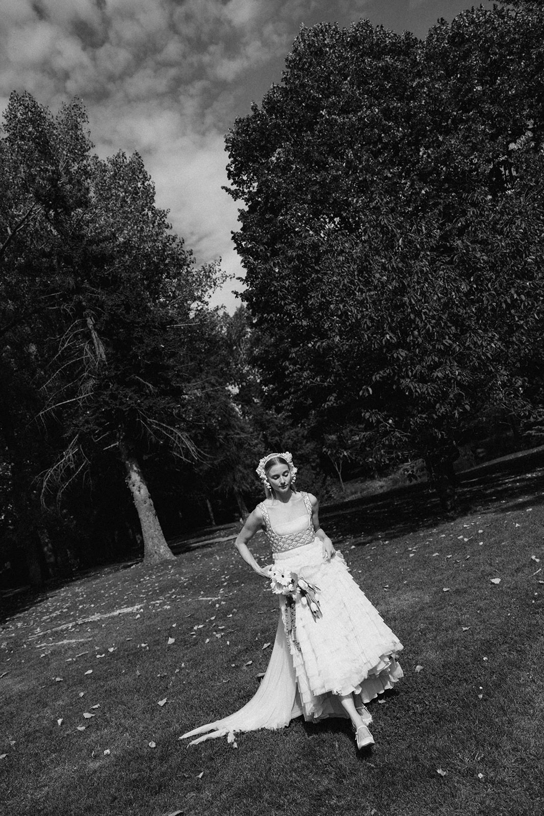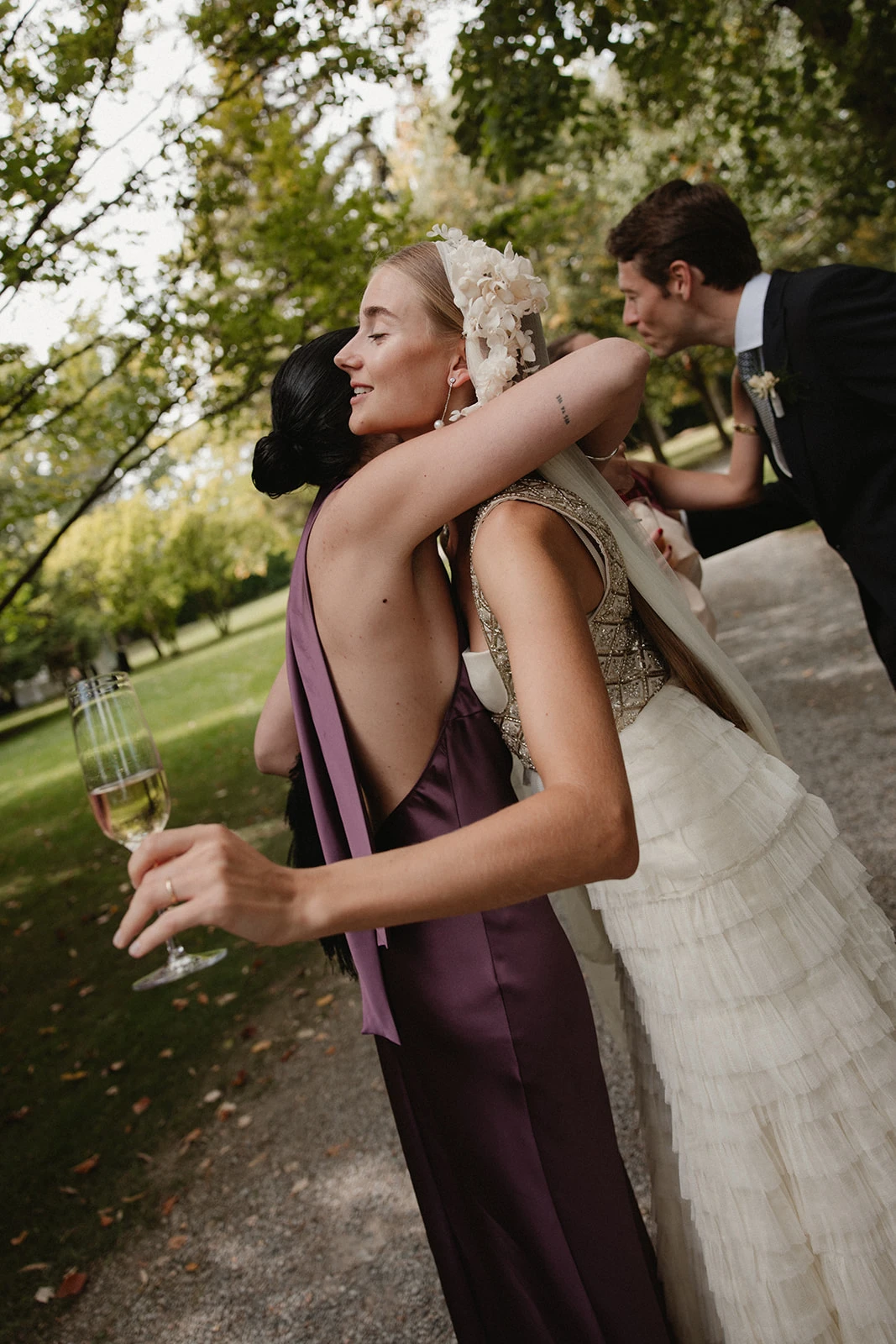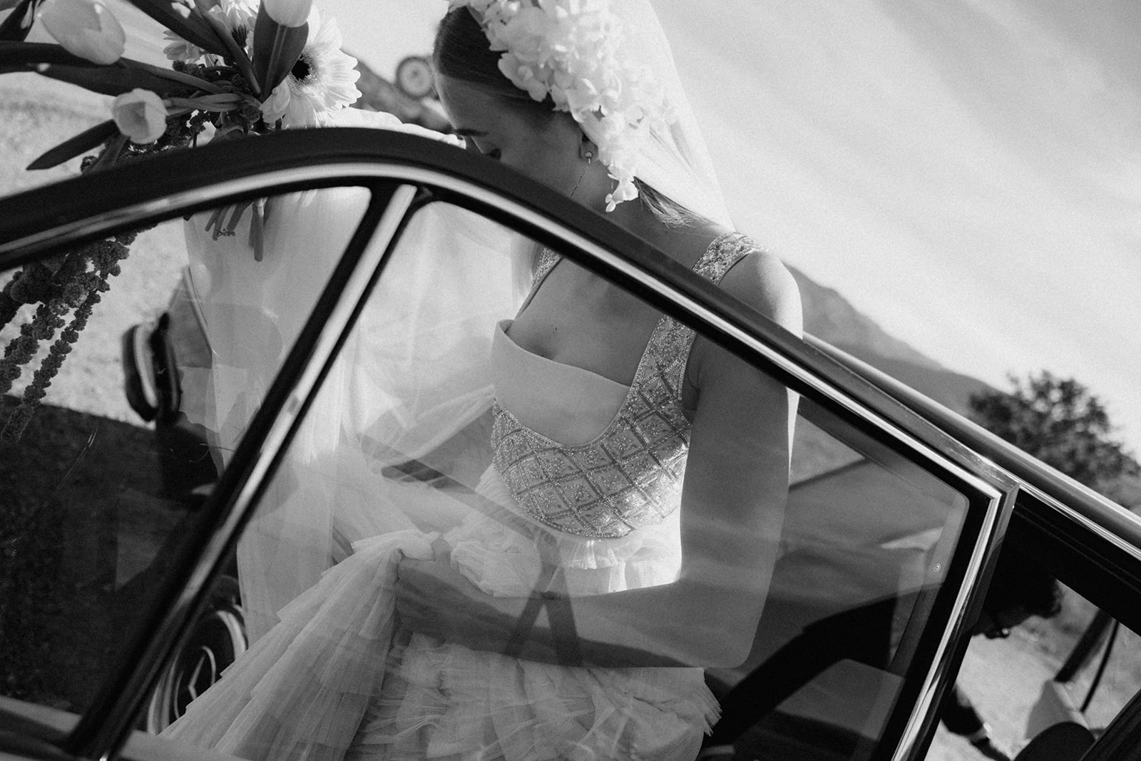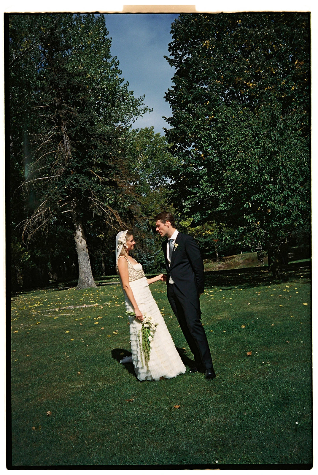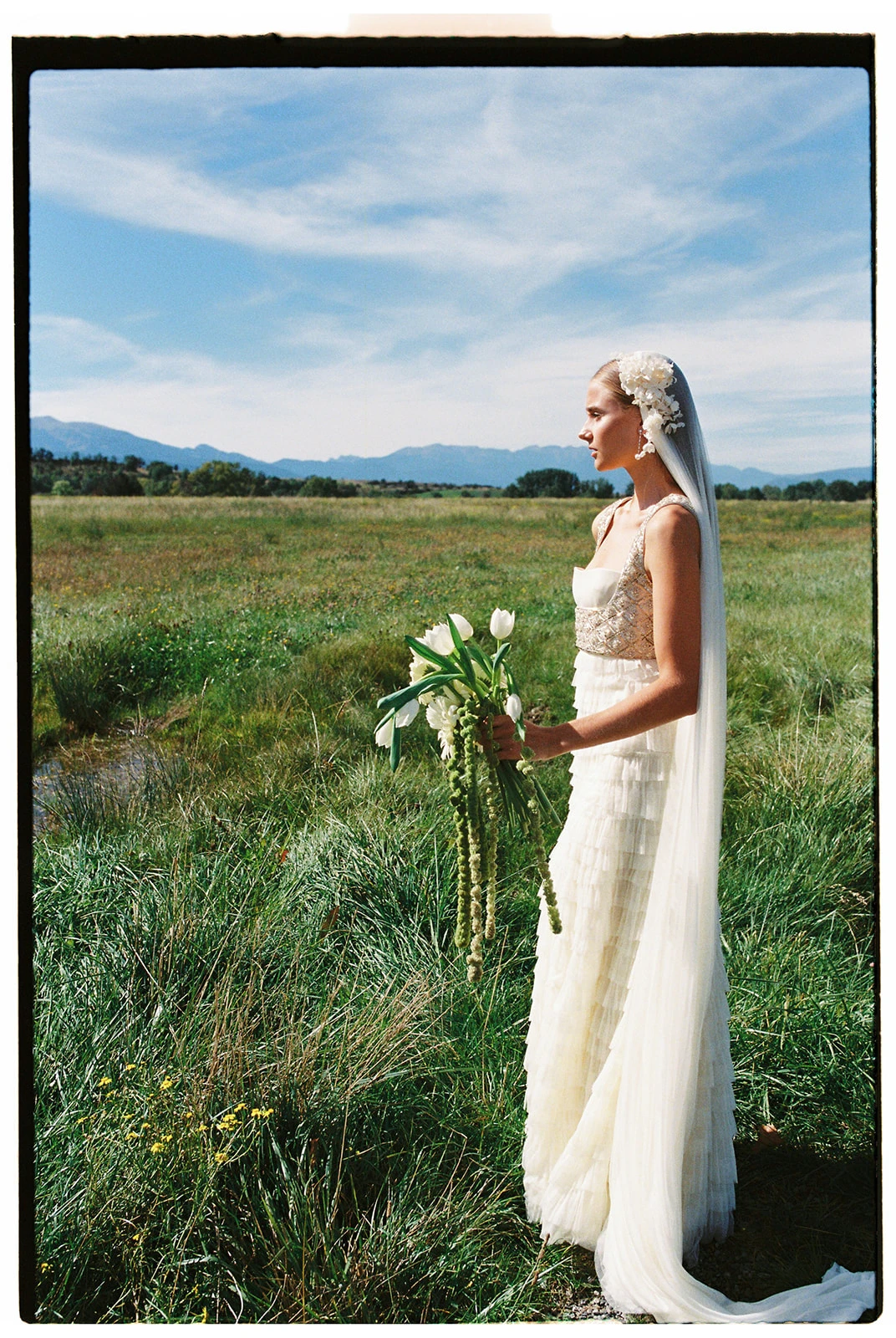 «Cuando conocí a Teresa y Leire, del equipo Helbig, vi muy claro que tenían que ser ellas quienes diseñaran mi vestido. Quería algo que respirara aire nostálgico, casi renacentista, pero a la vez moderno. Fue entonces cuando construimos juntas un dos piezas formado por un chaleco bordado con cristales y un vestido de tul de seda». Siguiendo los consejos de la diseñadora, esto lo combinó con un peinado que incluía velo y diadema.