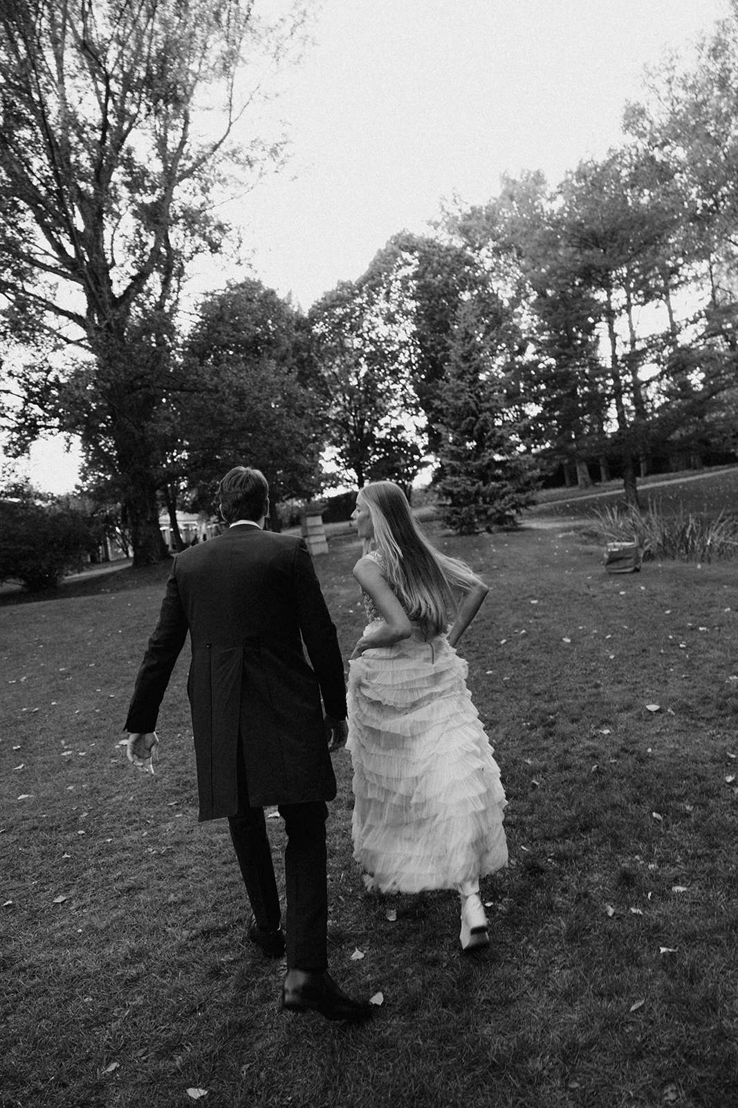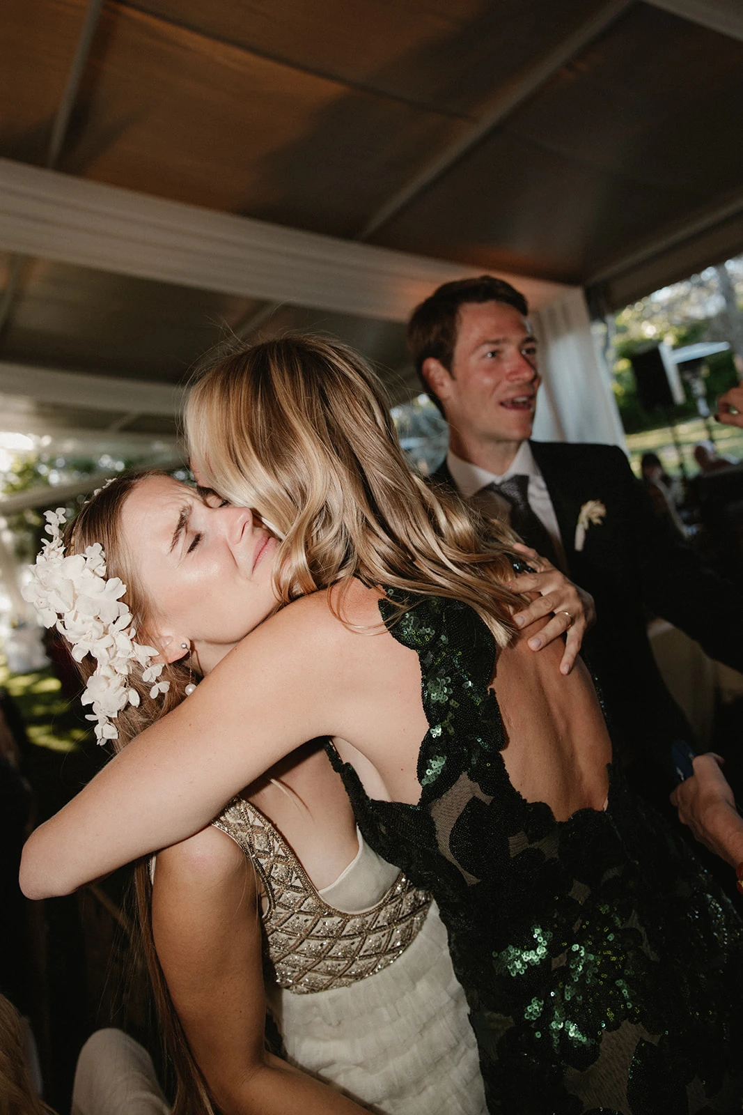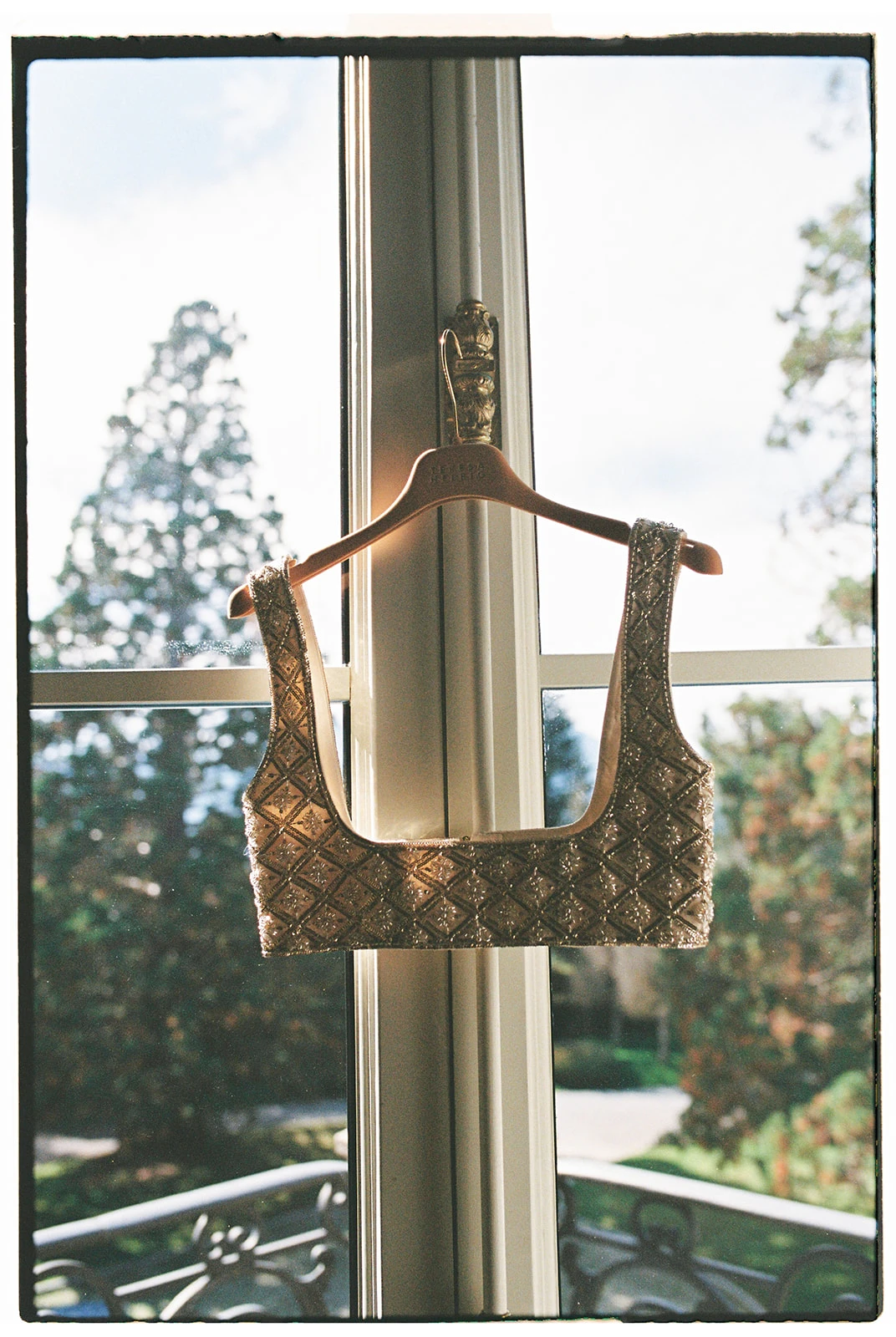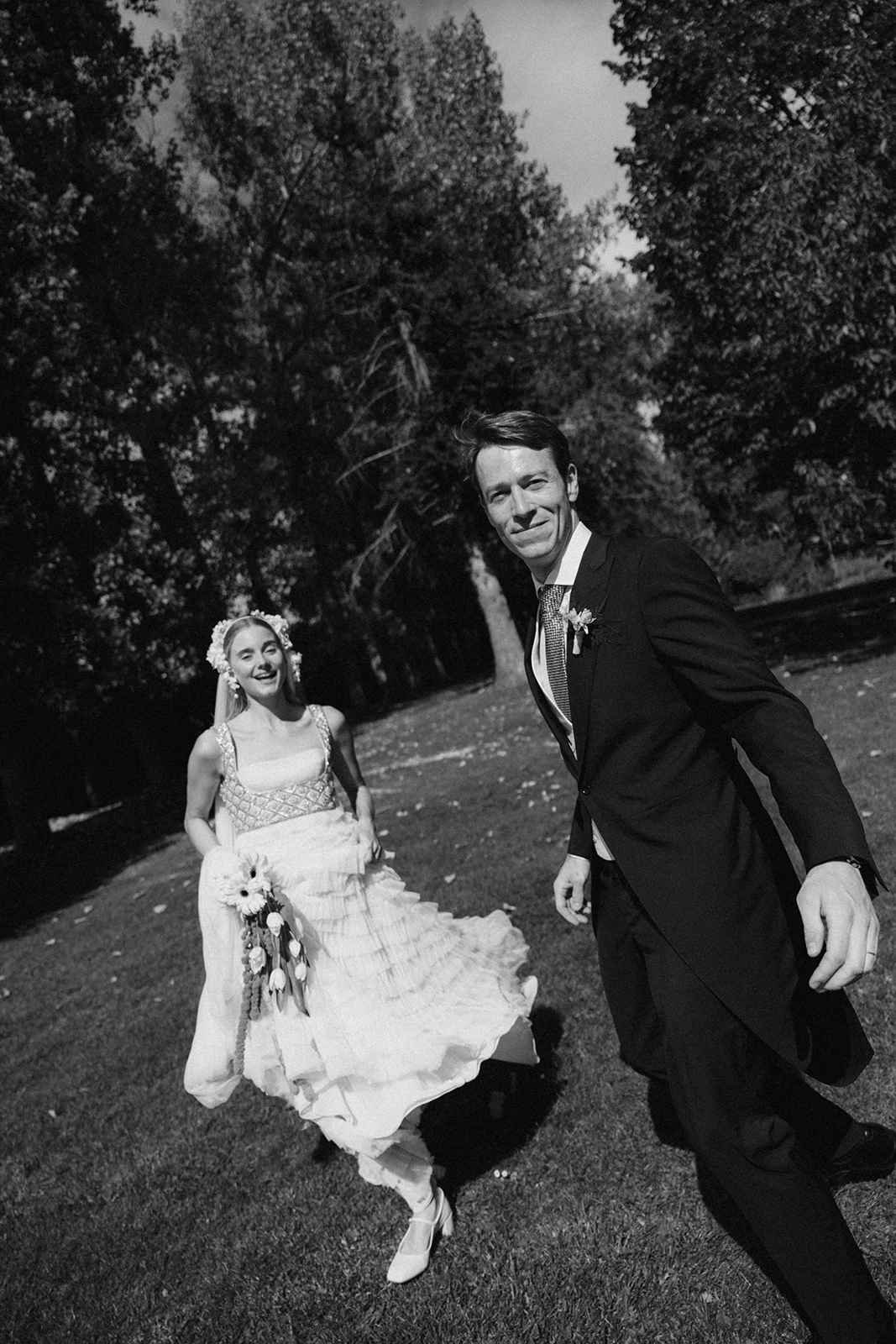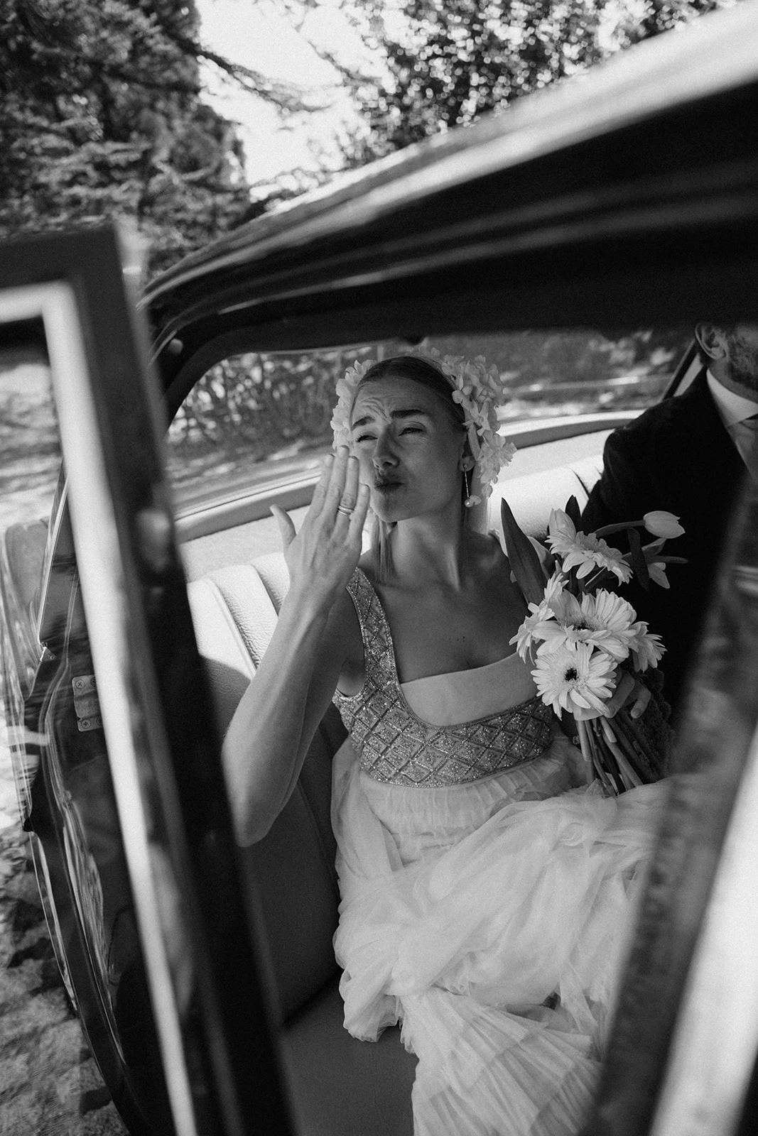 «Cuando conocí a Teresa y Leire, del equipo Helbig, vi muy claro que tenían que ser ellas quienes diseñaran mi vestido. Quería algo que respirara aire nostálgico, casi renacentista, pero a la vez moderno. Fue entonces cuando construimos juntas un dos piezas formado por un chaleco bordado con cristales y un vestido de tul de seda». Siguiendo los consejos de la diseñadora, esto lo combinó con un peinado que incluía velo y diadema.