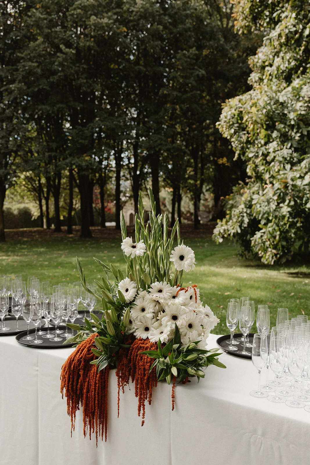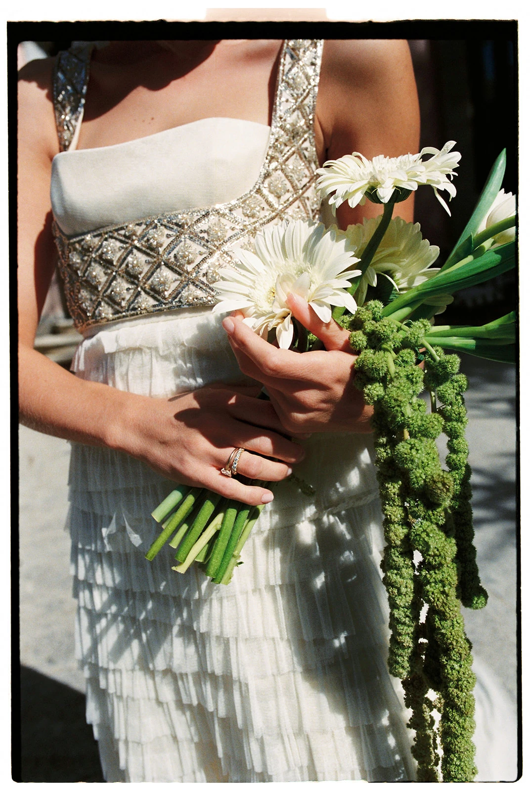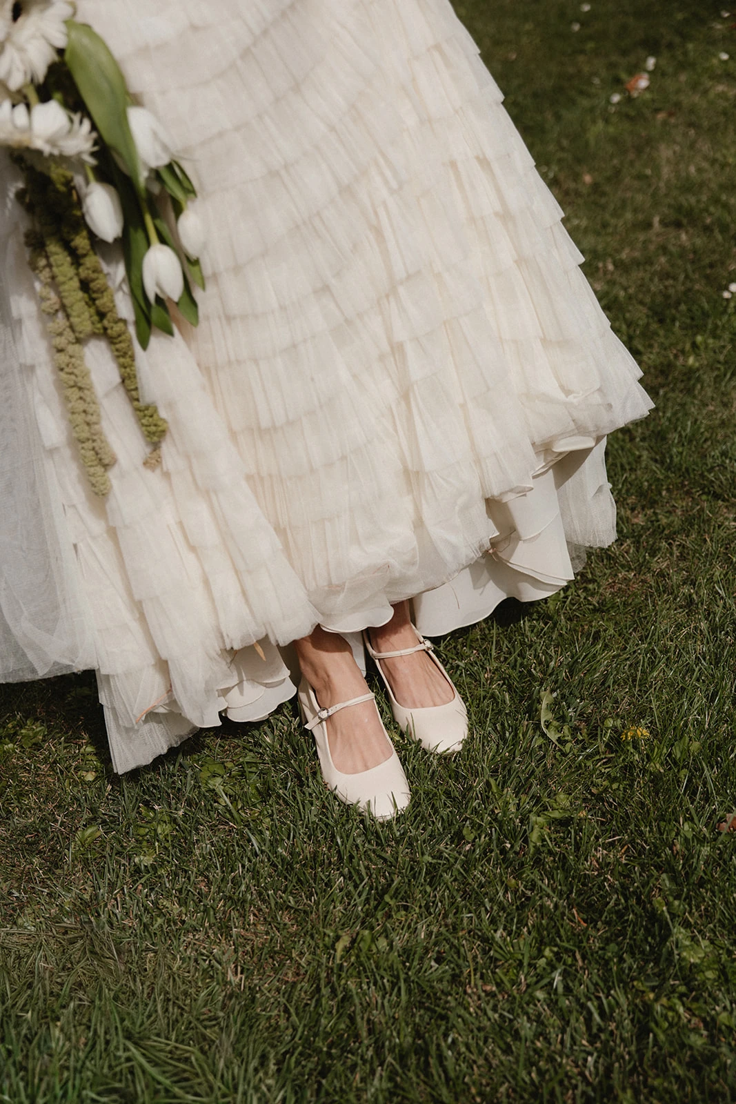 Las decisiones florales se las confió a Manuela de Gang and the Wool. «Creó mi ramo con tulipanes y gerberas blancas con centro oscuro y amaranthus».