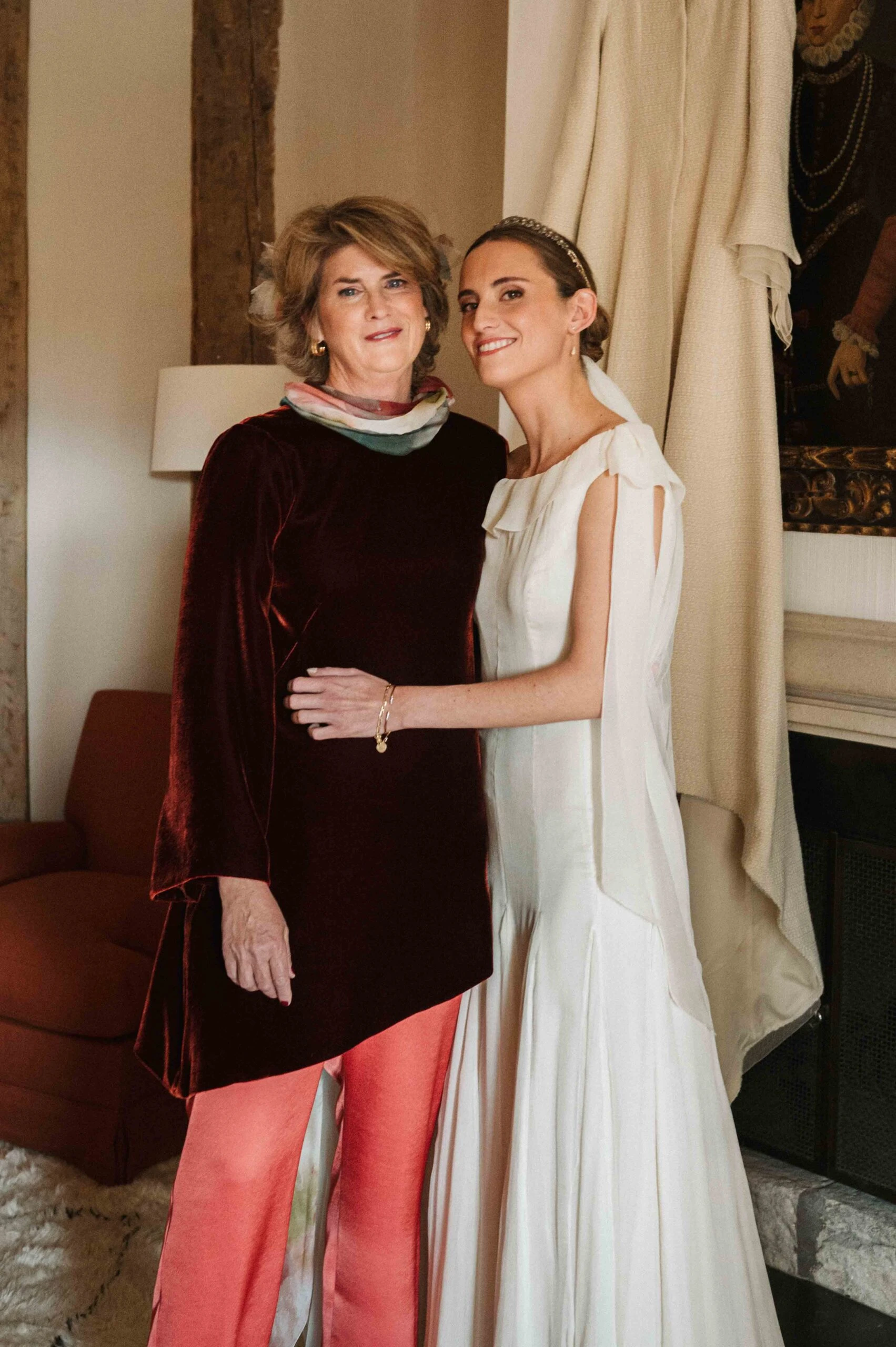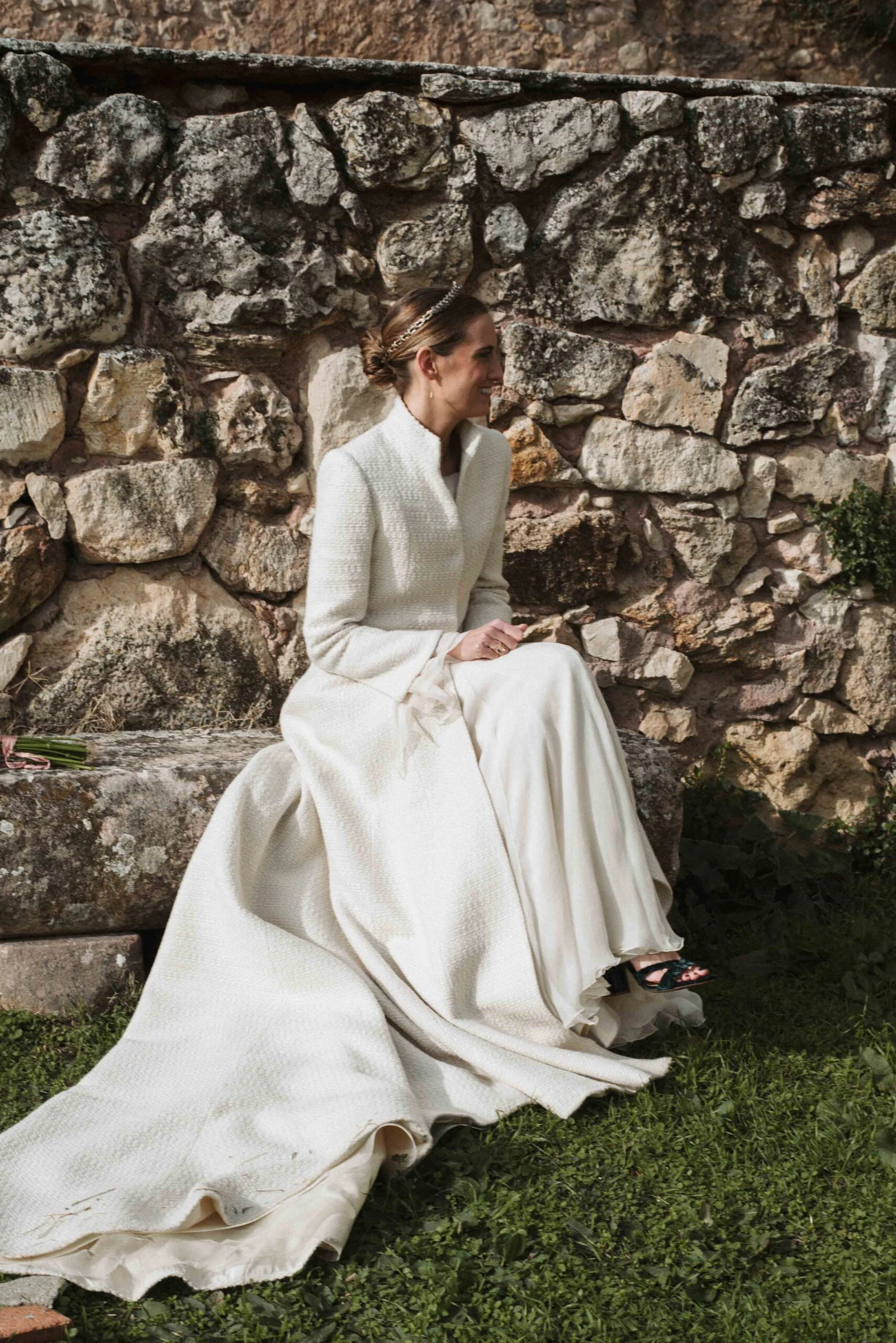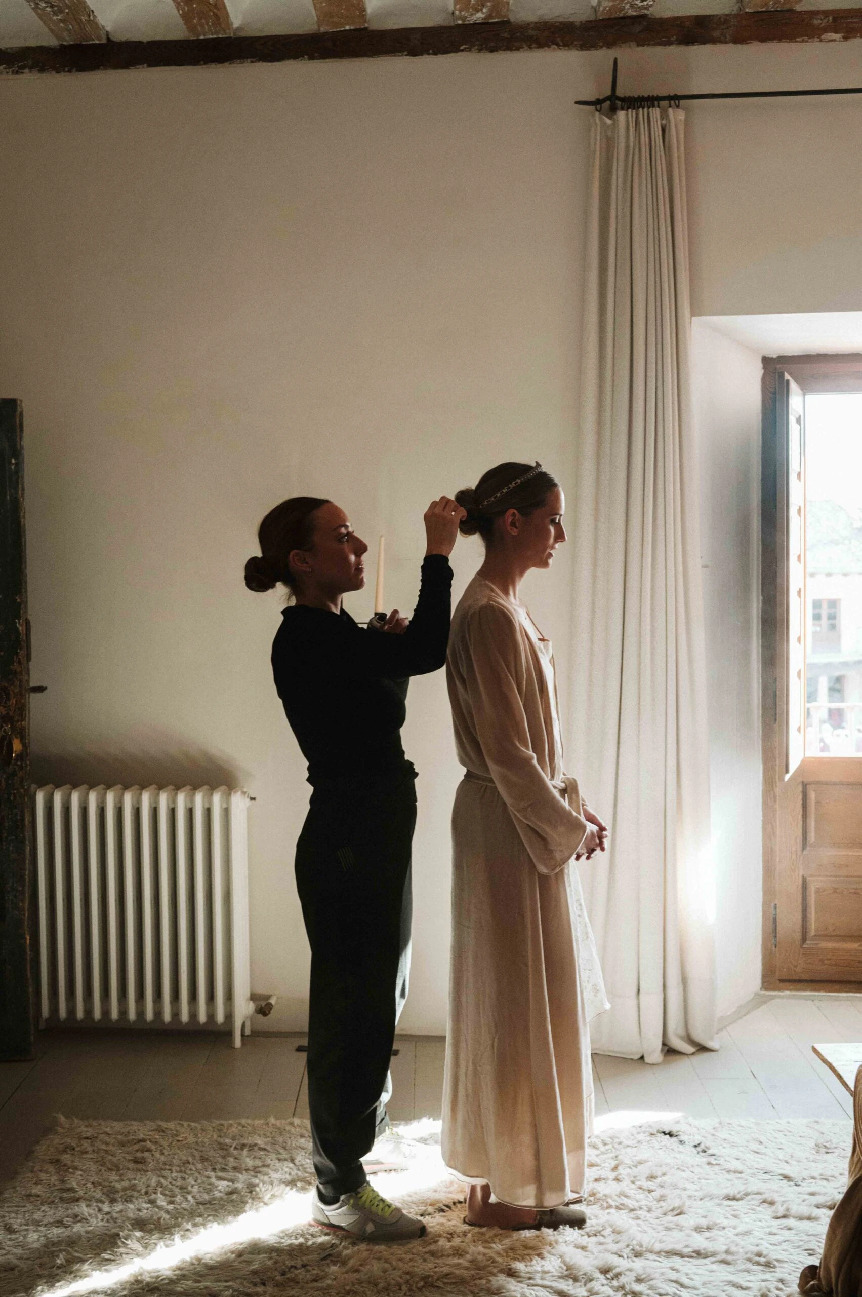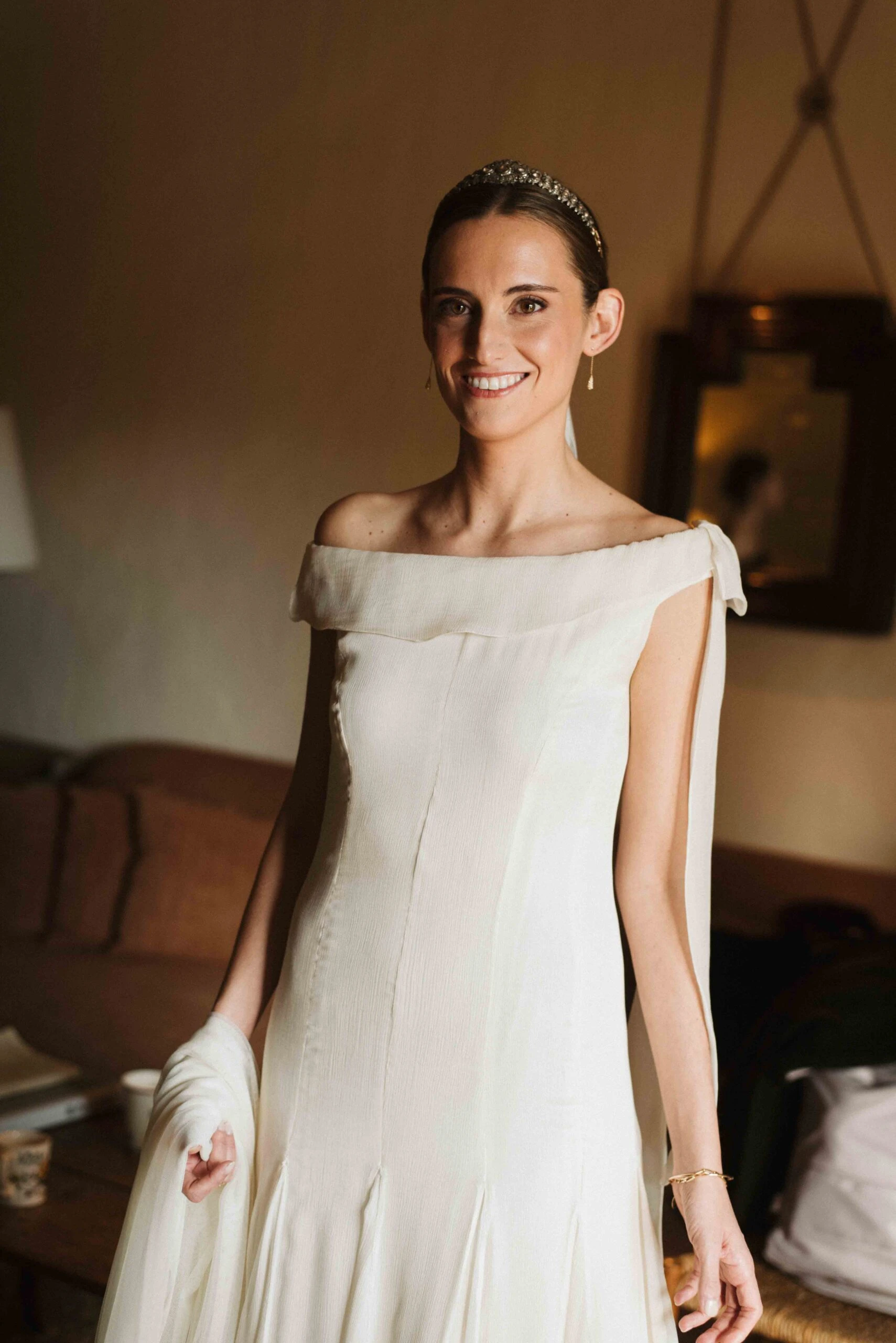 «El maquillaje me lo hizo Lola Bernardo y el peinado Eva Vera, ambas del mismo equipo. Me encantaban los clean looks que hacían para las bodas y la prueba salió genial. Esto lo combiné con una corona/diadema que me dejó mi suegra, una antigua pulsera india del siglo XII habilitada para ser más larga por el escultor y artista Onieva». La bata era de Tba y los zapatos de Castañer x Casilda se casa