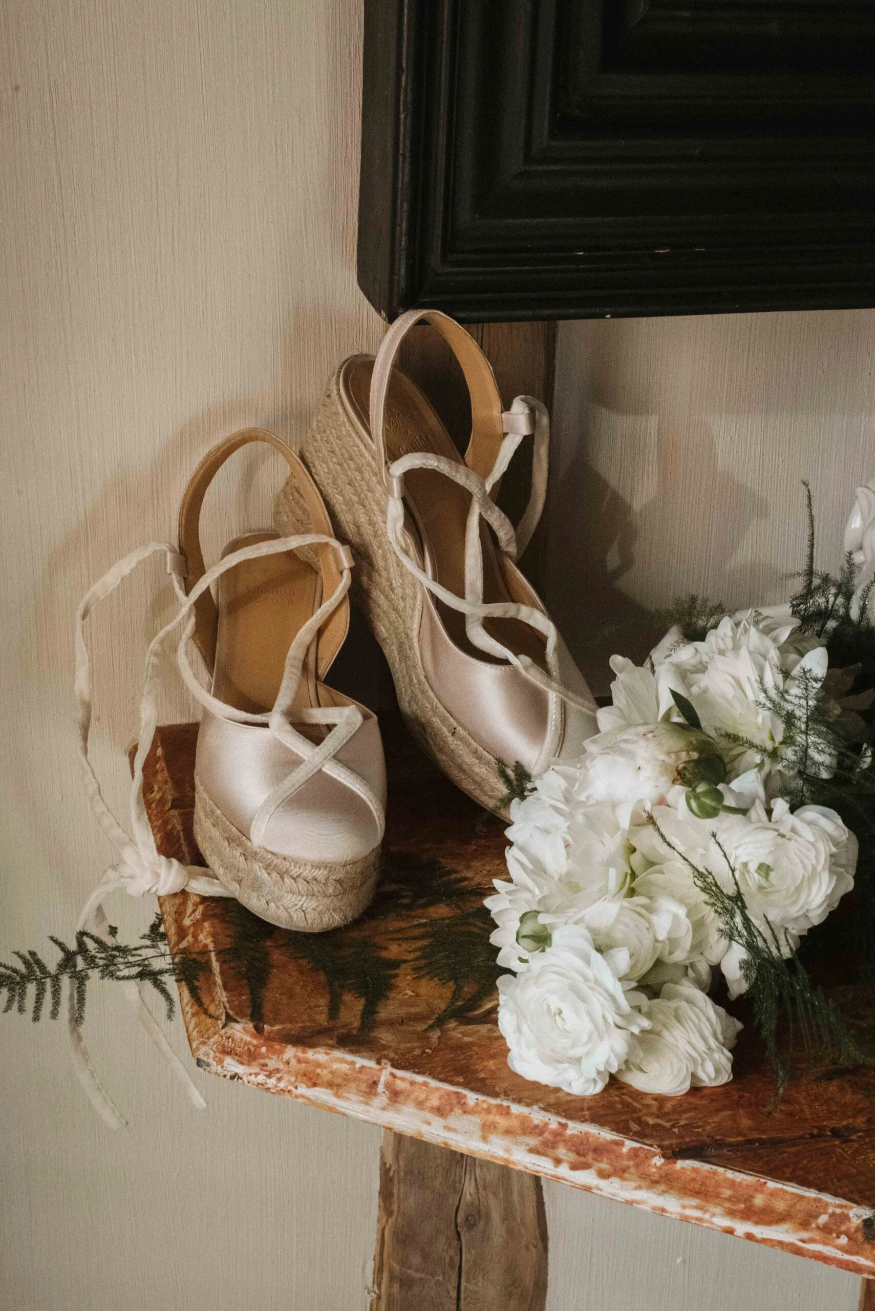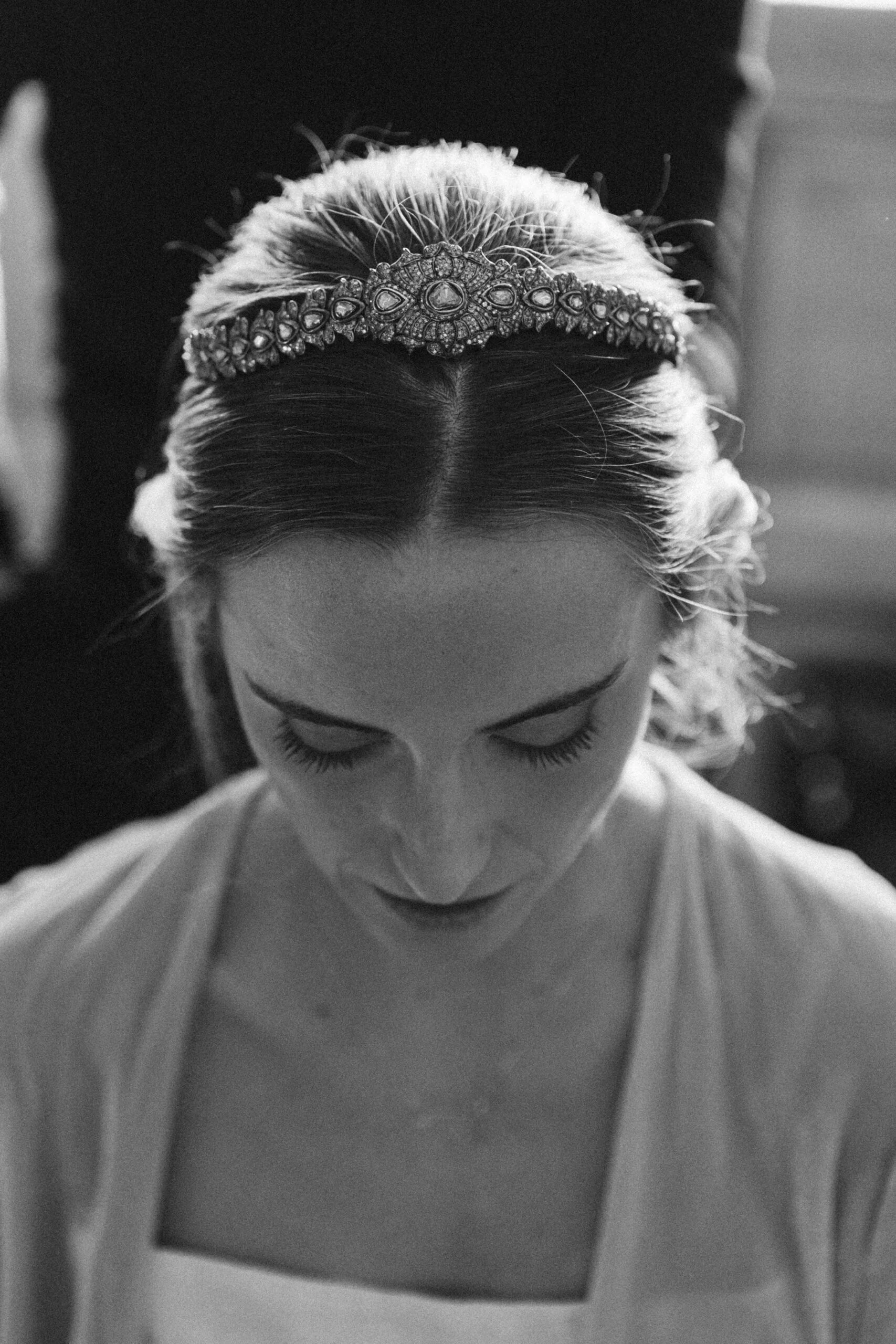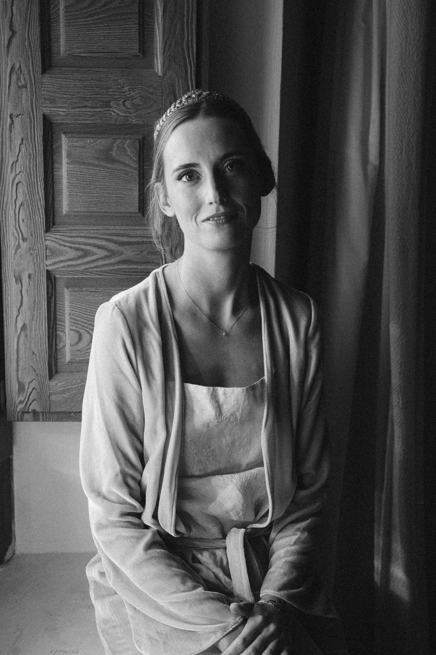 «El maquillaje me lo hizo Lola Bernardo y el peinado Eva Vera, ambas del mismo equipo. Me encantaban los clean looks que hacían para las bodas y la prueba salió genial. Esto lo combiné con una corona/diadema que me dejó mi suegra, una antigua pulsera india del siglo XII habilitada para ser más larga por el escultor y artista Onieva». La bata era de Tba y los zapatos de Castañer x Casilda se casa