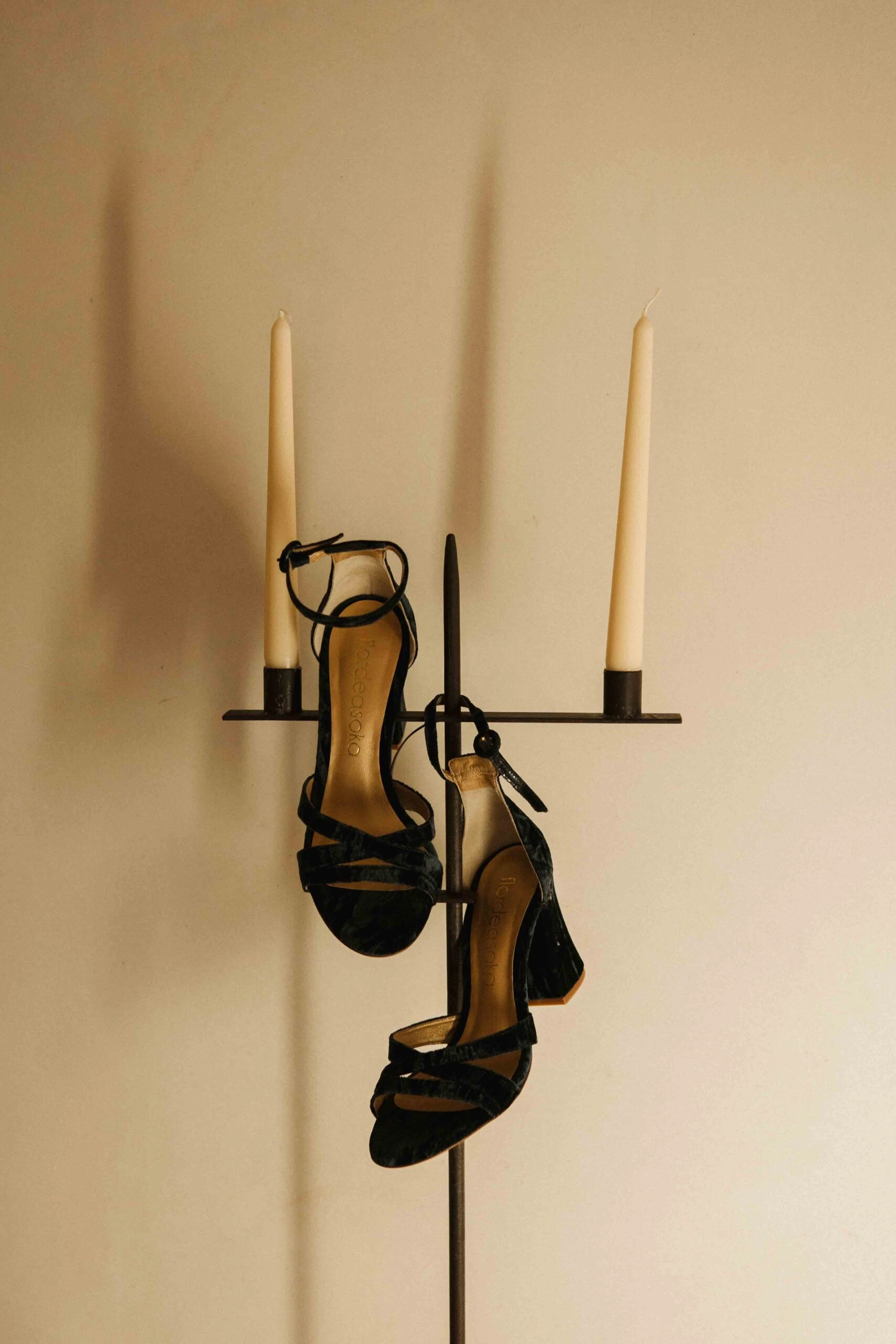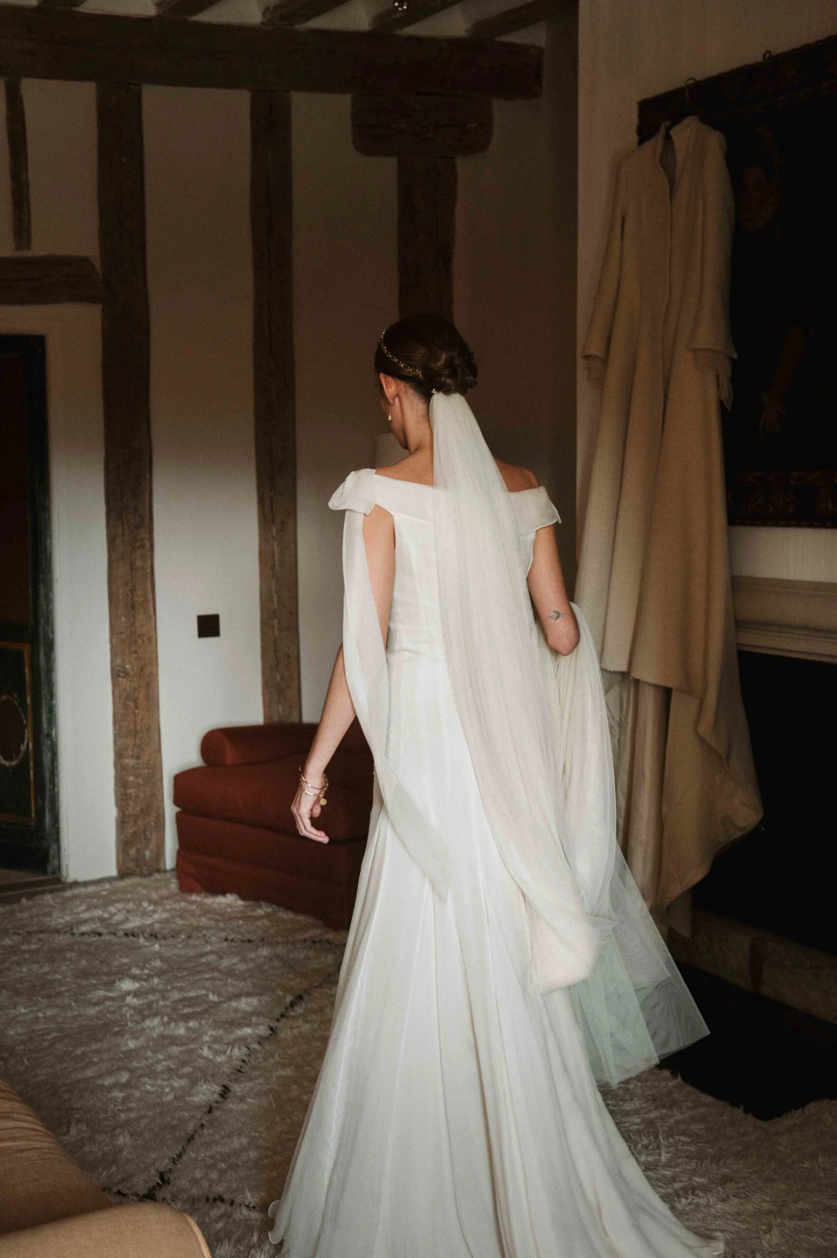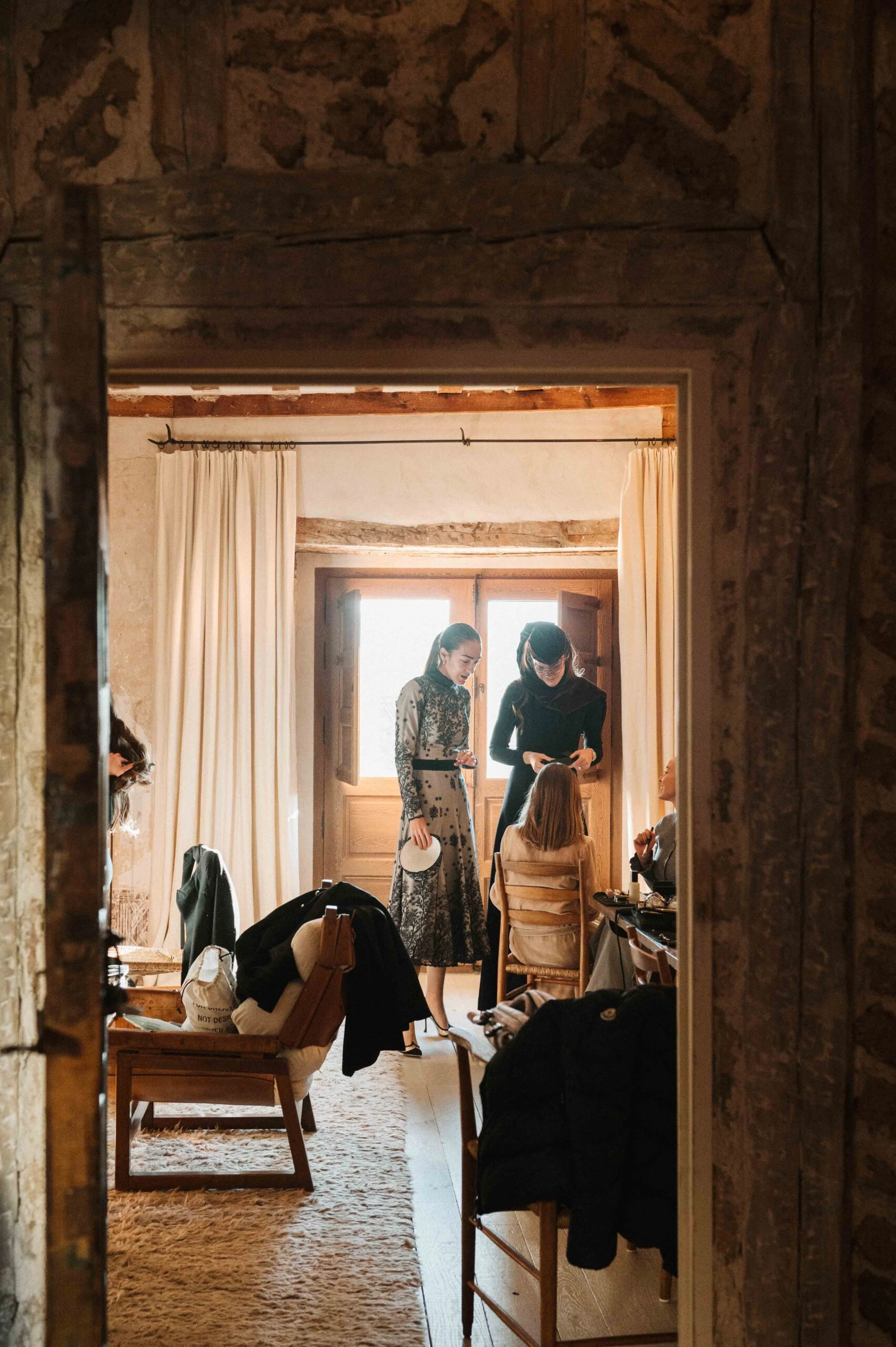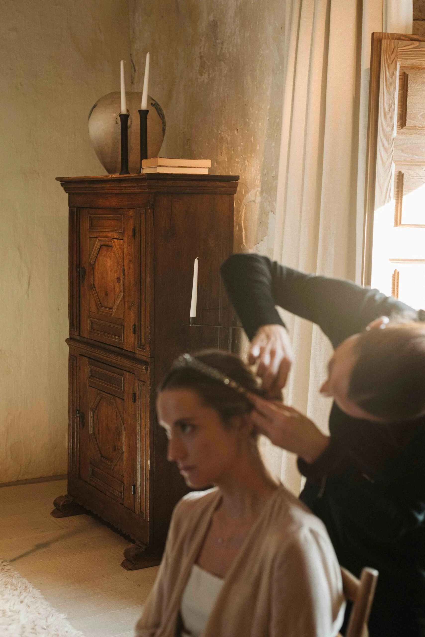 «El maquillaje me lo hizo Lola Bernardo y el peinado Eva Vera, ambas del mismo equipo. Me encantaban los clean looks que hacían para las bodas y la prueba salió genial. Esto lo combiné con una corona/diadema que me dejó mi suegra, una antigua pulsera india del siglo XII habilitada para ser más larga por el escultor y artista Onieva». La bata era de Tba y los zapatos de Castañer x Casilda se casa