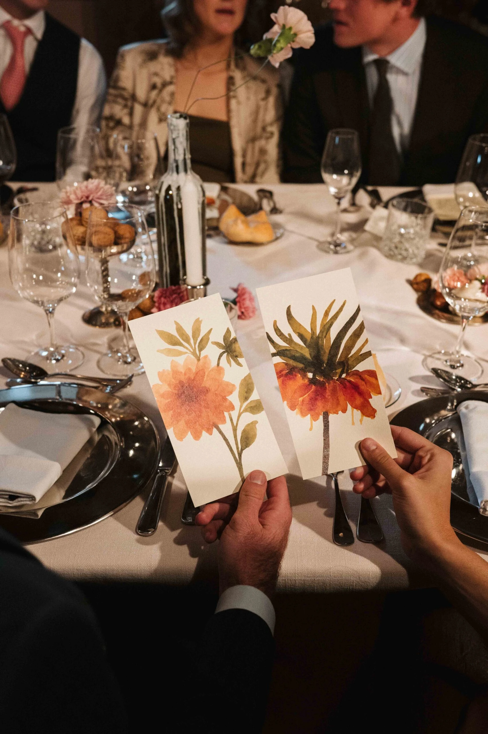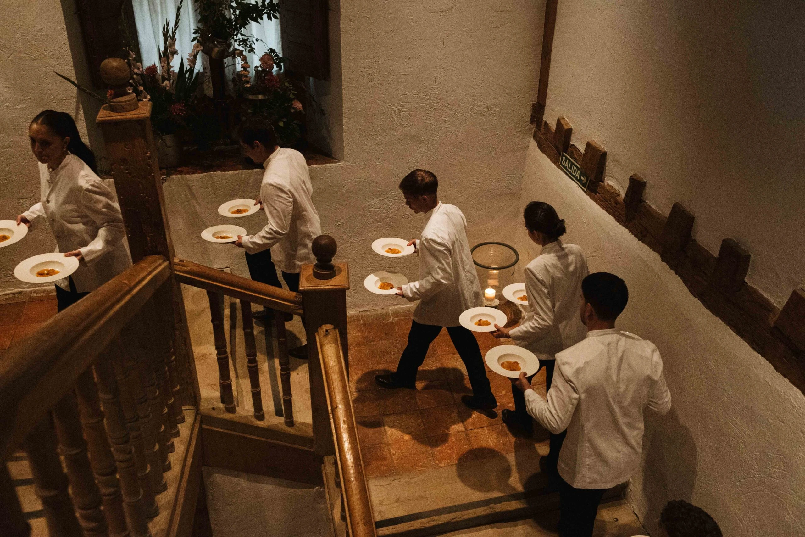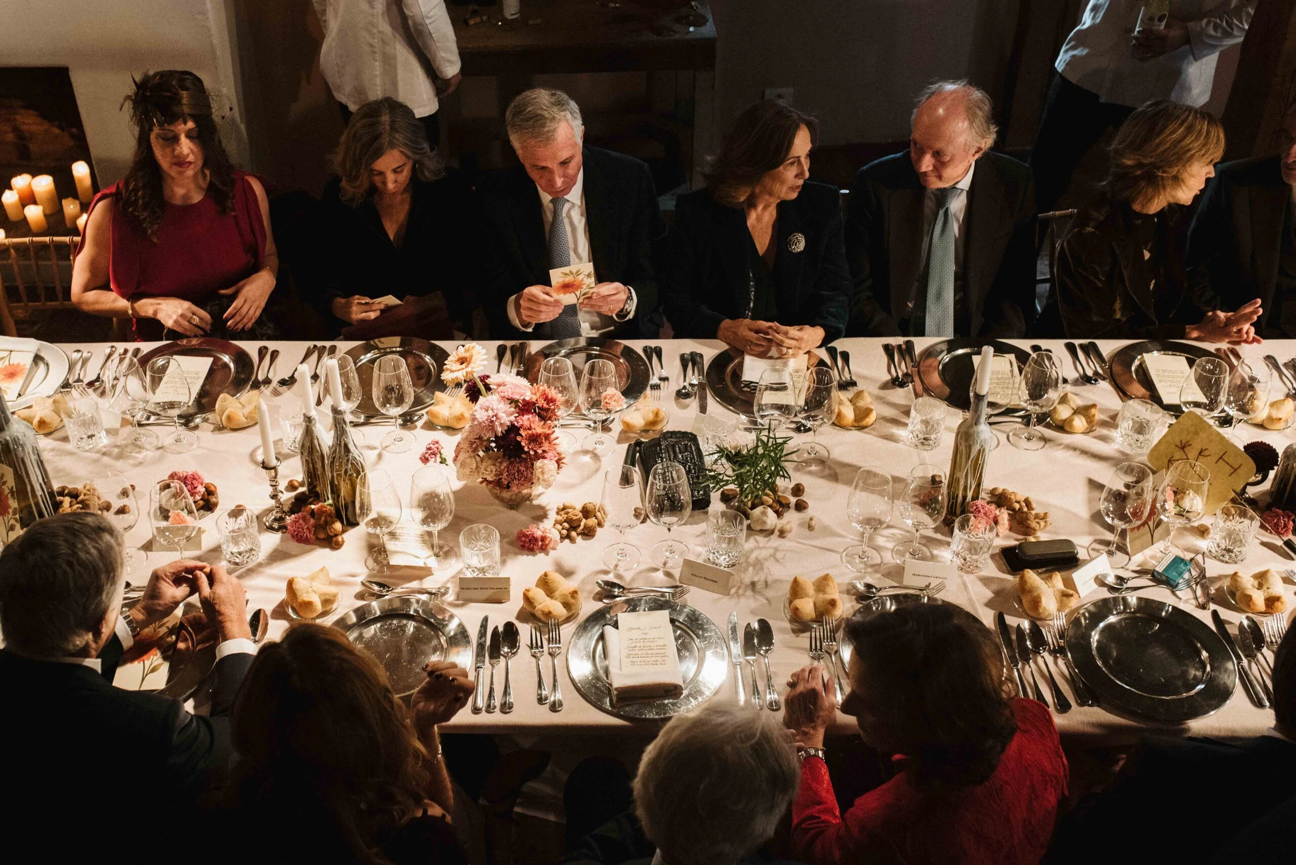 Del catering se encargó Samantha Vallejo-Nágera. «Los meseros y el seating plan los hice yo junto a Alicia Alonso, los menús los hizo mi amigo y compañero de trabajo Menez y las acuarelas mi hermana Ana. Las invitaciones y misales llevaban dibujos de mi padre. Esto lo imprimí en Relieves Heysa y las invitaciones las formatearon e imprimieron en El Tintero».