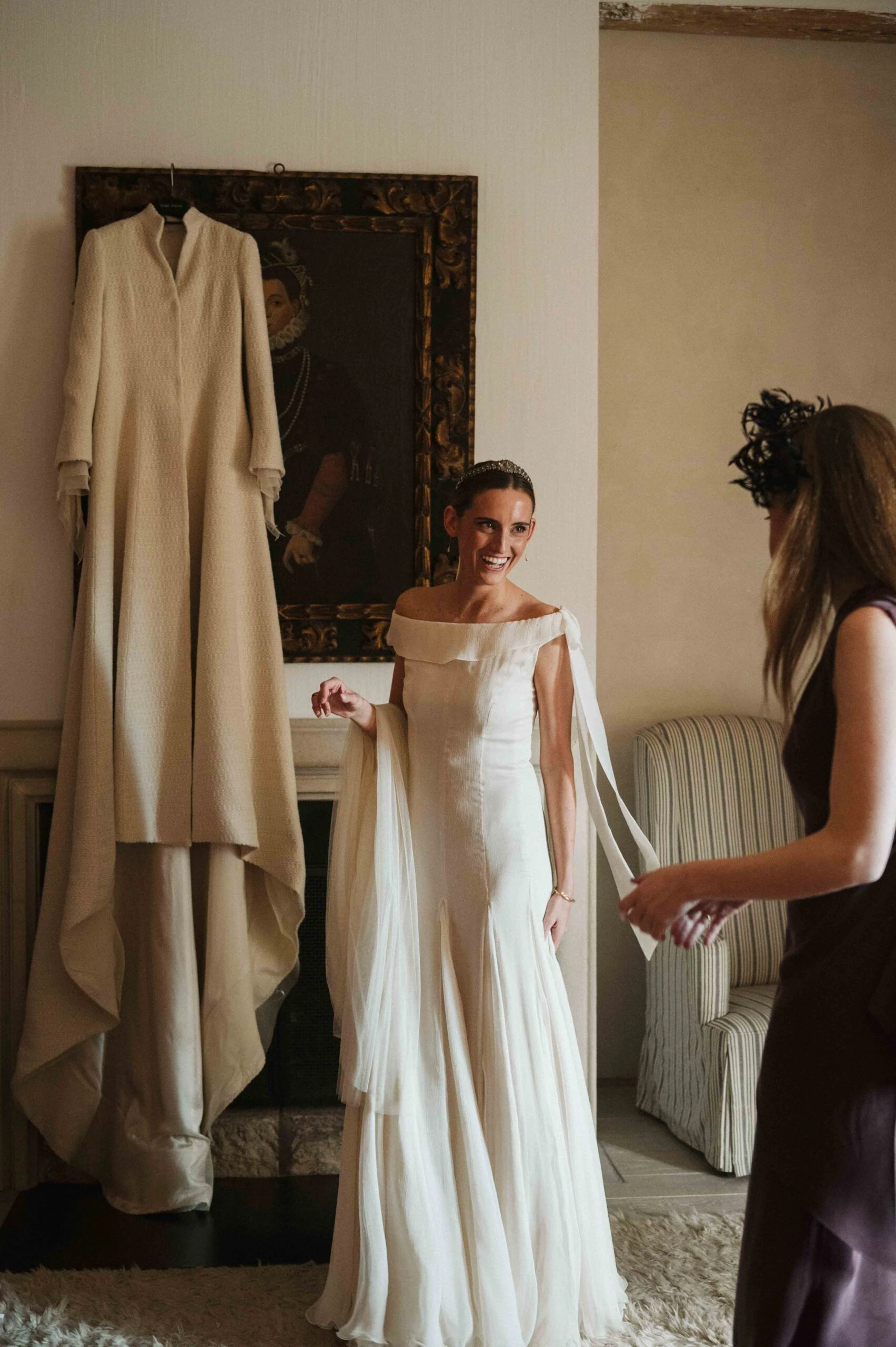 Desde que Gonzalo la llevó a su primera cena familiar, su padrino, Ignacio Valdés, tuvo claro que tenía que ser él quién hiciera su vestido de novia. «Pensamos juntos la idea y Nacho supo darle vida de una manera increíble. El vestido estaba formado por un lazo en el escote y un abrigo con el cuello de una chaqueta que no me quito en invierno».