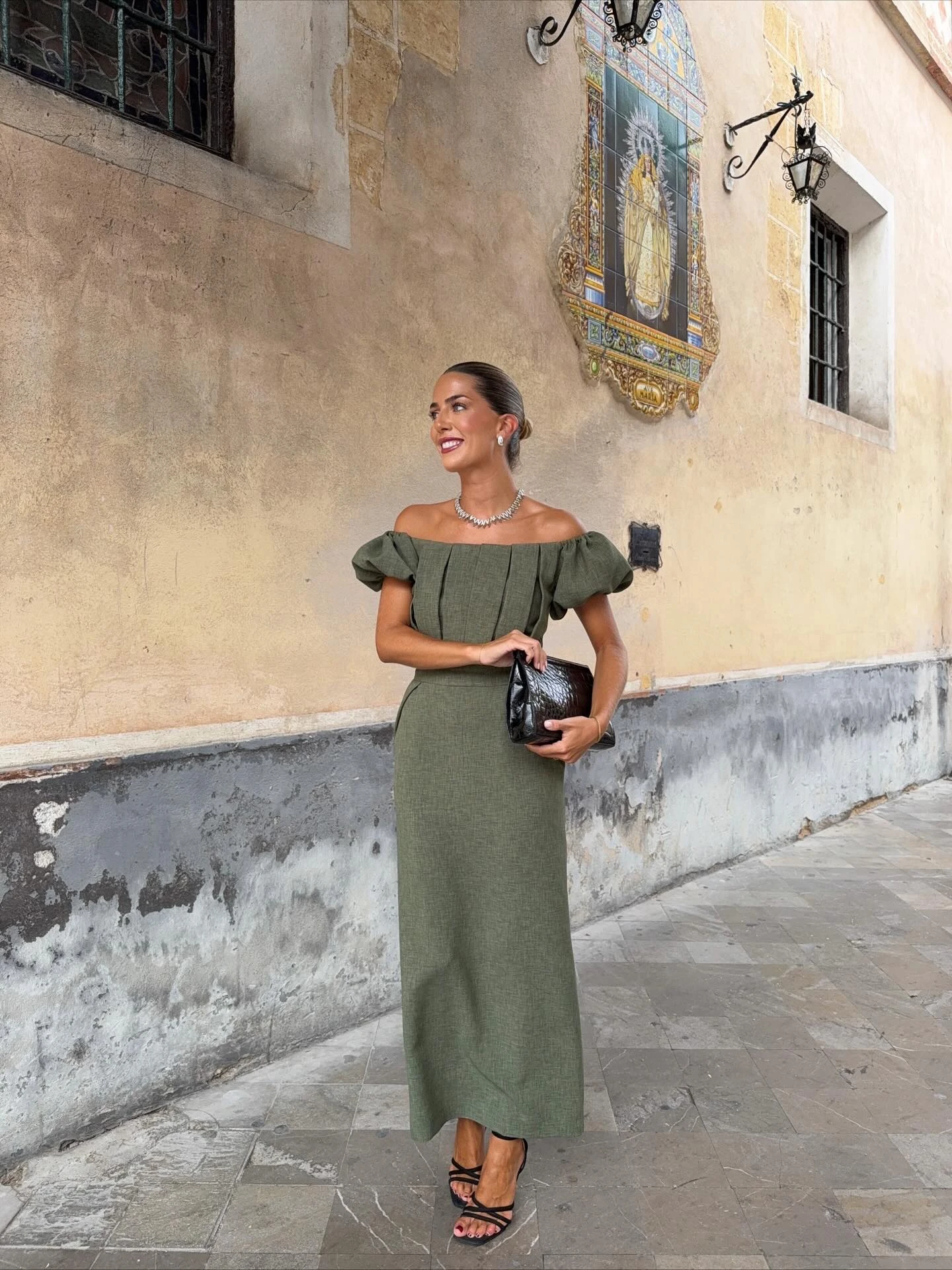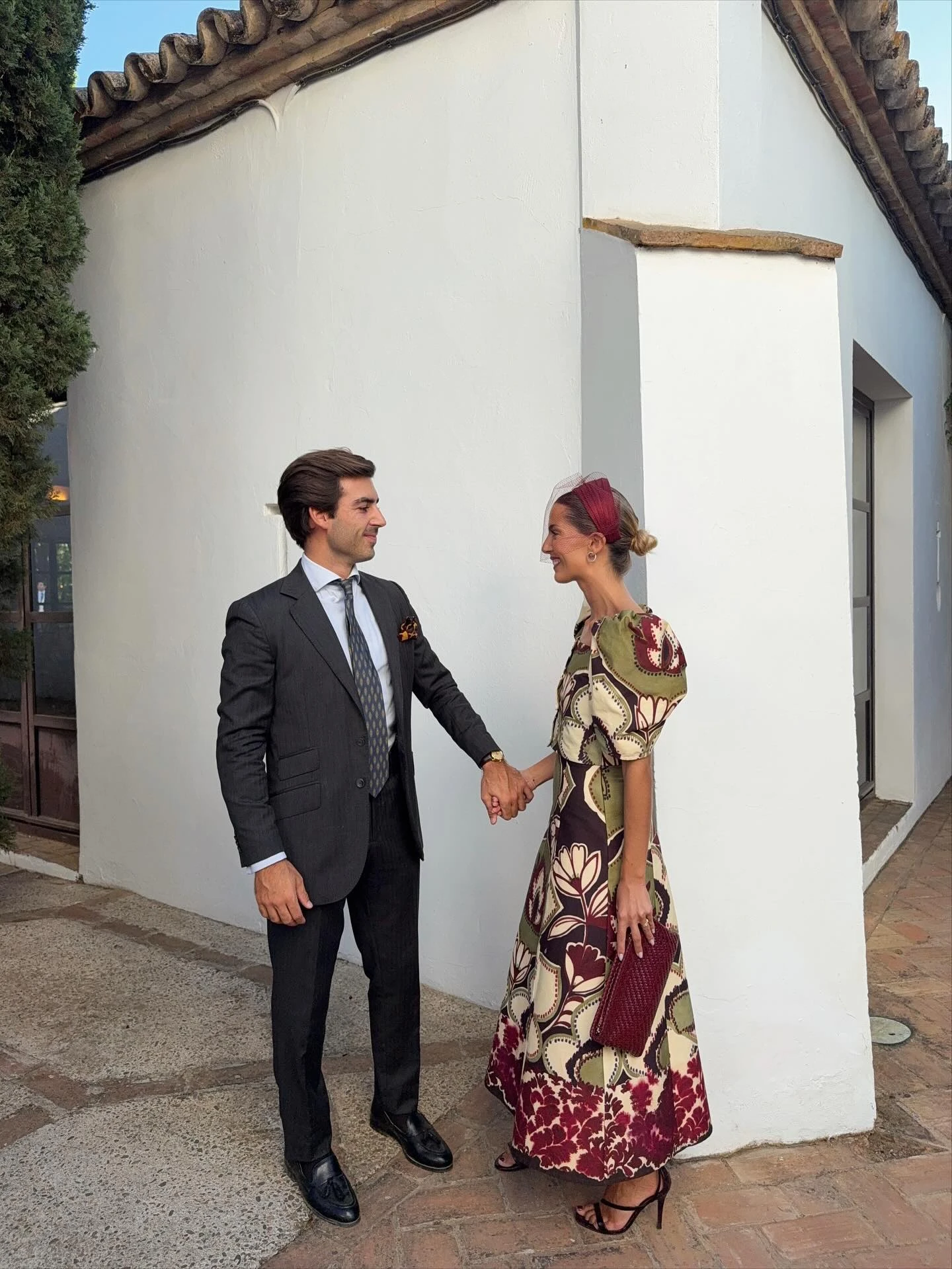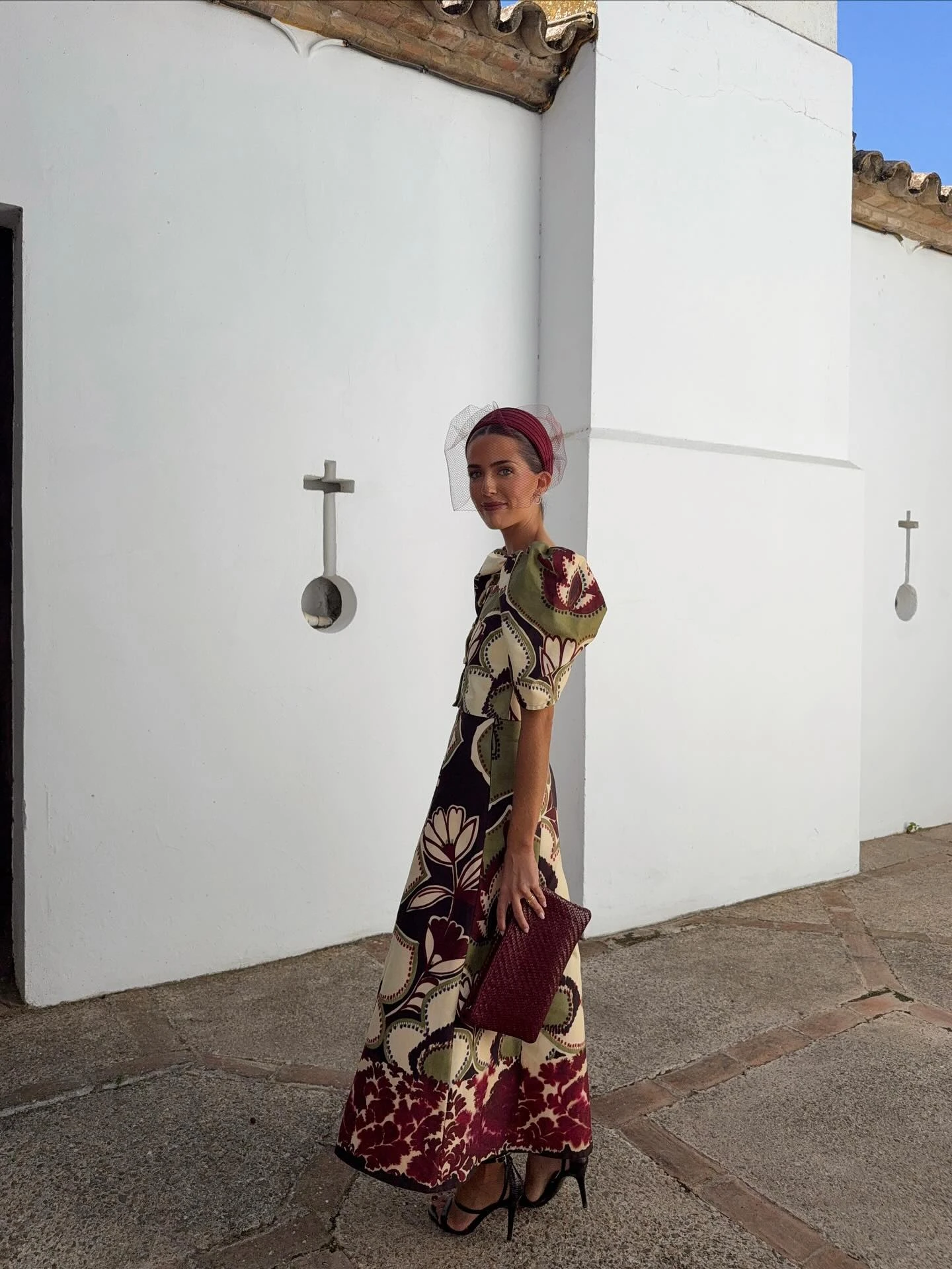 Vestido de Coosy, estola de Nanda Sevilla, tocado de Mimoki Shop, sandalias de Mango y bolso de Sezane.