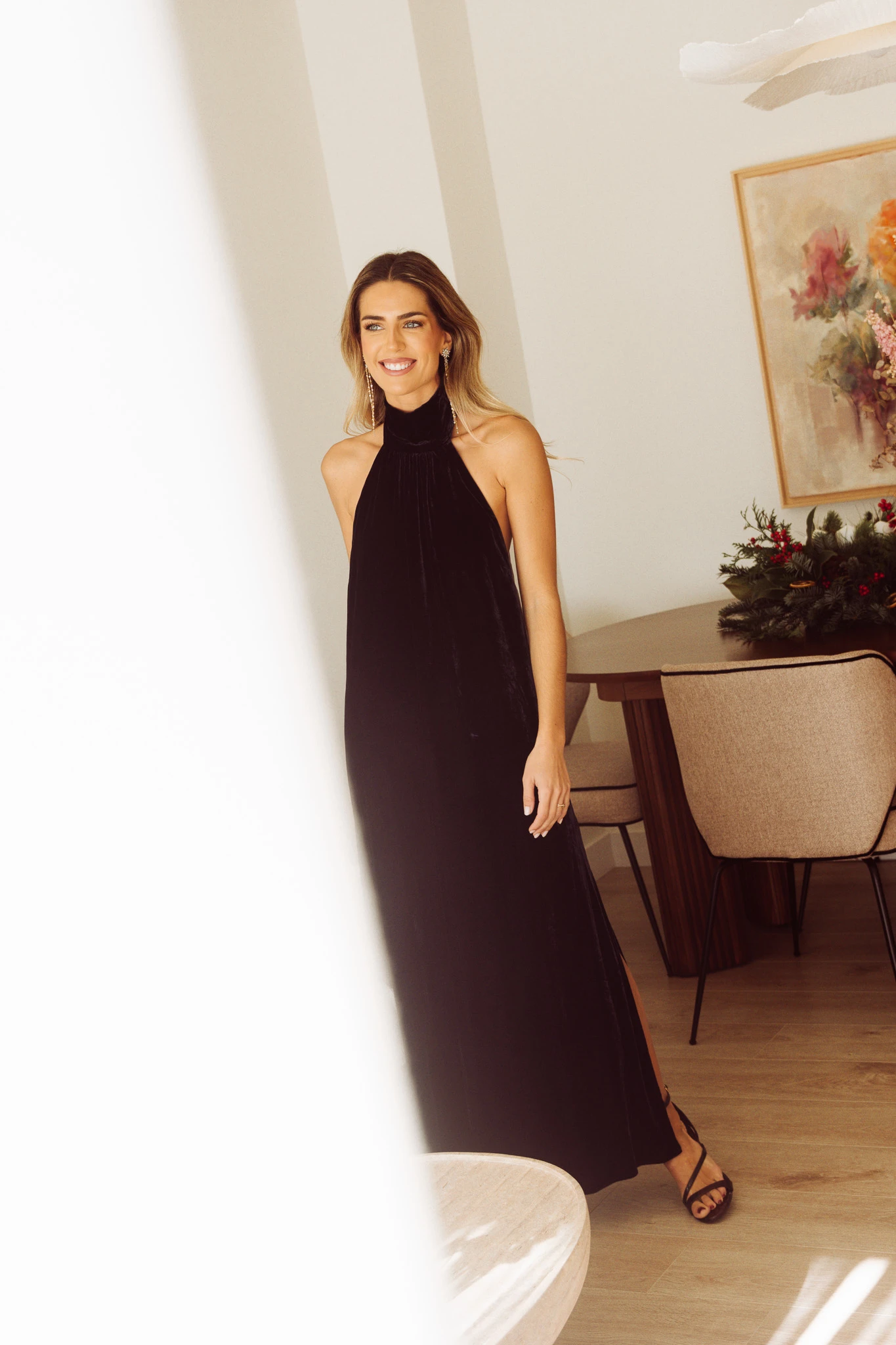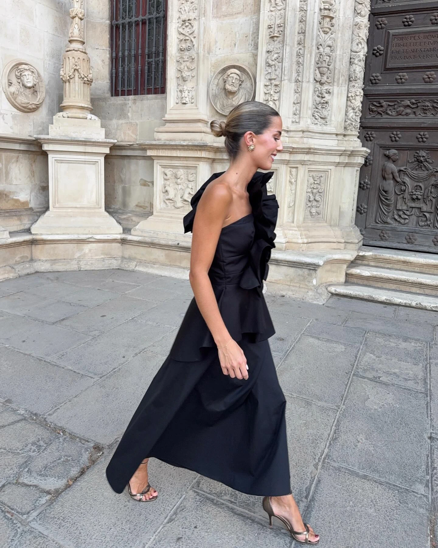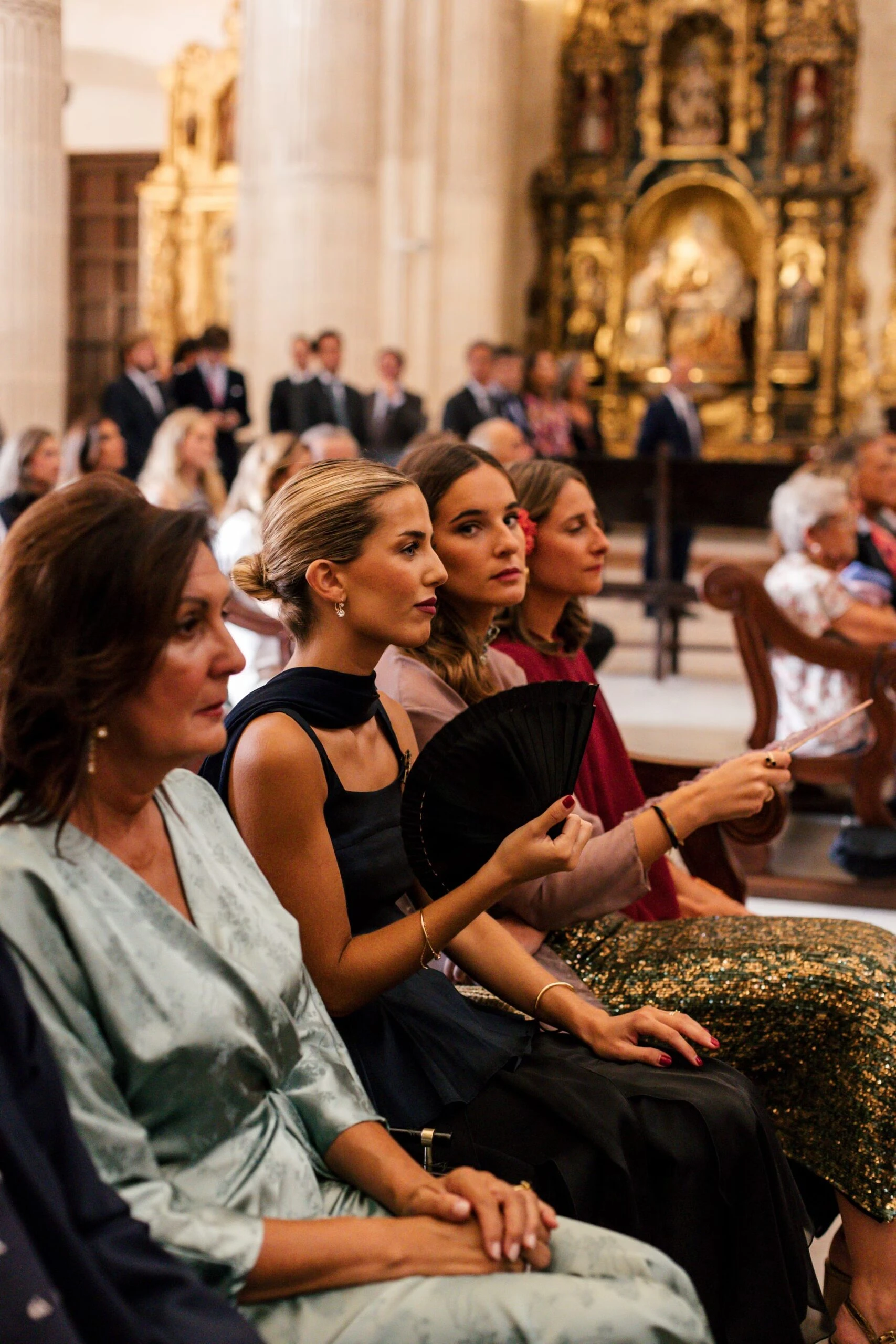 Vestido de Coosy, estola de Nanda Sevilla, tocado de Mimoki Shop, sandalias de Mango y bolso de Sezane.