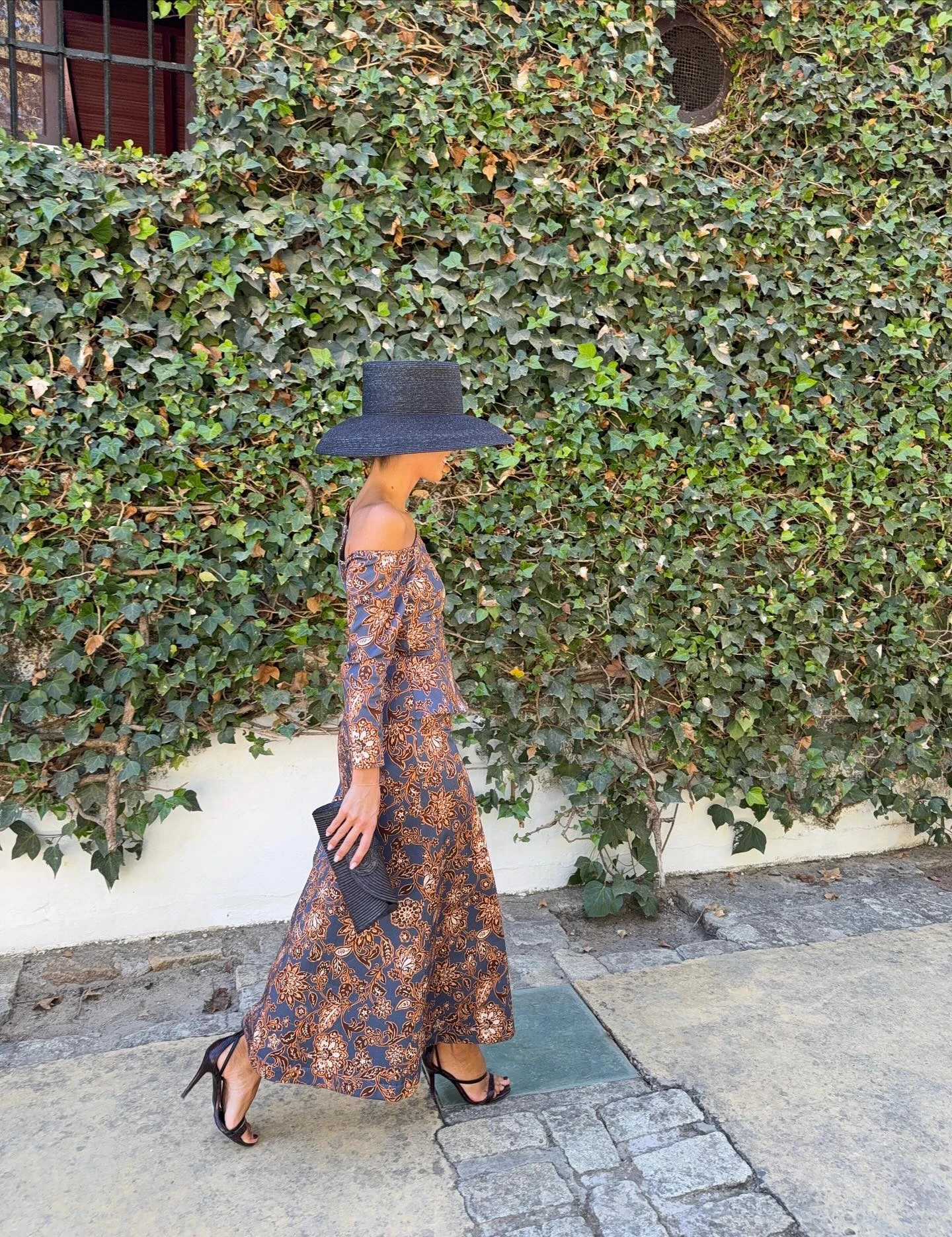 Vestido Mattui Collection, pendientes Sprezzatura, sombrero y bolso de Nana Golmar y sandalias de Mango.