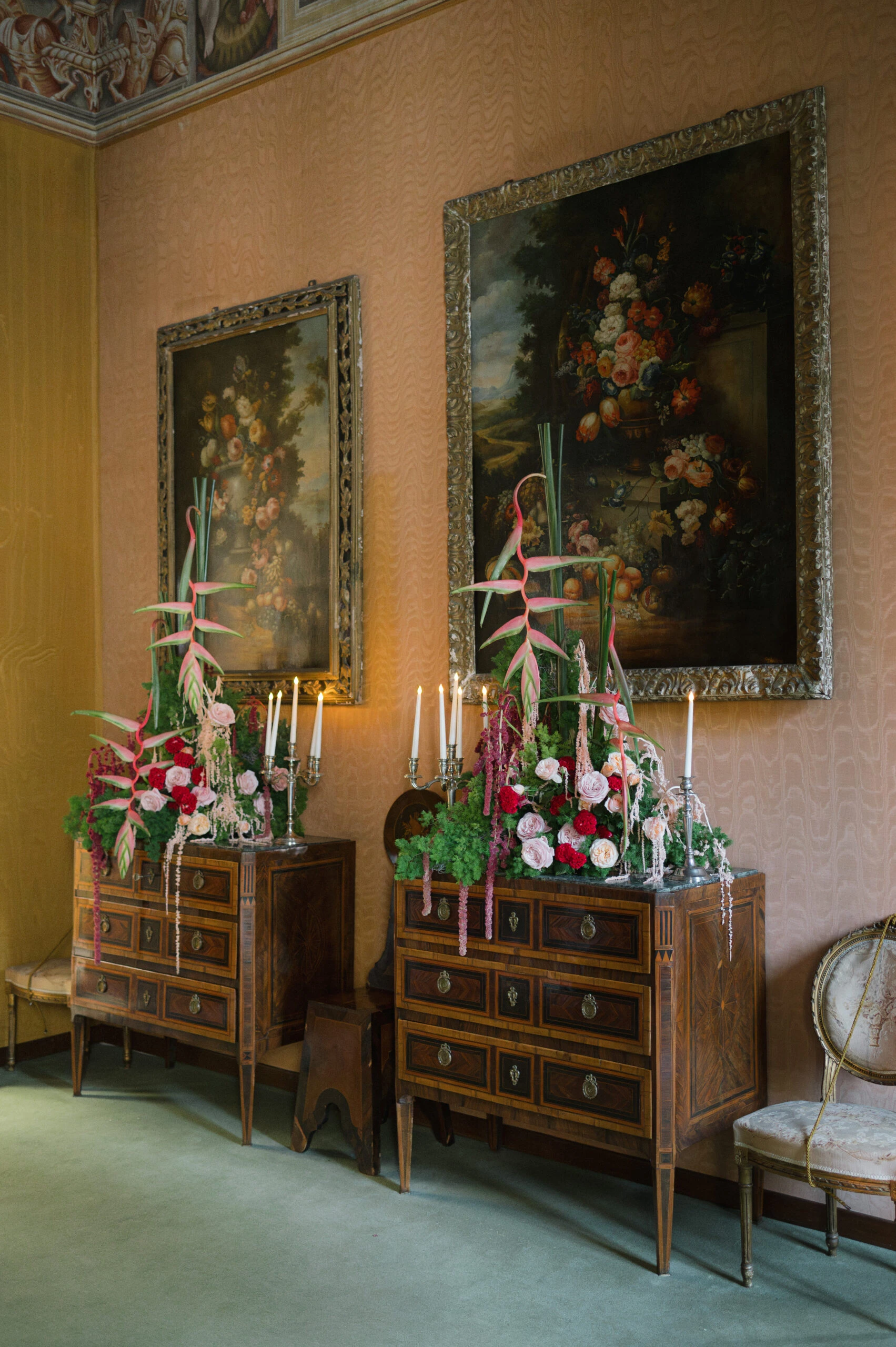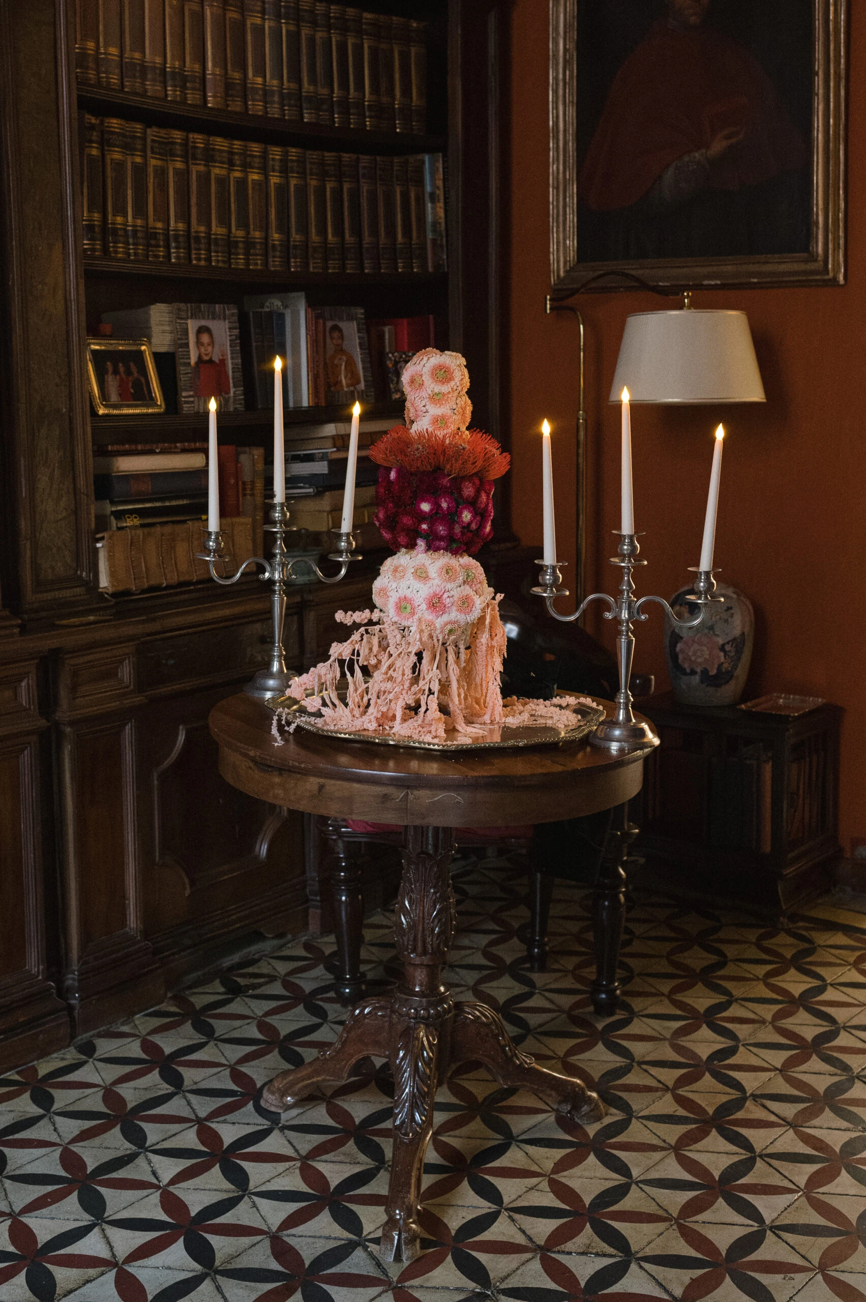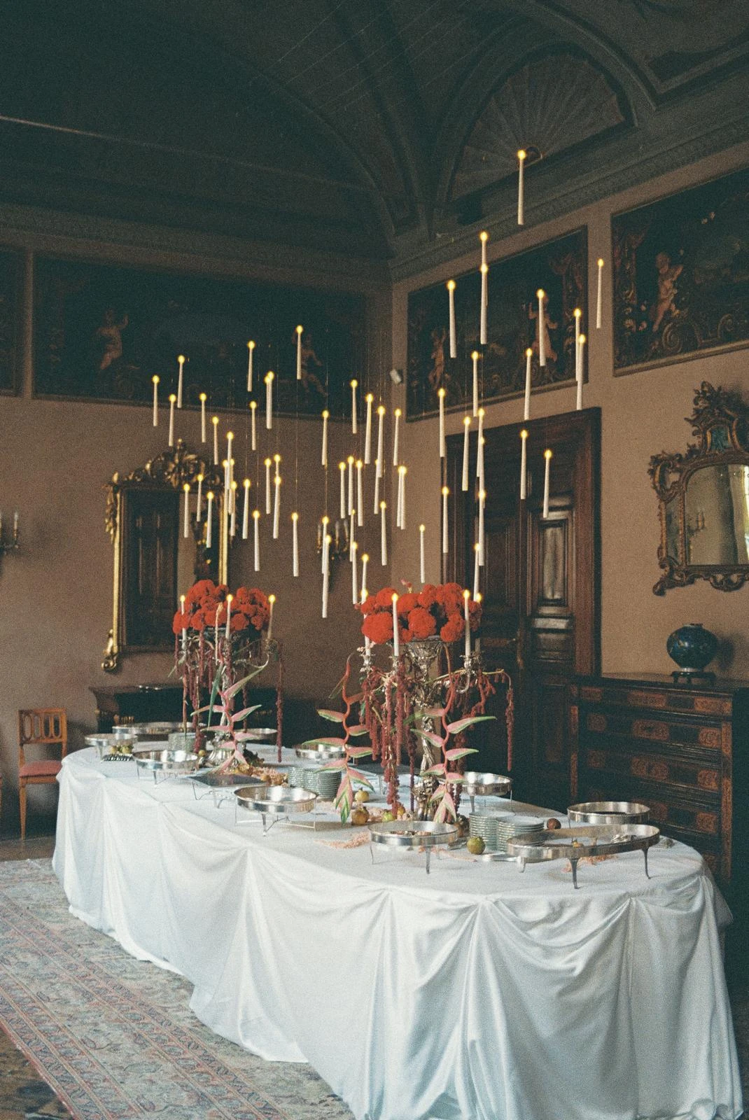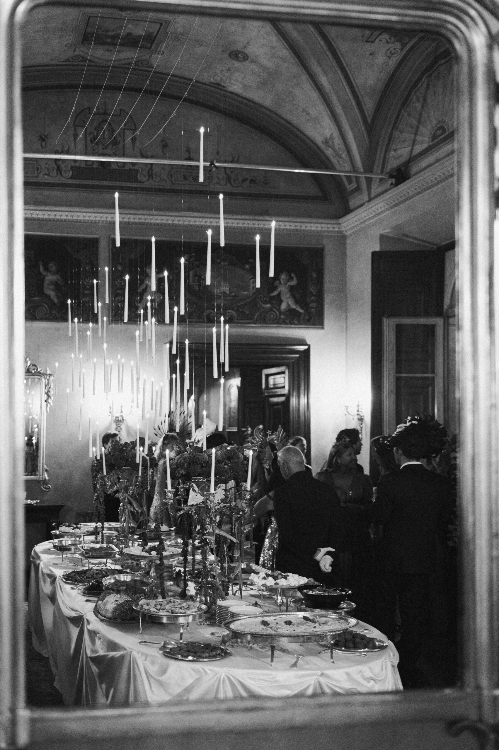 Amannano Fiori se encargó de la decoración, transformando el palacio con composiciones etéreas, velas en cascada suspendidas en el aire y una profusión de flores en tonos intensos y misteriosos.