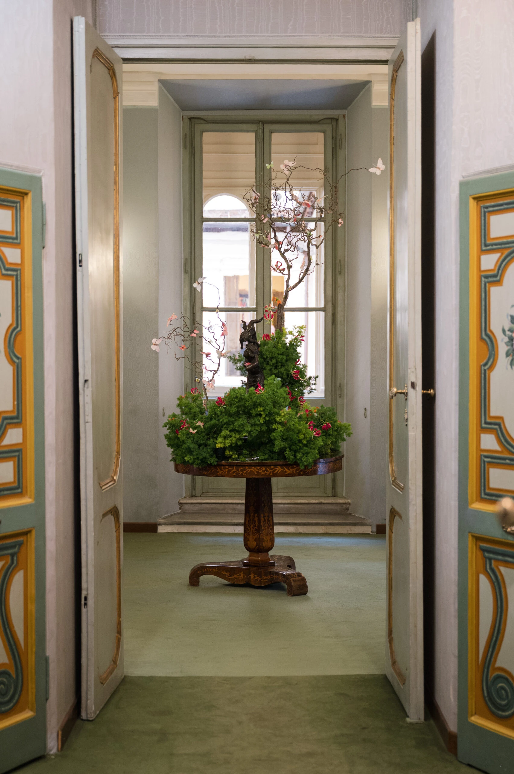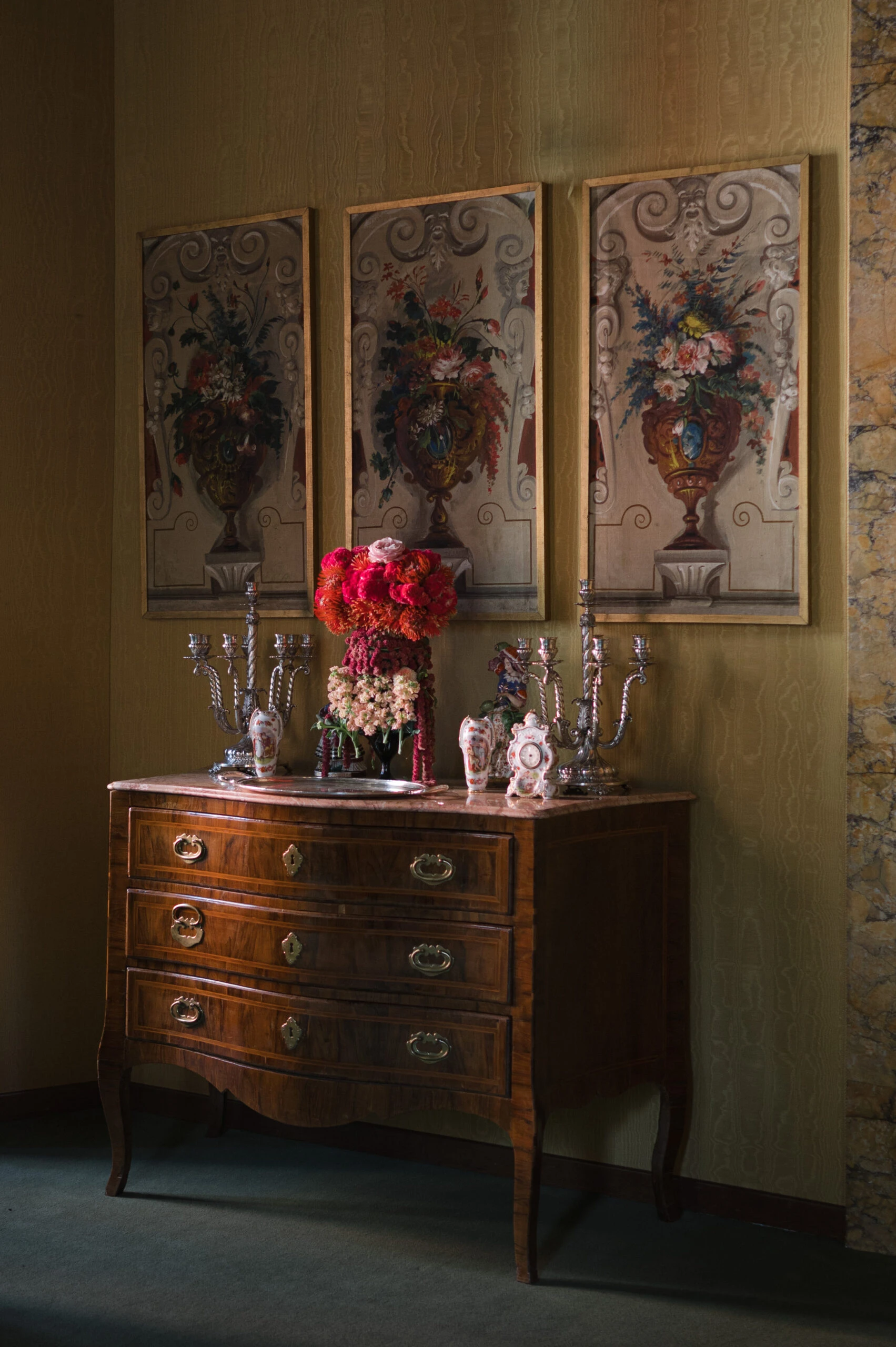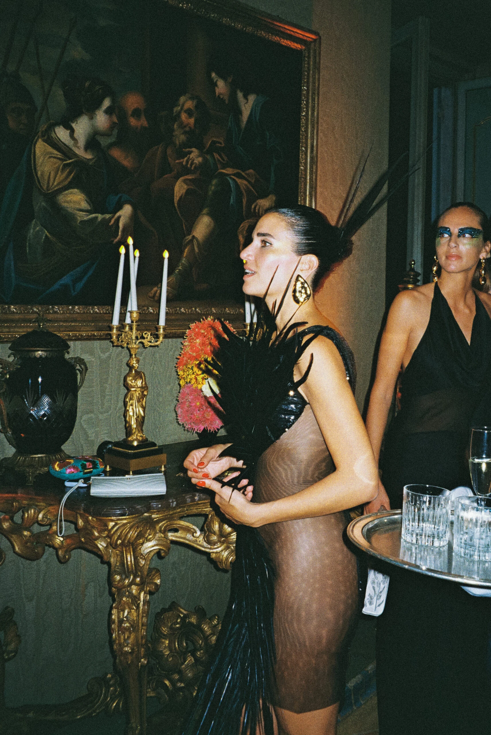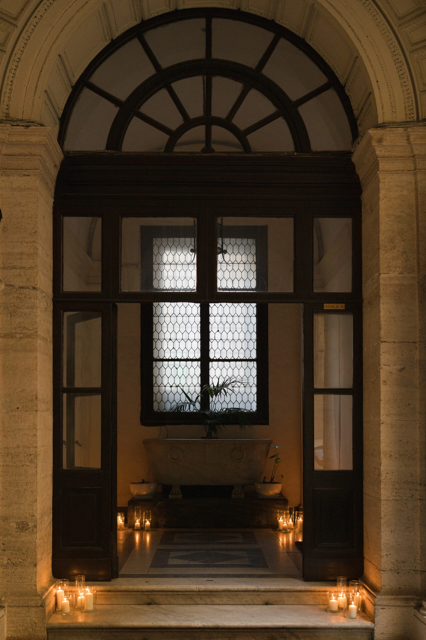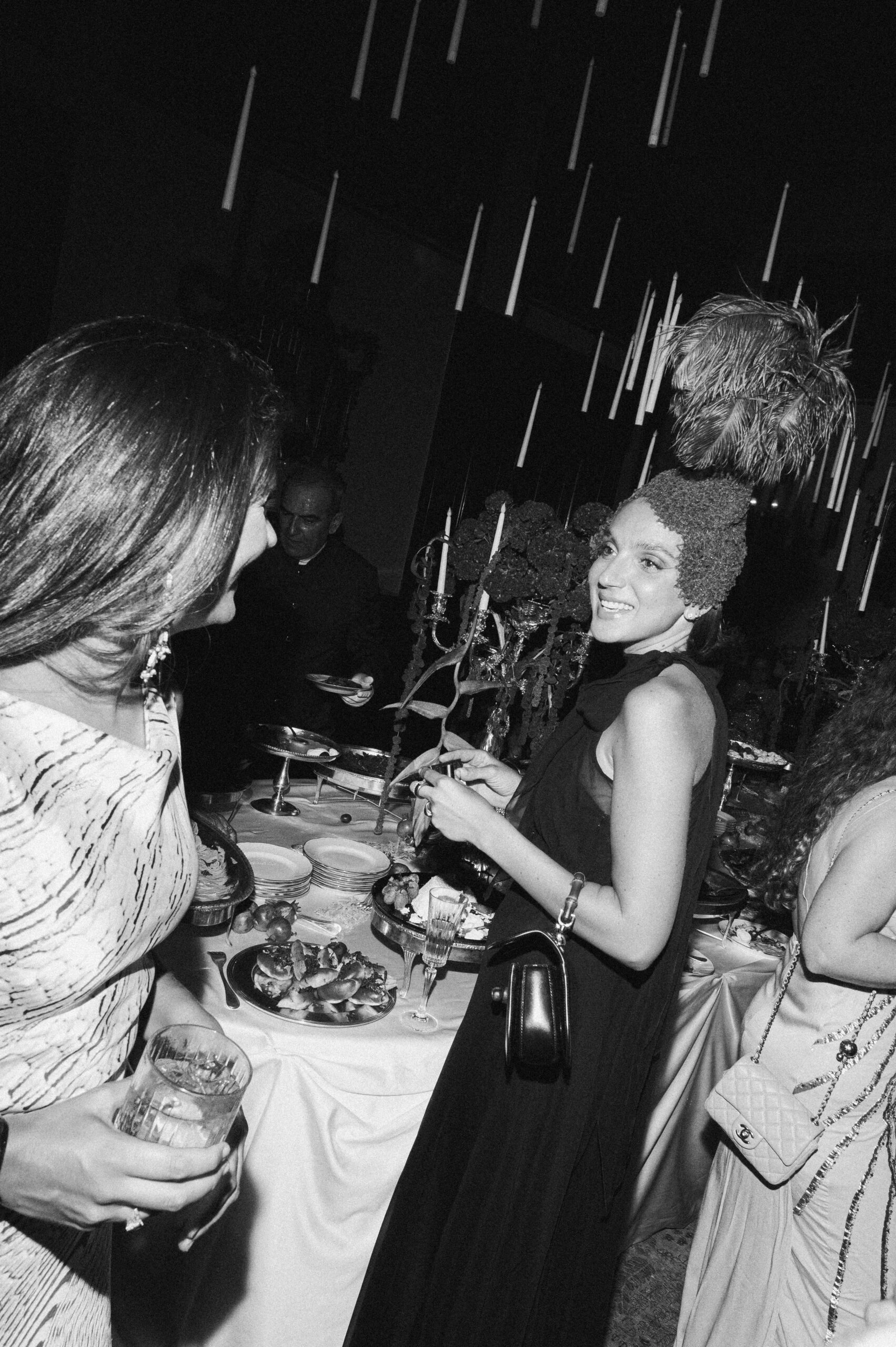 Amannano Fiori se encargó de la decoración, transformando el palacio con composiciones etéreas, velas en cascada suspendidas en el aire y una profusión de flores en tonos intensos y misteriosos.