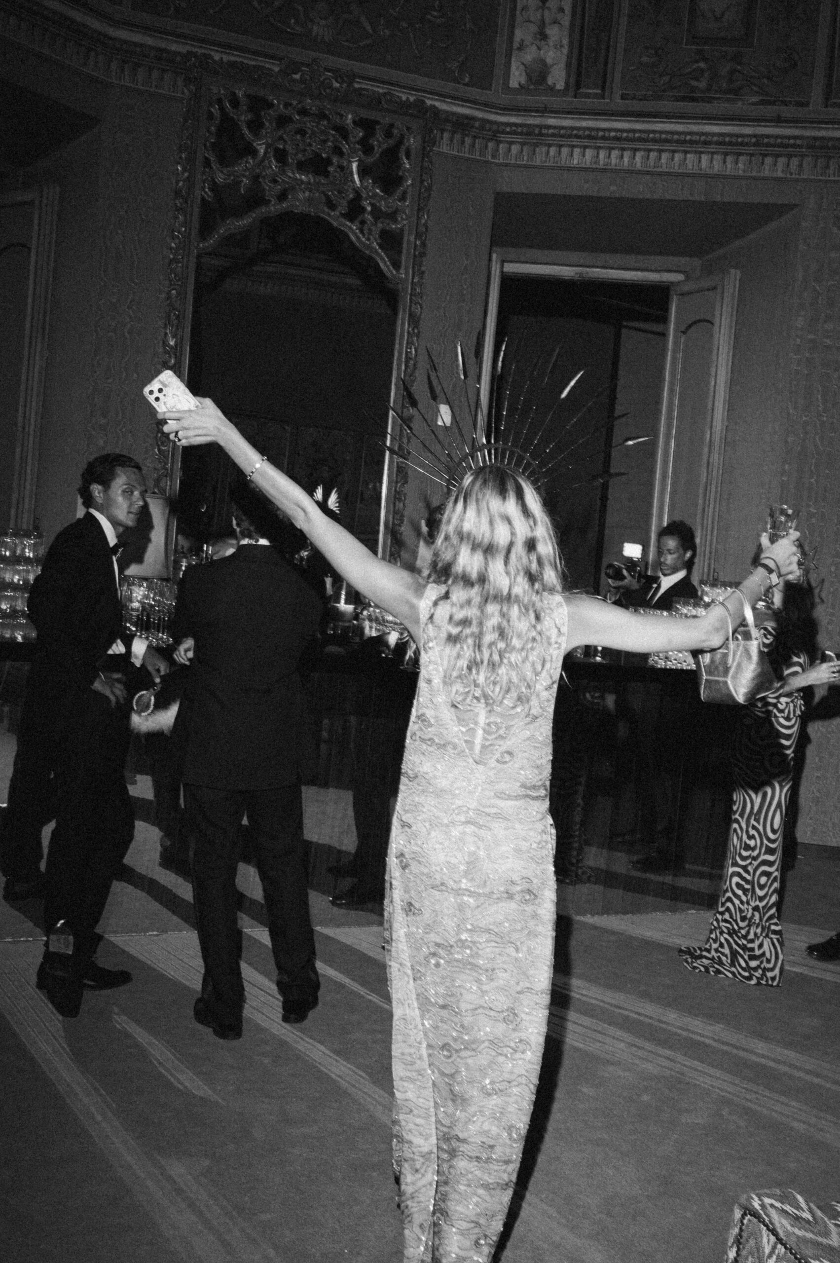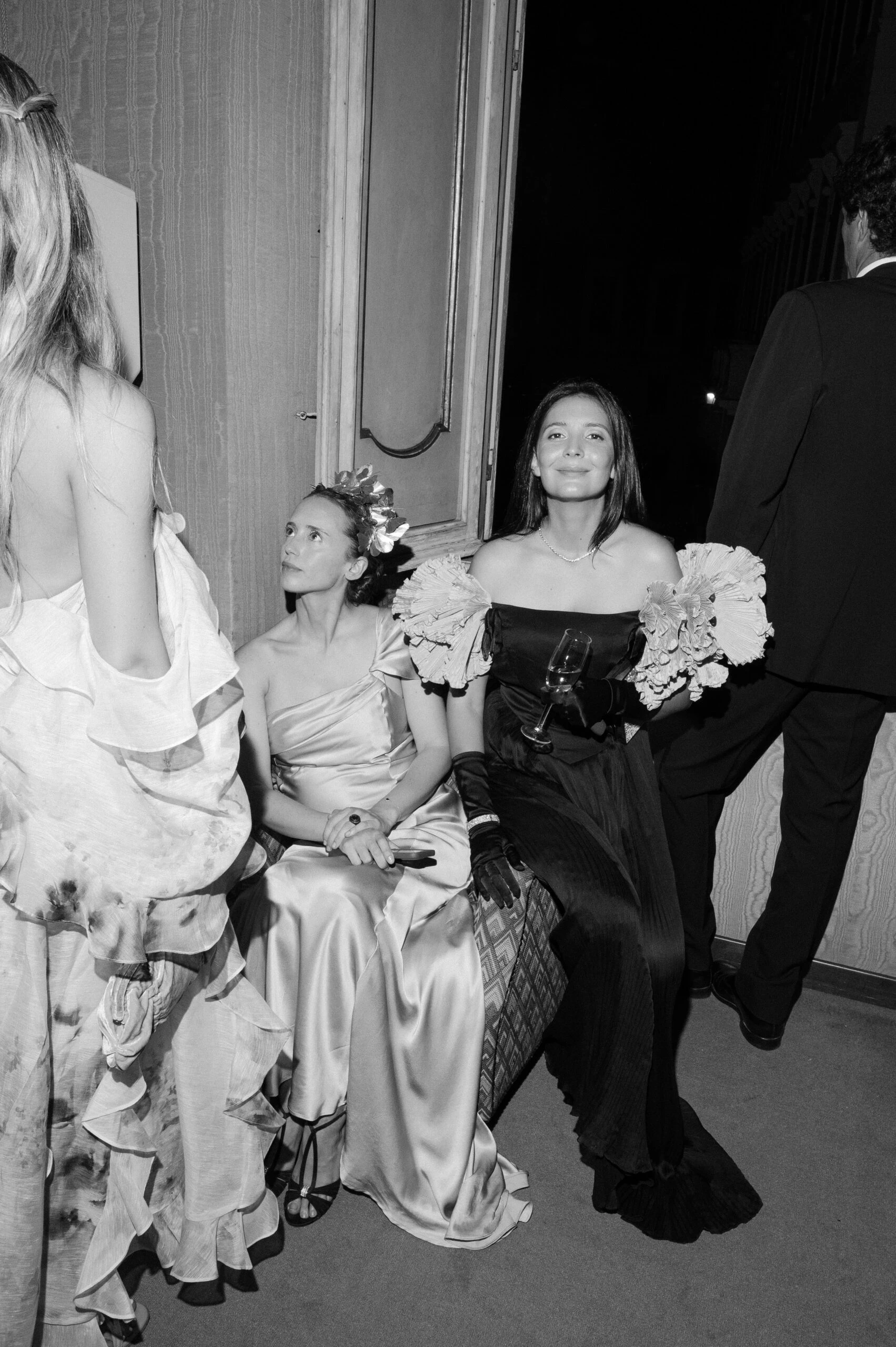 Giorgina llevó un look de Alta Costura de Armani Privé con una pieza de cabeza personalizada de su colección SS23 Harlequin. Lo combinó con joyas de Piaget y unos zapatos personalizados bordados a mano de Florrie.