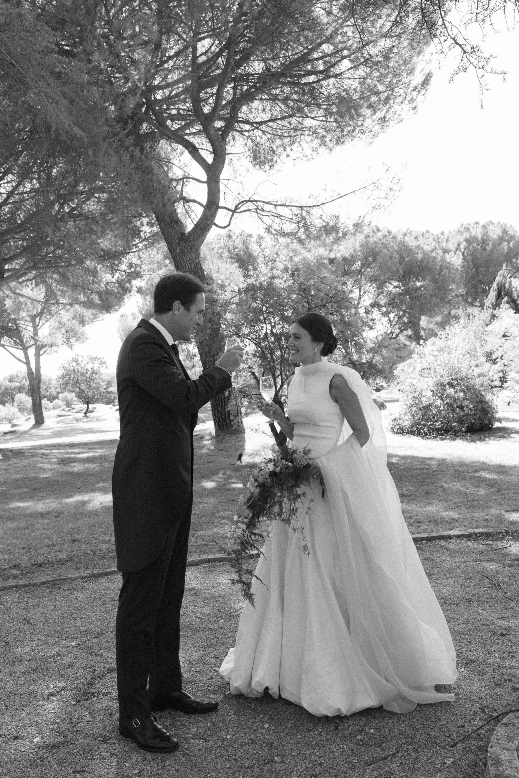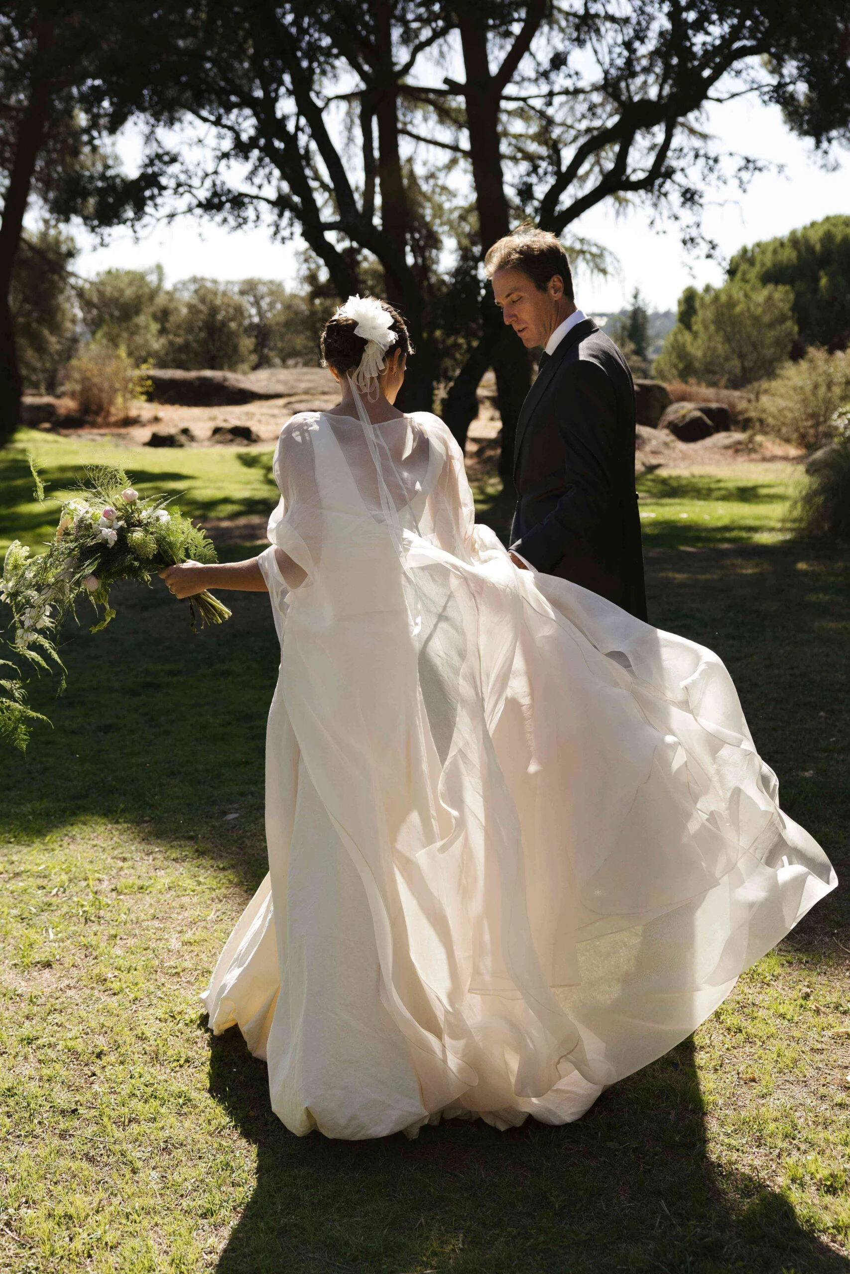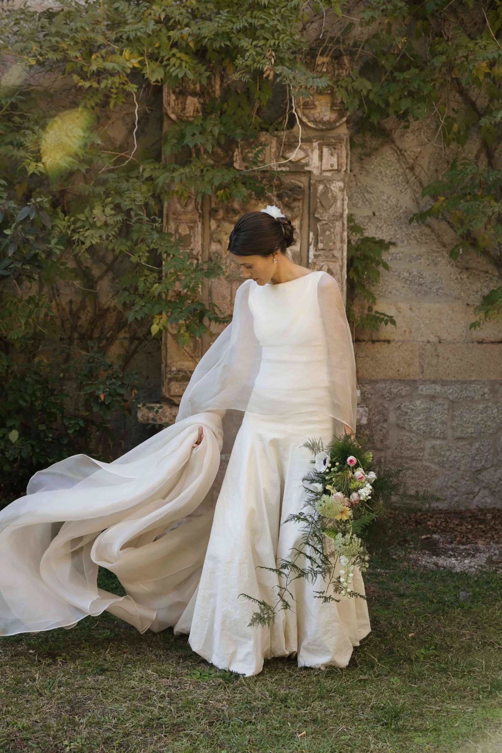 «Para empezar a visualizarme de novia fui a Cortana, me encanta todo lo que hacen y me siento muy identificada con la firma. En la primera cita lo tuve clarísimo y no fui a ver nada más: un dos piezas de top con escote barco delantero y pico en la espalda y una falda entallada acabada en globo». Como el top era de tirantes, Gloria decidió hacerse una capa de organza en Duyos y combinar todo con unos zapatos de Lodi.