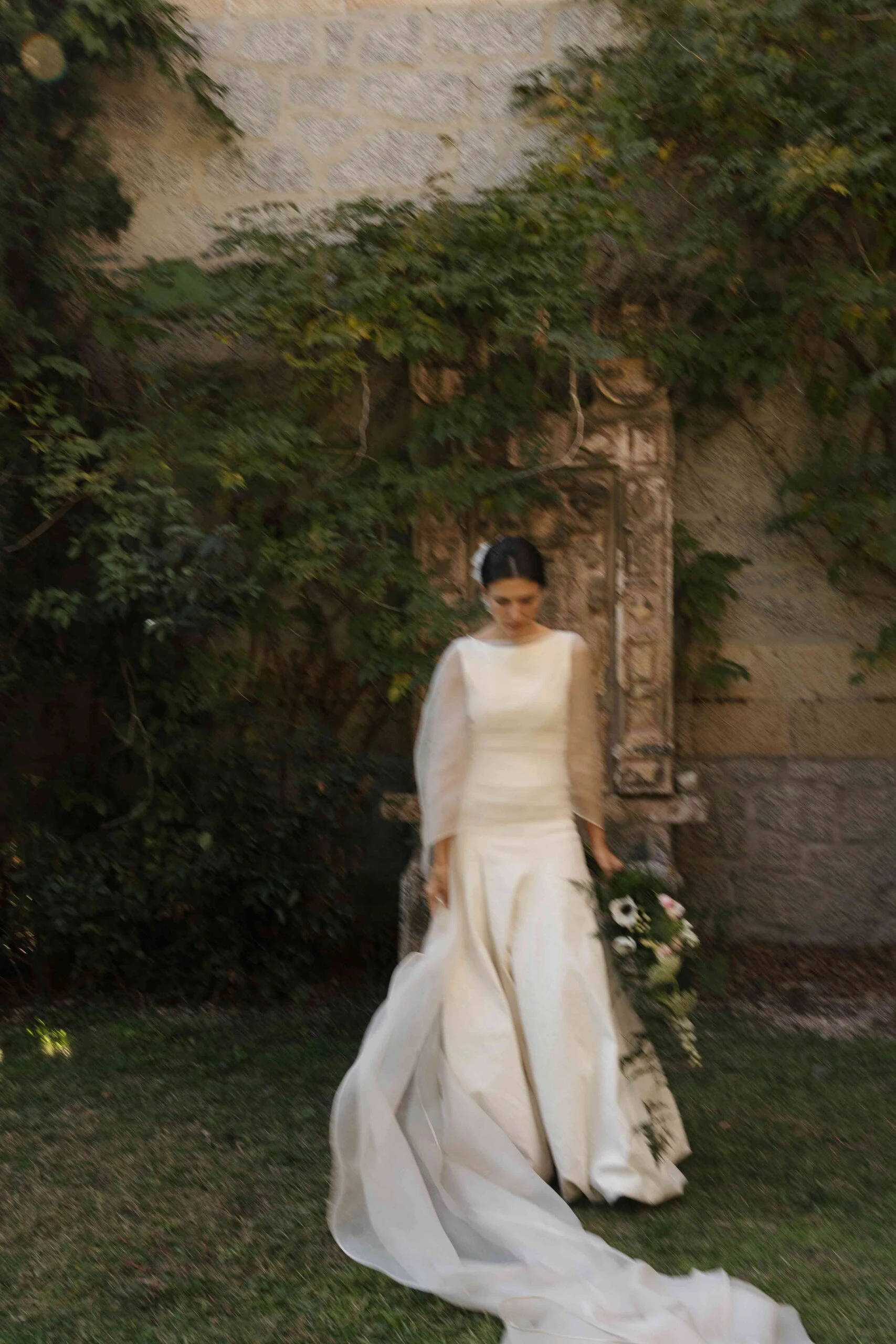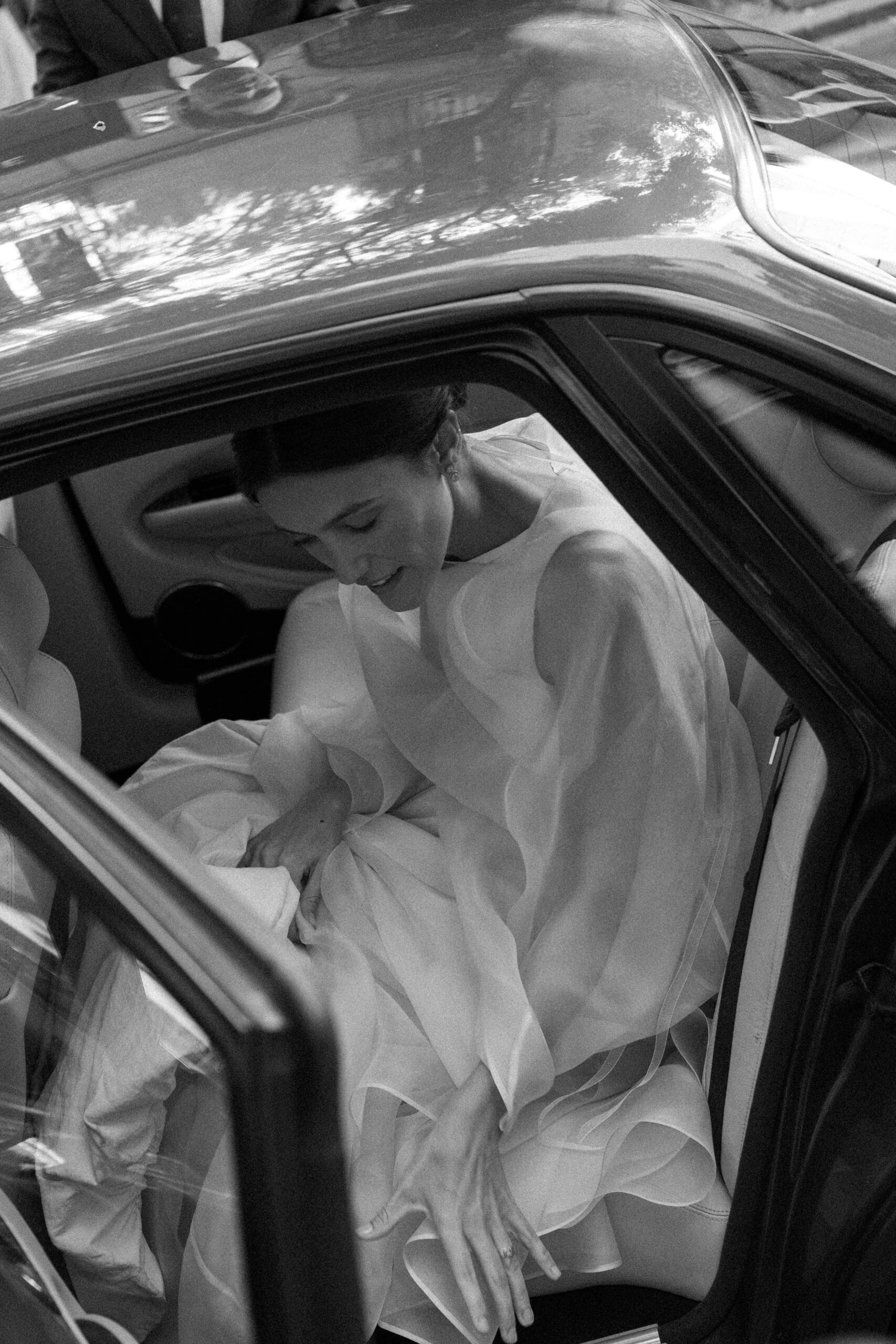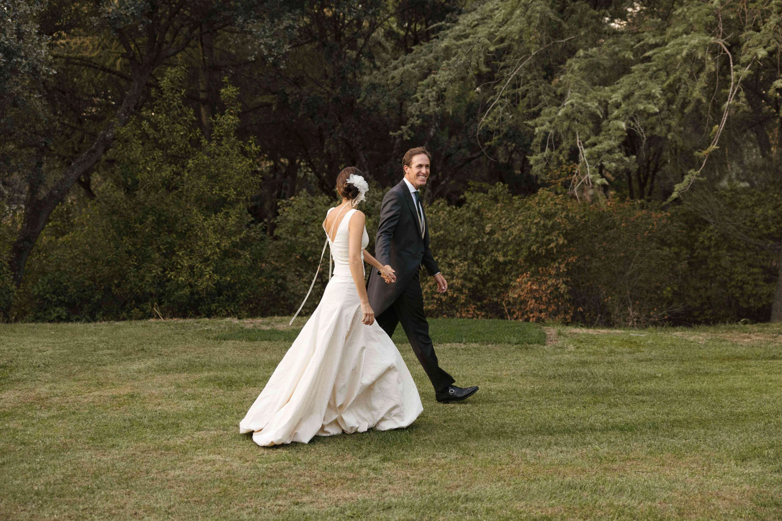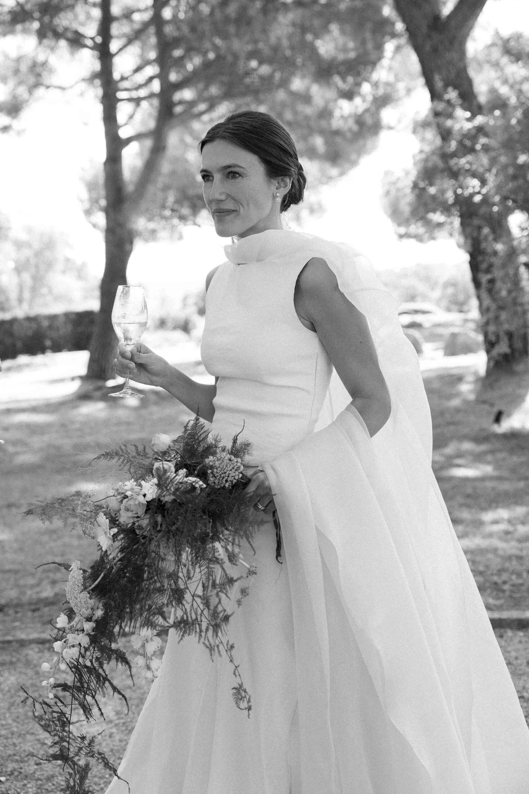 «Para empezar a visualizarme de novia fui a Cortana, me encanta todo lo que hacen y me siento muy identificada con la firma. En la primera cita lo tuve clarísimo y no fui a ver nada más: un dos piezas de top con escote barco delantero y pico en la espalda y una falda entallada acabada en globo». Como el top era de tirantes, Gloria decidió hacerse una capa de organza en Duyos y combinar todo con unos zapatos de Lodi.