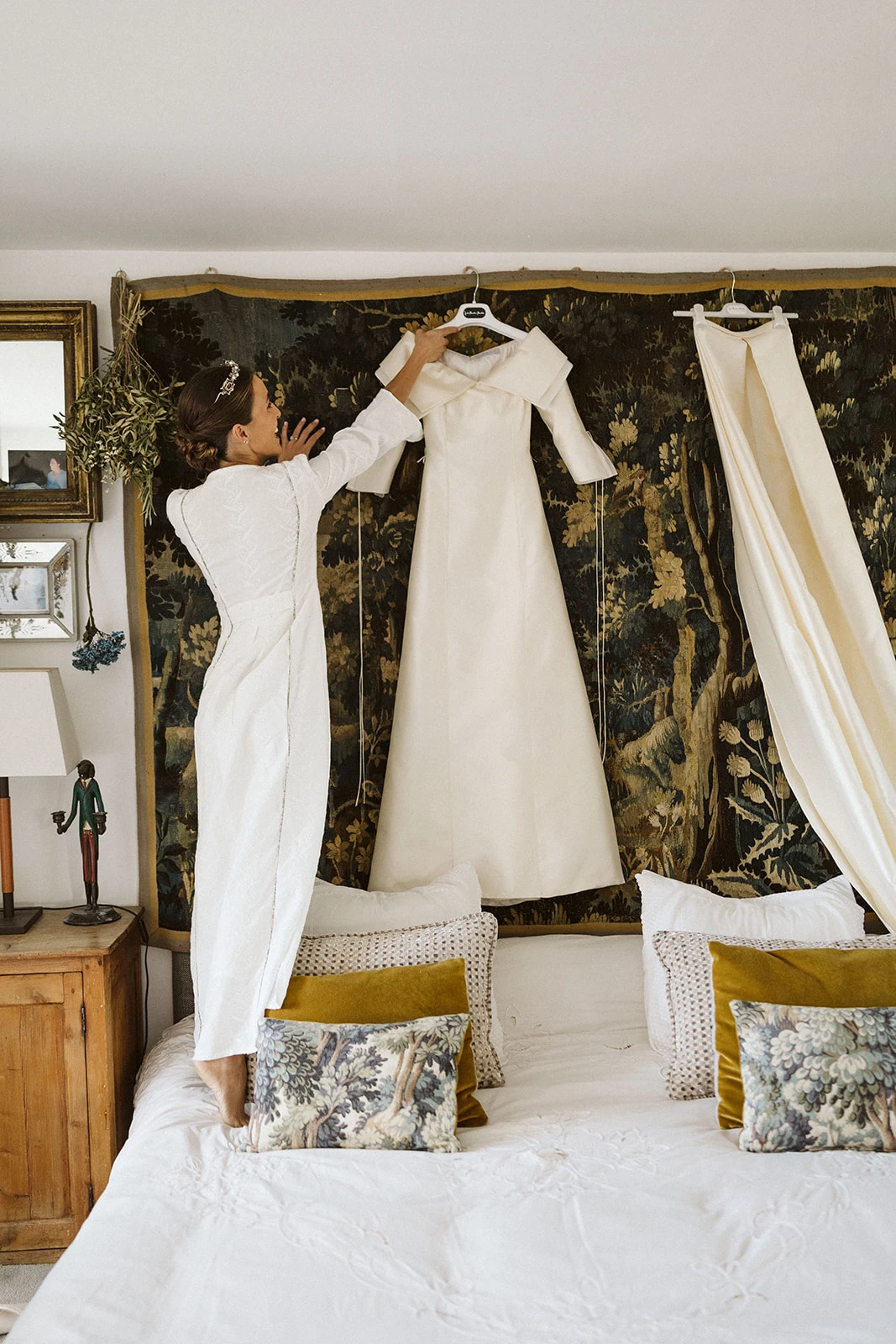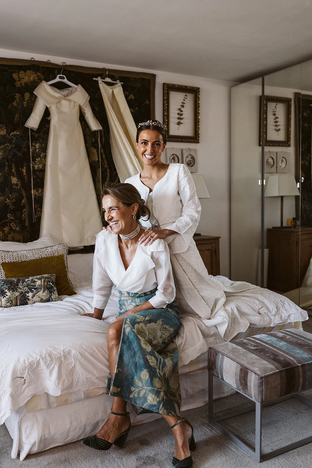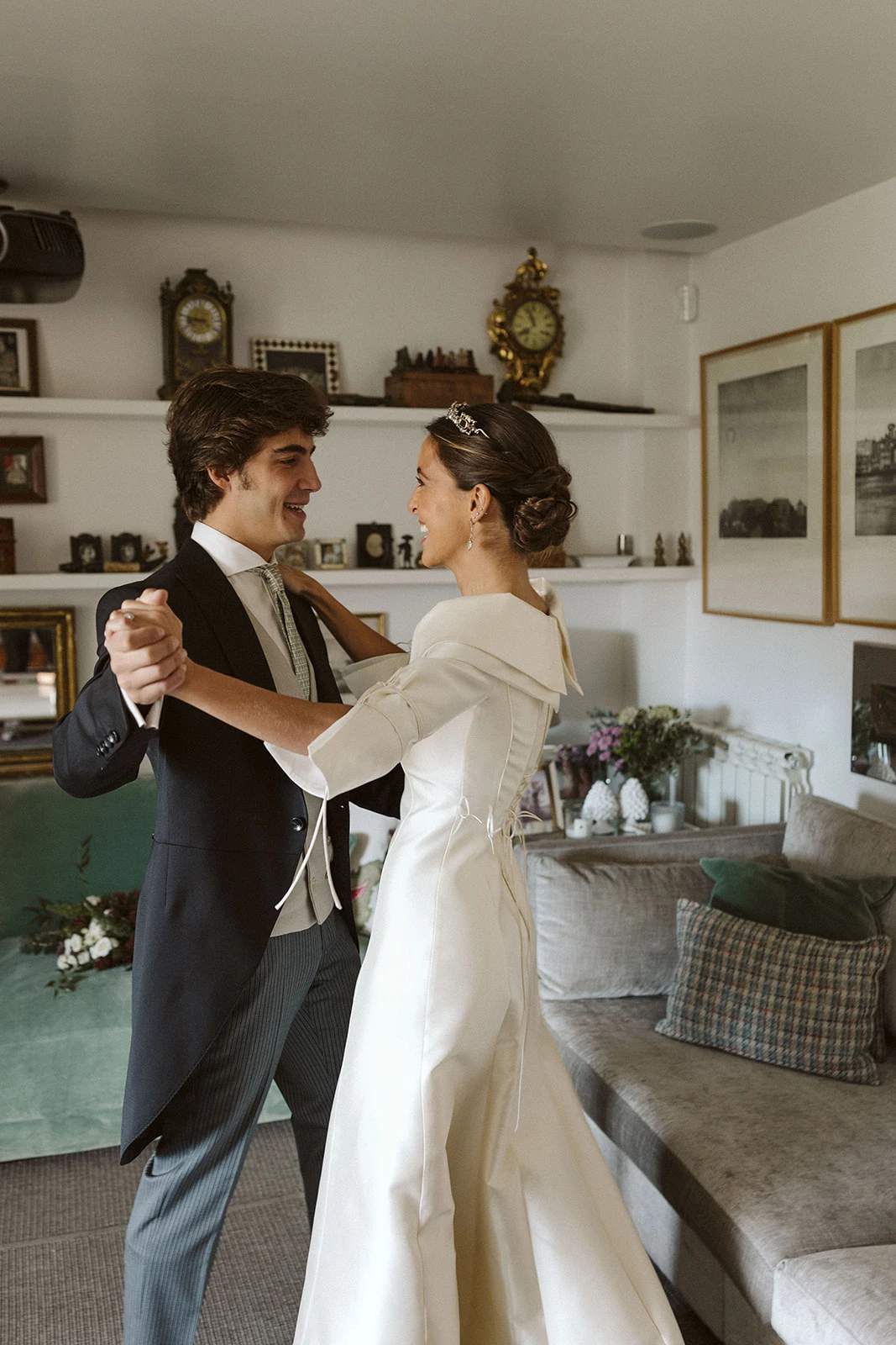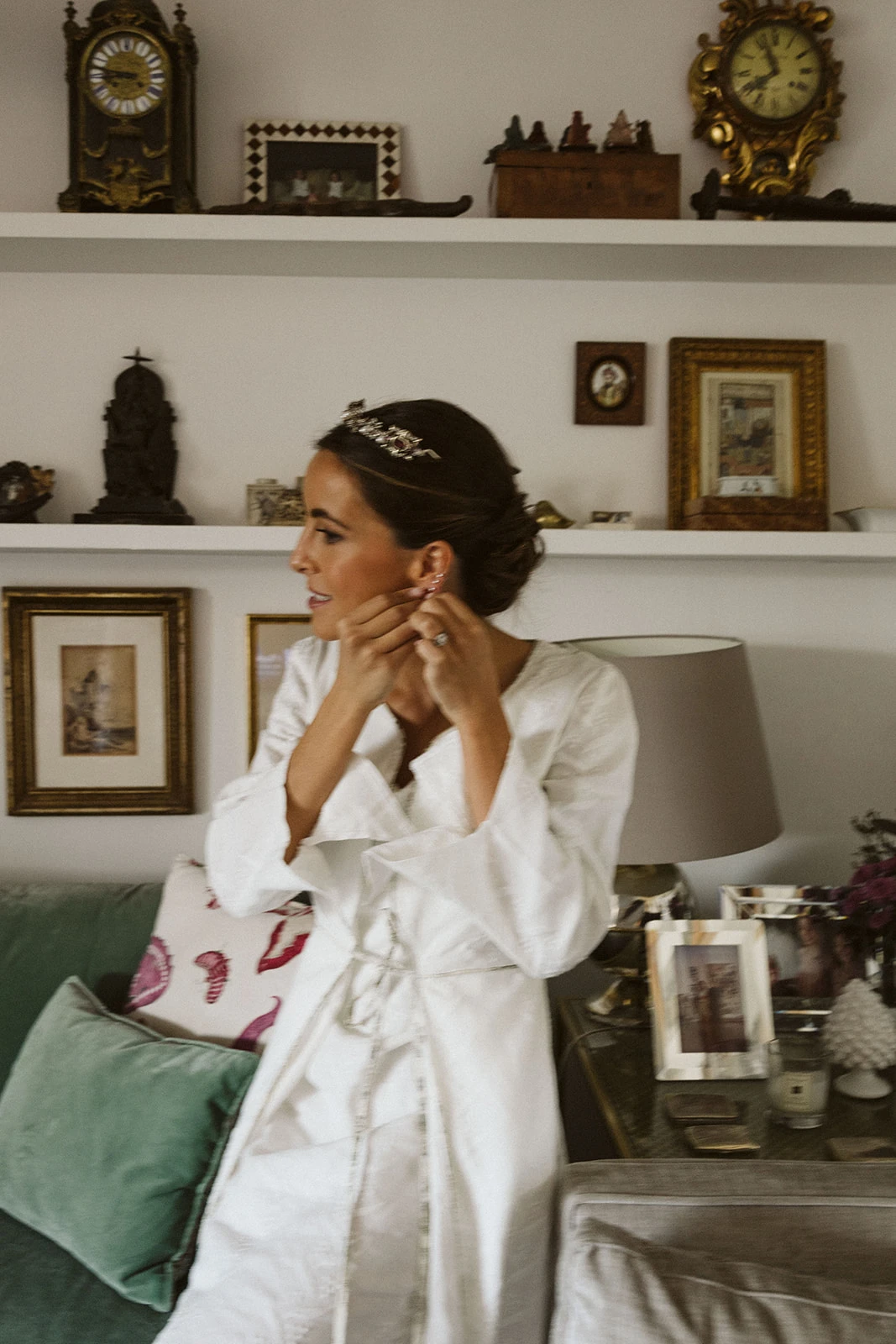 Al igual que muchos de los looks de las invitadas — entre ellos los de amigas, testigos, familiares y hasta sumar entre 40 y 50 trajes — el camisón y el salto de cama los diseñó Victoria junto a su madre en Vicalo, un trabajo que le llevó a la novia cerca de un año. Del maquillaje y el peinado se encargaron Lola Bernardo y Eva Vera: «La mañana de la boda fue muy divertida, se respiraba muchísima paz en casa, pusimos música y hasta bailamos mientras me preparaba. Quería algo natural y el recogido nos lo inventamos jugando con el moño. La tiara la hizo mi madre con joyas familiares».