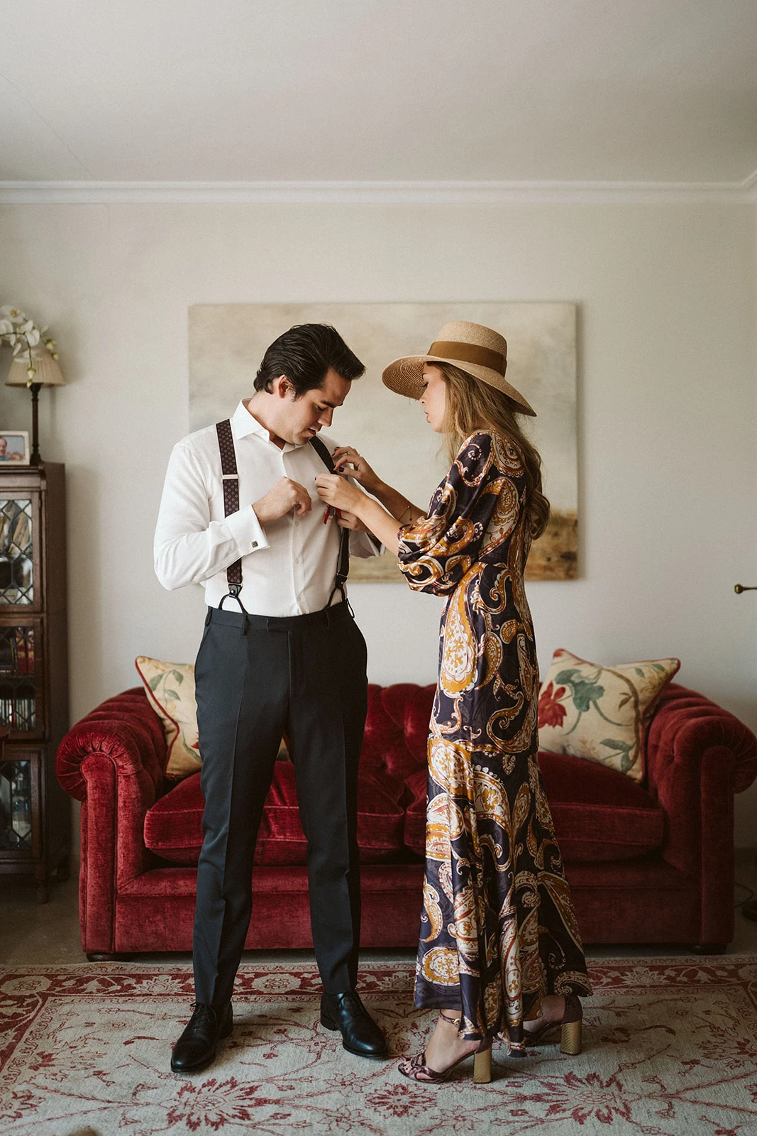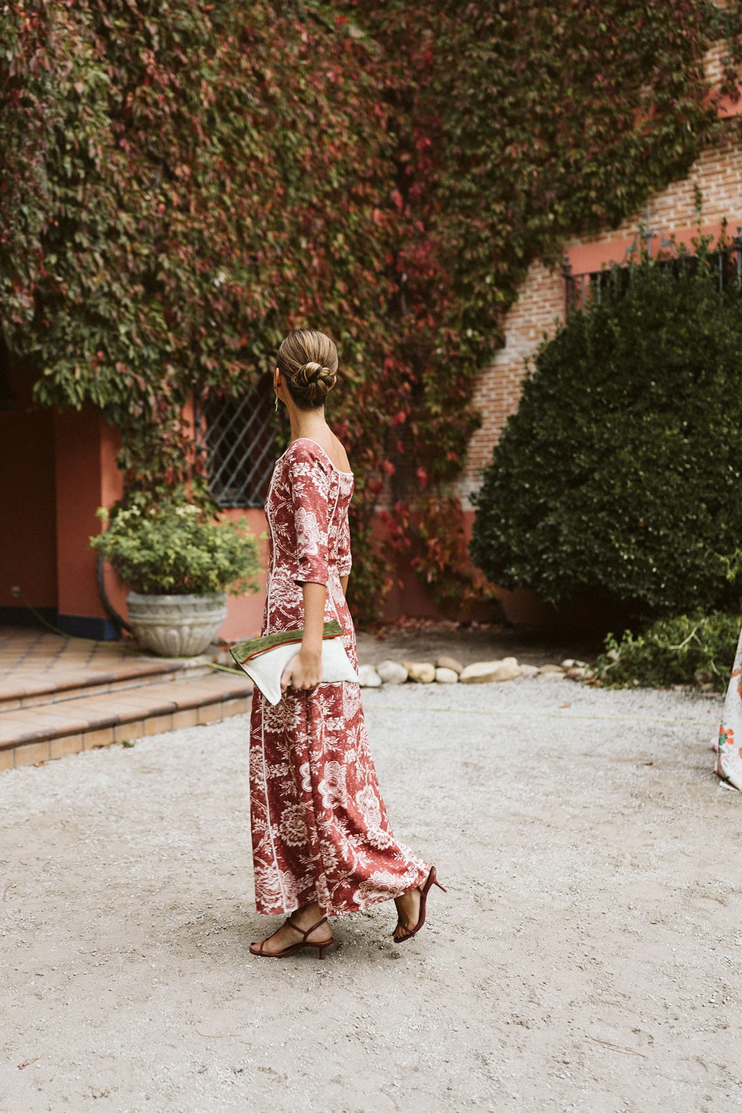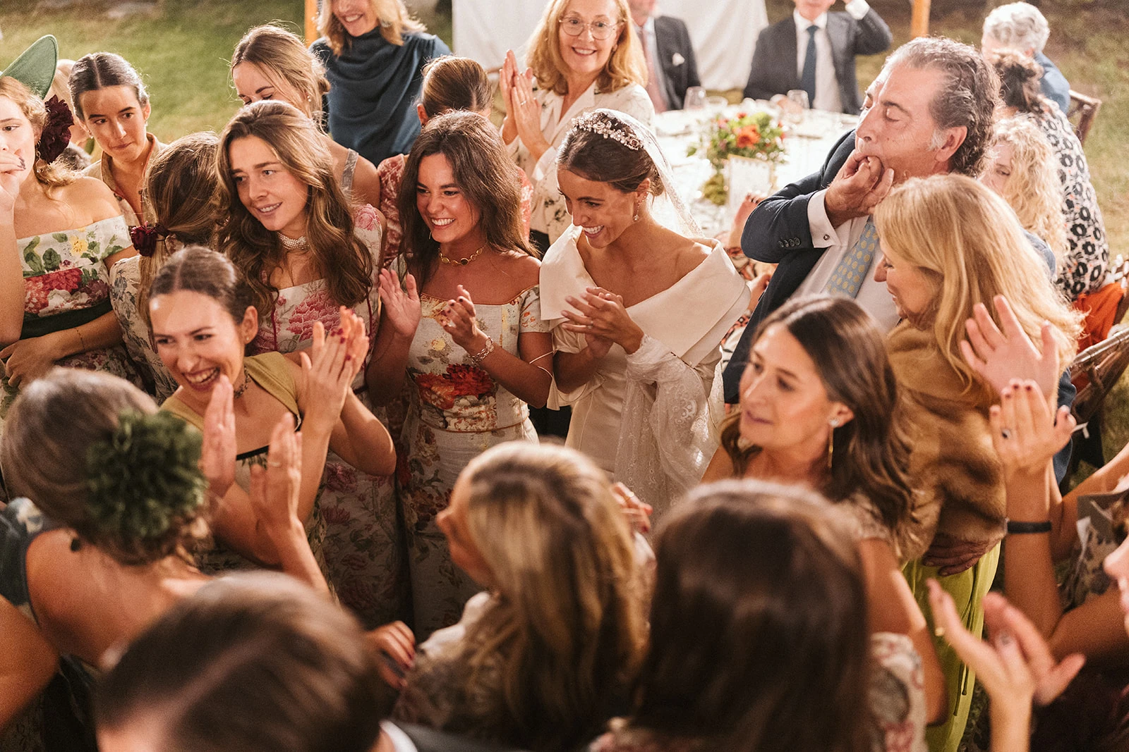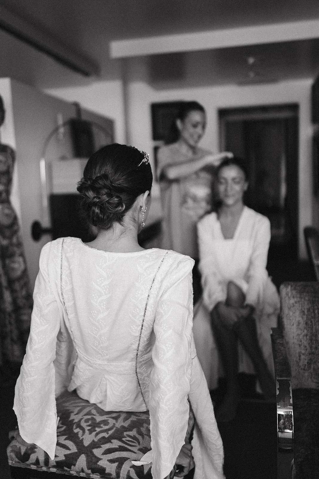 Al igual que muchos de los looks de las invitadas — entre ellos los de amigas, testigos, familiares y hasta sumar entre 40 y 50 trajes — el camisón y el salto de cama los diseñó Victoria junto a su madre en Vicalo, un trabajo que le llevó a la novia cerca de un año. Del maquillaje y el peinado se encargaron Lola Bernardo y Eva Vera: «La mañana de la boda fue muy divertida, se respiraba muchísima paz en casa, pusimos música y hasta bailamos mientras me preparaba. Quería algo natural y el recogido nos lo inventamos jugando con el moño. La tiara la hizo mi madre con joyas familiares».