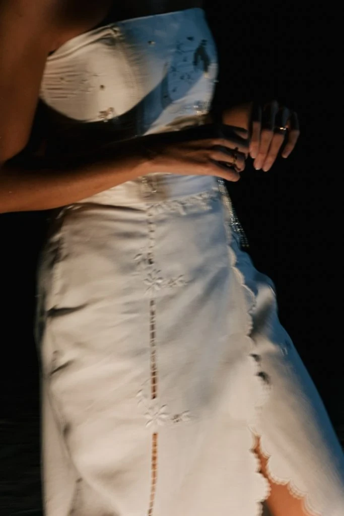 María Serra llevó un segundo look muy fiestero: escote, espalda semiabierta y una falda con tiras diagonales en distintas alturas. Además, añadió botones bordados y una red de cristales plateados bajo la falda para darle movimiento.