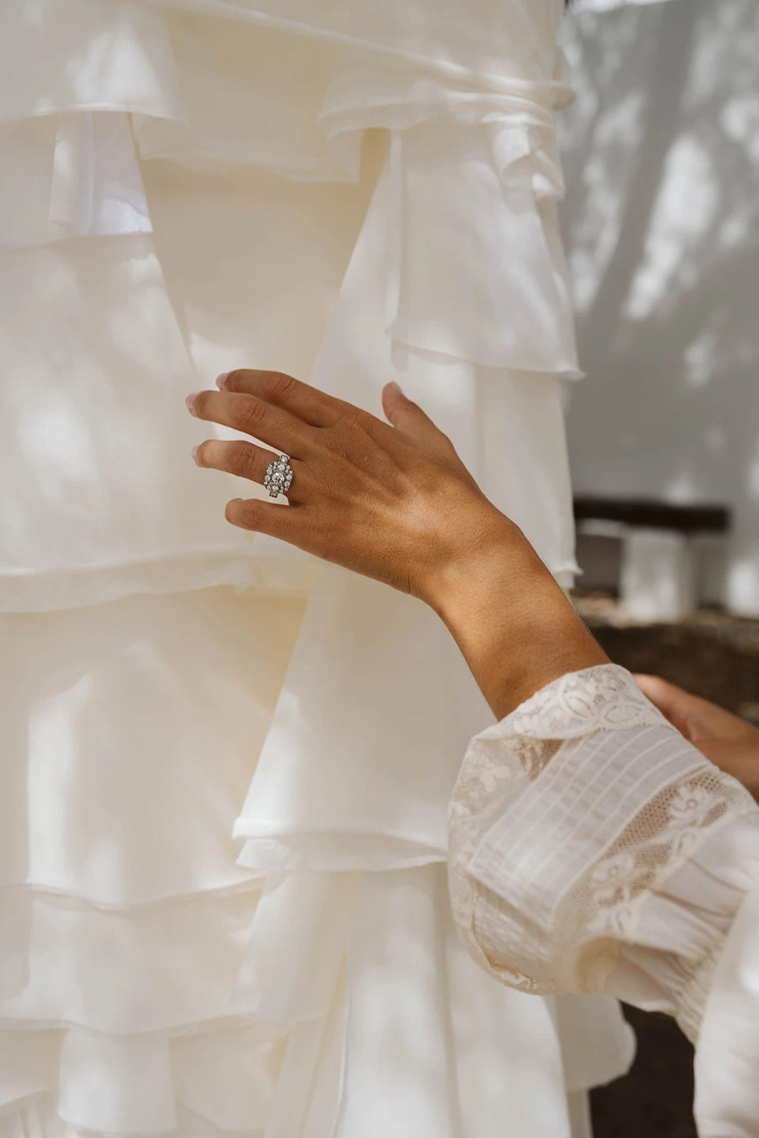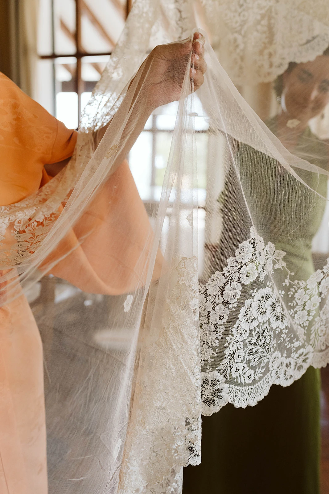 «Los pendientes en forma de flor de lis eran una adaptación de una botonadura de mi bisabuelo. También me puse el anillo de Javier Zuloaga que me regalaron los padres de Iñigo en la pedida y en el pelo llevé una pulsera y un velo amantillado de mi bisabuela con encaje chantilly».