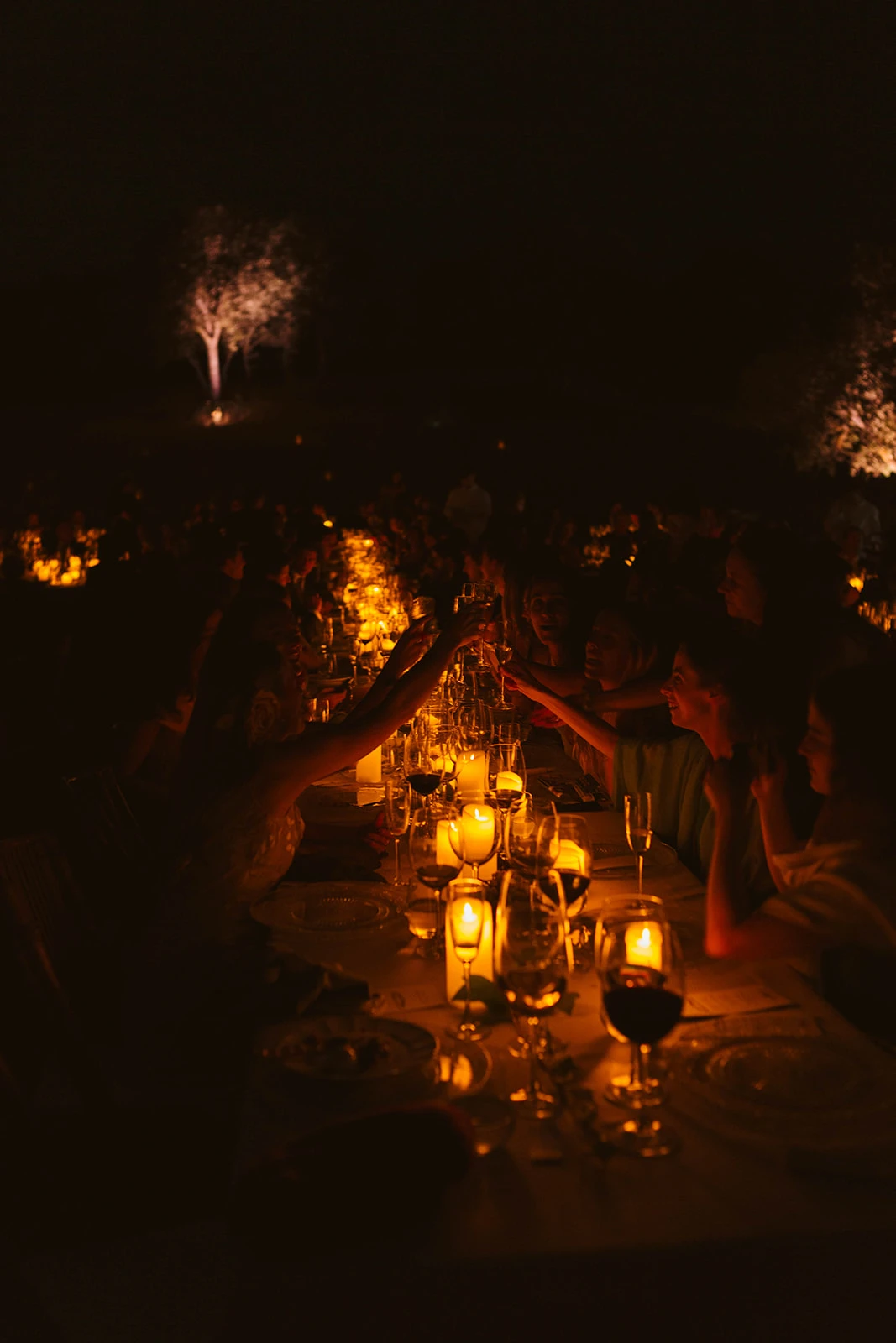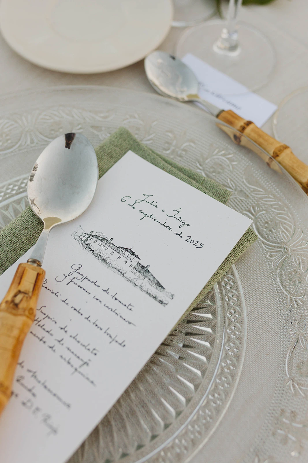 De la decoración también se encargó el vivero Las Jaras: «Fue idea de mi madre que los centros de mesa fueran hojas de parra con uvas y velas para iluminar la zona. Los meseros los escribí yo a mano y en el menú de las mesas puse un dibujo que hizo mi madre de la casa, ella fue la arquitecta».
