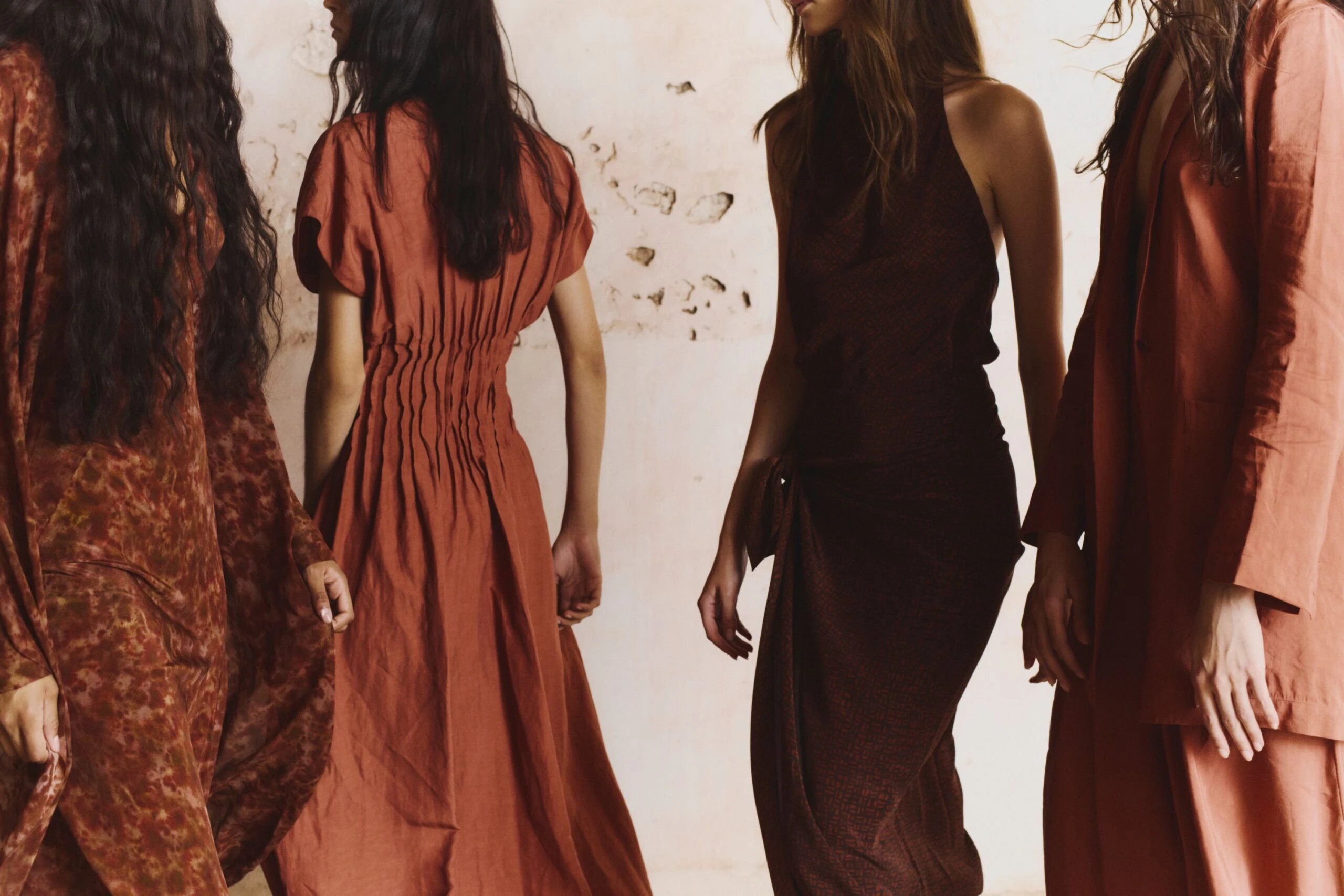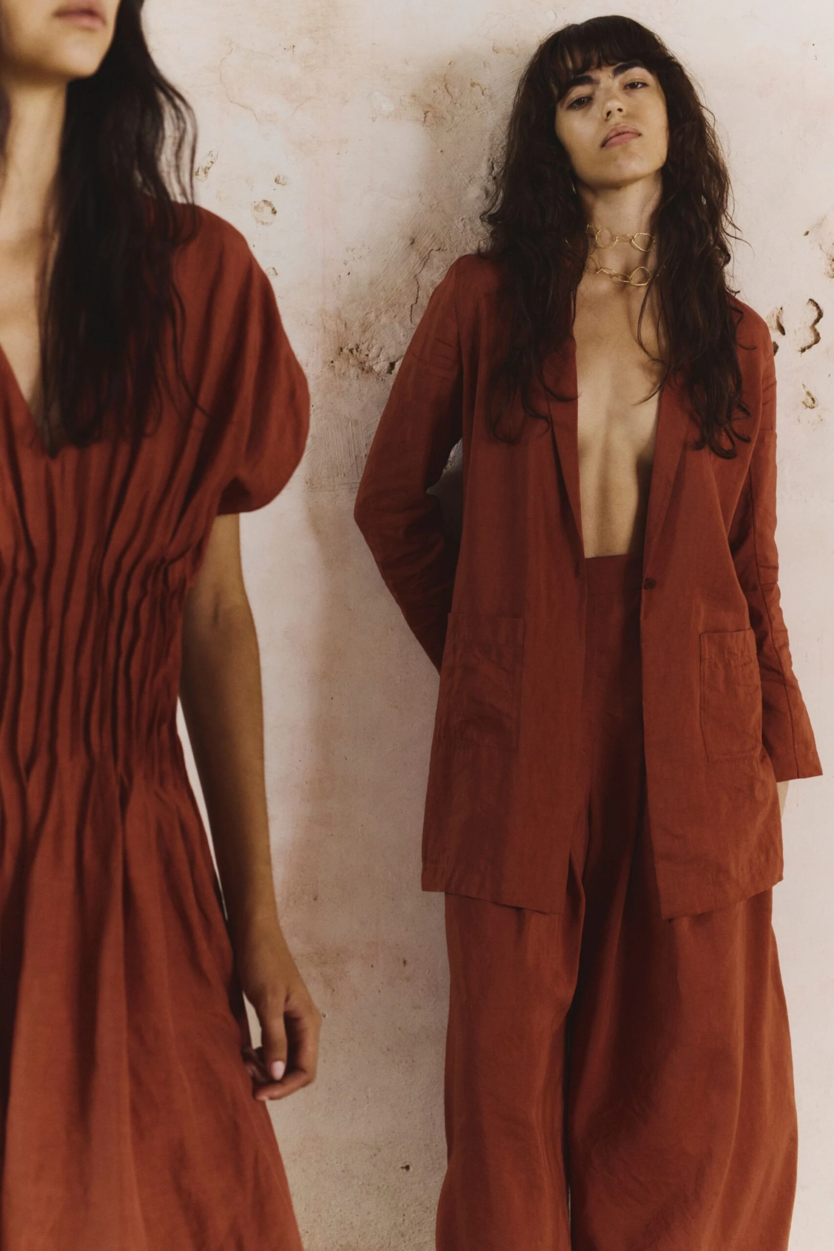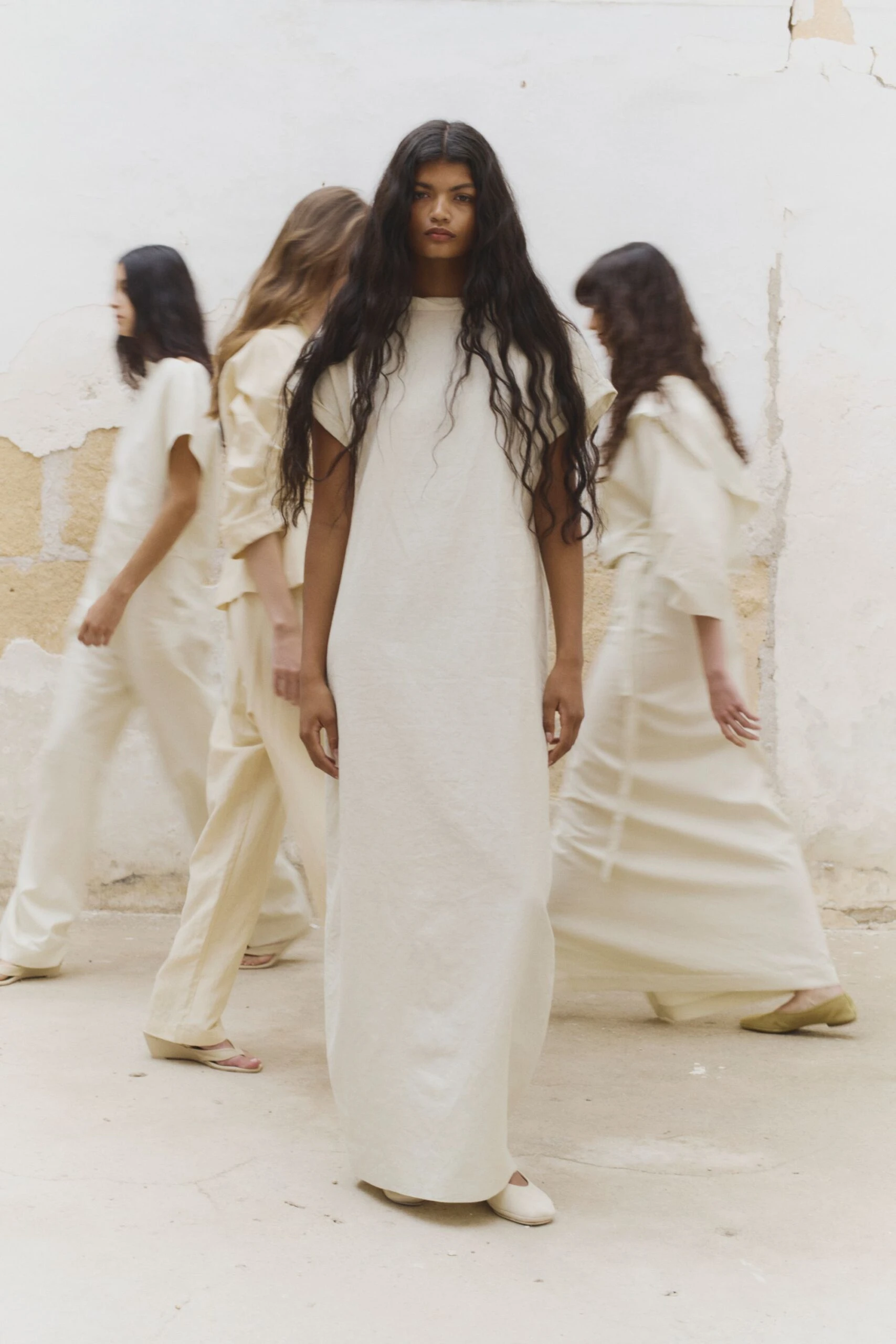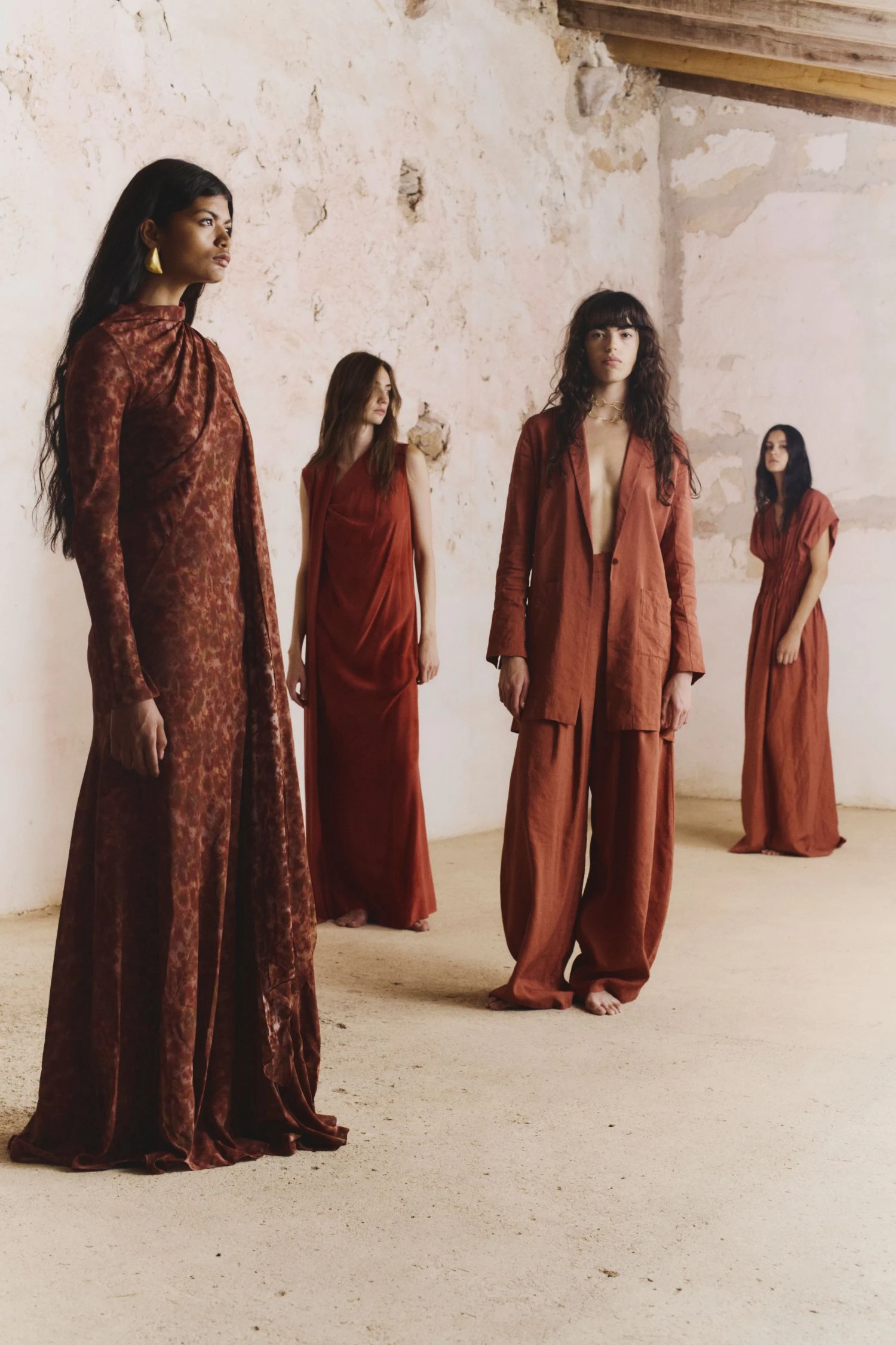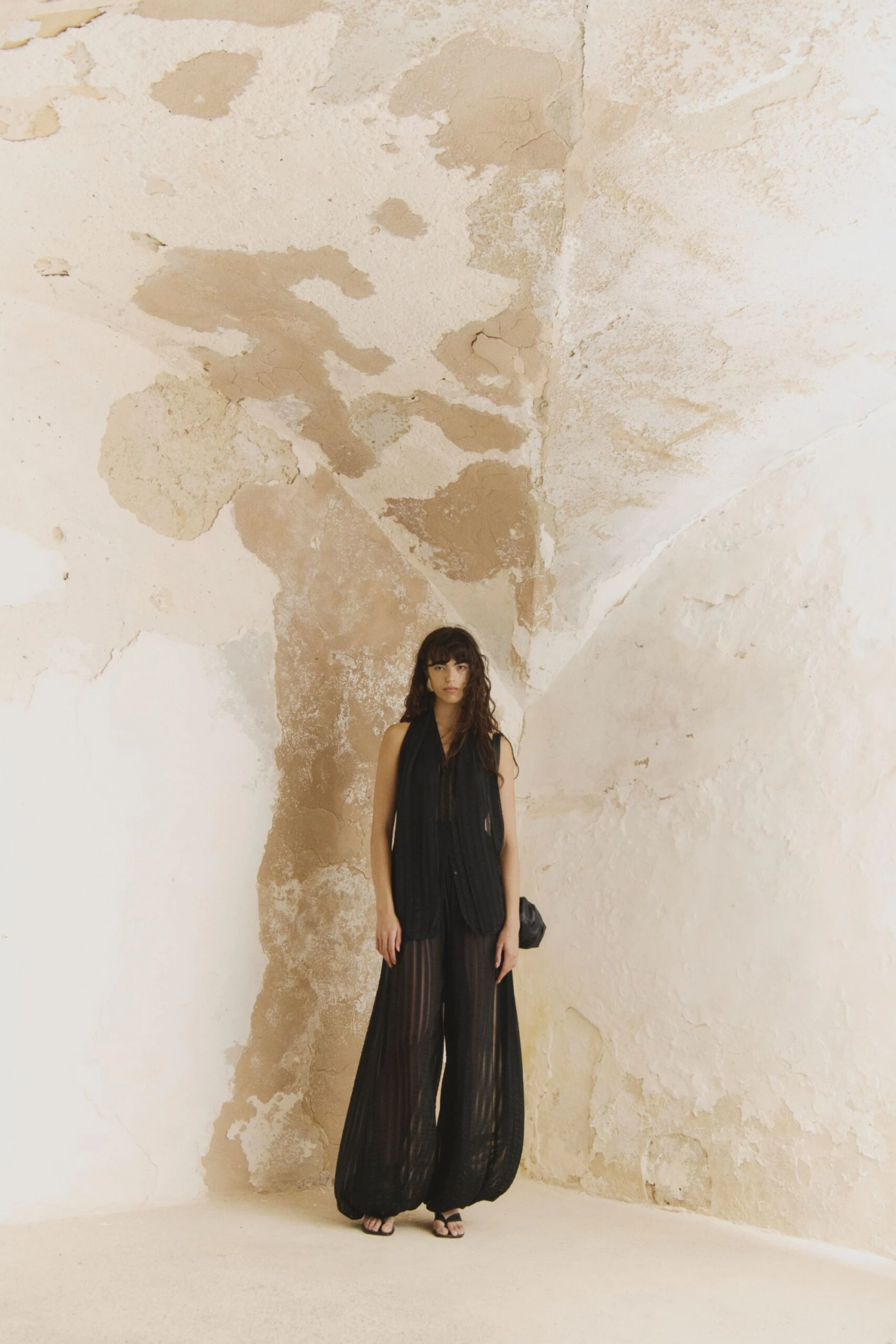 Construida a partir de tejidos con texturas, acabados maltinto, estampados de peces, verdes dorados y tonos coral que evocan un universo marino en la tierra, la paleta de colores fluye entre tonos vivos y cálidos: amarillos quemados, verdes tostados y ese negro de una noche de verano. Por su parte, las siluetas hablan de una feminidad libre, sugerente y natural: vestidos fluidos, tejidos con transparencias, cinturas marcadas y pantalones bombachos.
