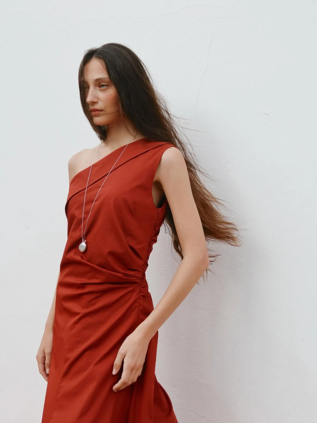 El vestido Nefertiti (189,95€) en color teja de Himba Collection es la máxima expresión de elegancia para una invitada que busca destacar. Su diseño largo se caracteriza por un cuello asimétrico y un cuerpo drapeado lateralmente, creando una silueta fluida y femenina que estiliza la figura de forma espectacular. Combina a la perfección con accesorios dorados para eventos de tarde o noche.