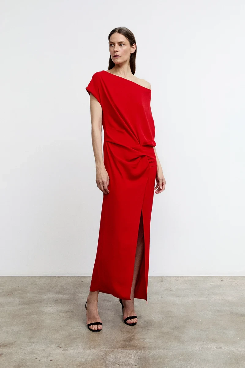 Para las fans de Cortana, el vestido Onara (1.145€) realizado en un tejido strecht de seda. Largo al bies con escote asimétrico y falda con lazada incorporada que se cruza y se ata a la cintura.