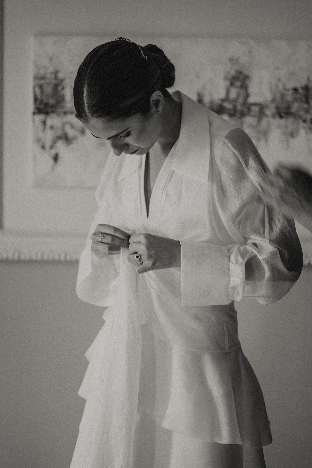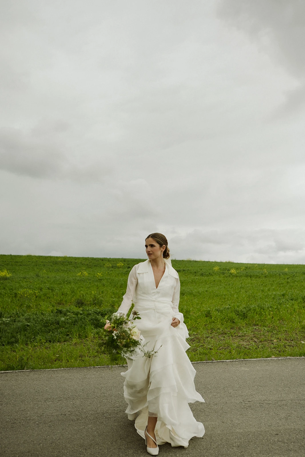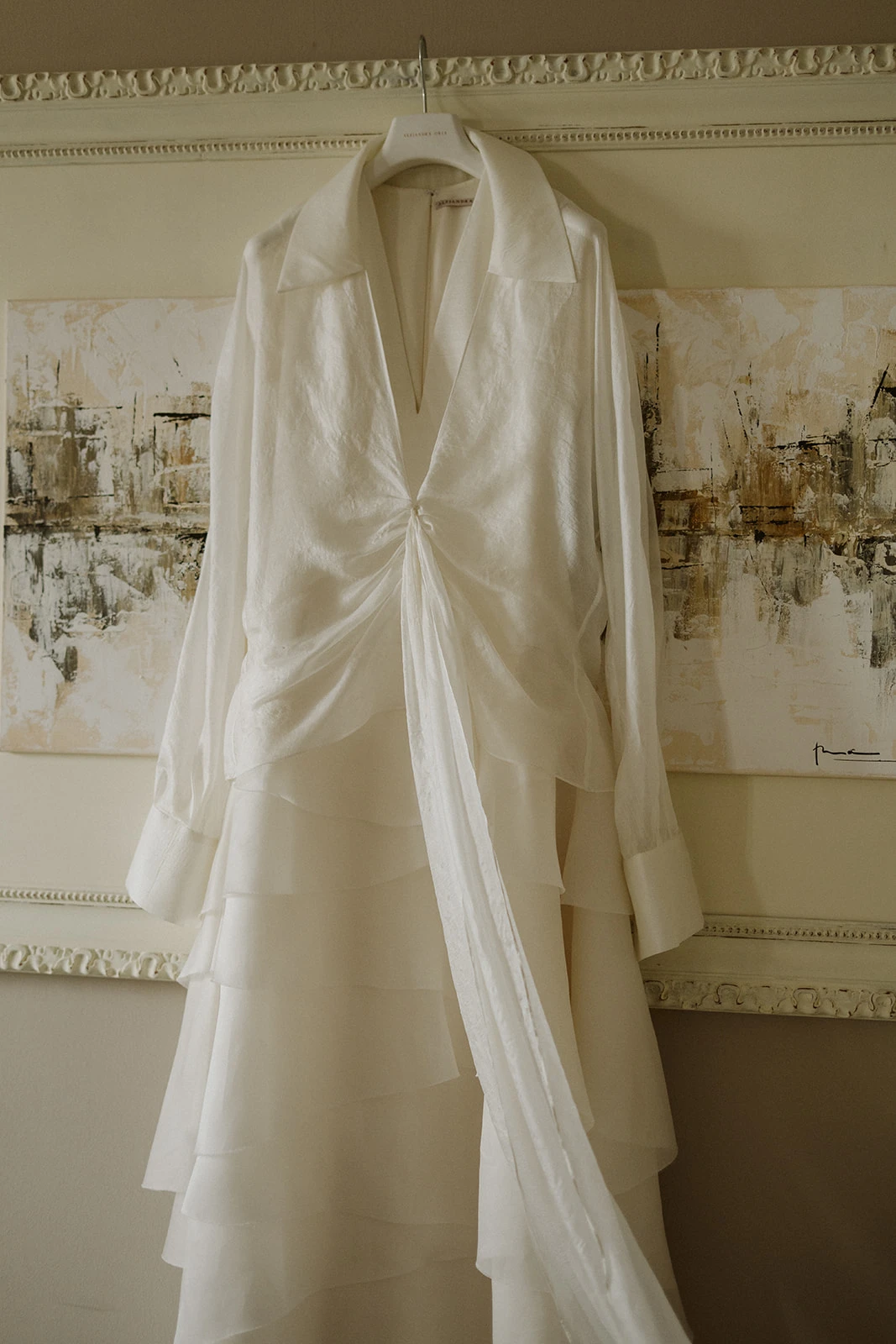 «Me daba mucho miedo el proceso del vestido de novia porque no tenía ni idea y aún sigo flipando en como, a la media hora de conocernos, Alejandra Oria me propuso algo que era tan yo. Sin perder elegancia, la mezcla perfecta entre tradición y masculinidad fue un vestido de lino de seda y volantes de organza que combiné con una camisa de gasa por encima».