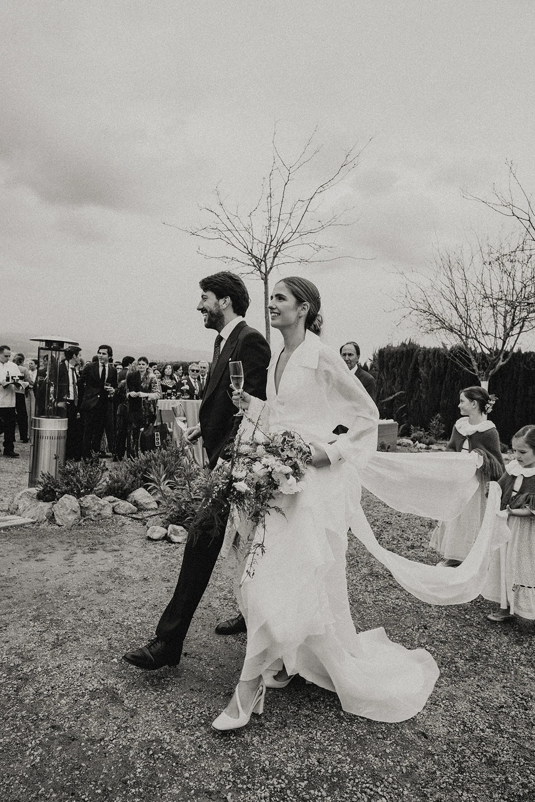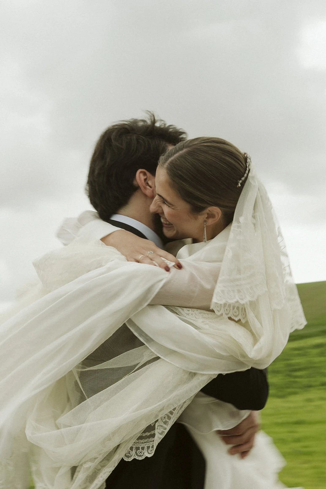 «La joya de la corona fue el velo bordado, enganchado en el pelo a la pulsera de pedida de mi abuela». Paloma también llevó dos anillos, uno con el que Juano le pidió matrimonio y diseñó junto a Romu y otro que le regaló su testigo de M de Paulet. Los pendientes se los regaló su suegro en la pedida y en los puños de la camisa llevaba unos gemelos de su padre.