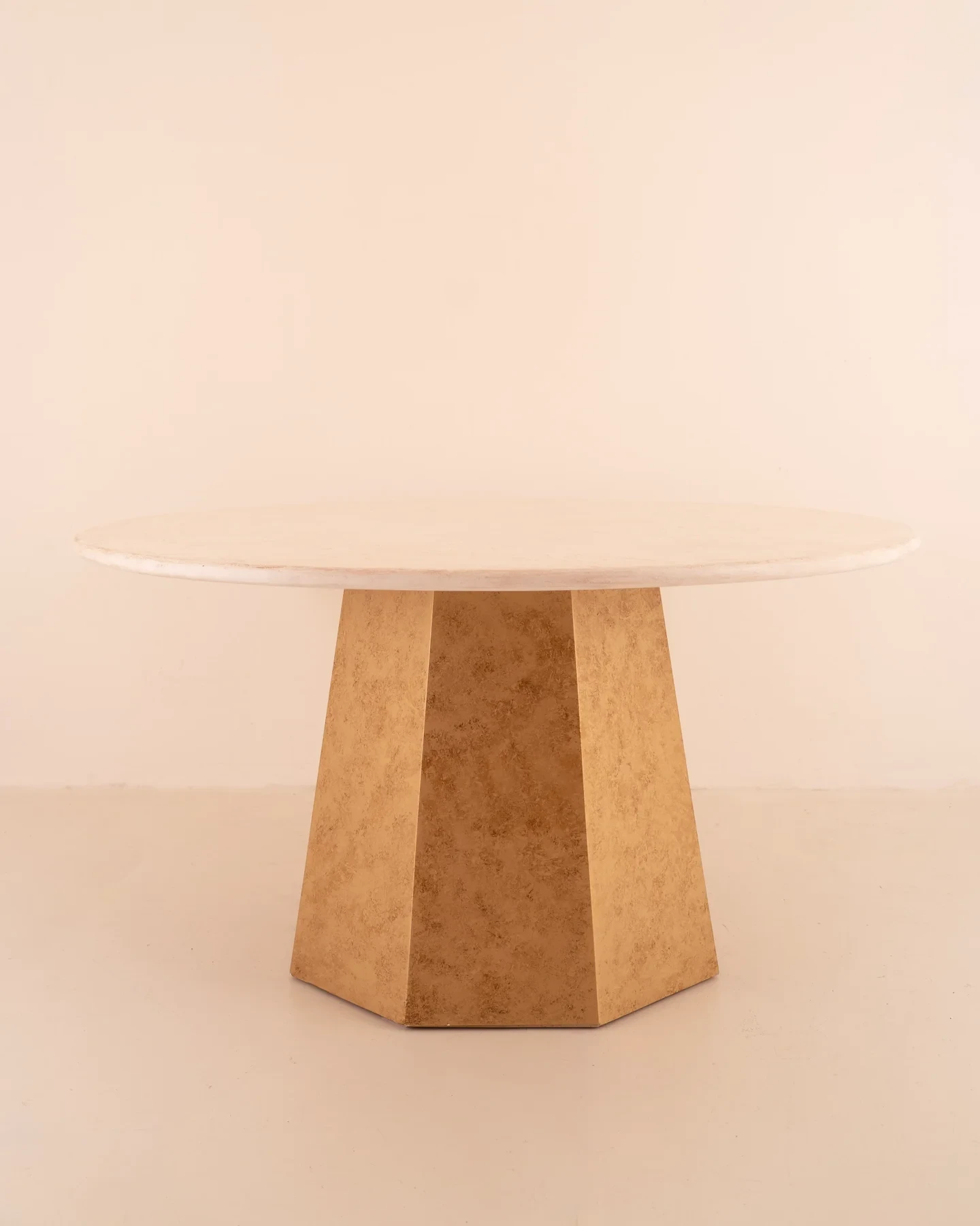 Si buscas una mesa diferente en tu comedor, esta con pie geométrico acabado en dorado envejecido y tapa redonda con efecto Gesso. Otra opción de la marca que también se puede personalizar.