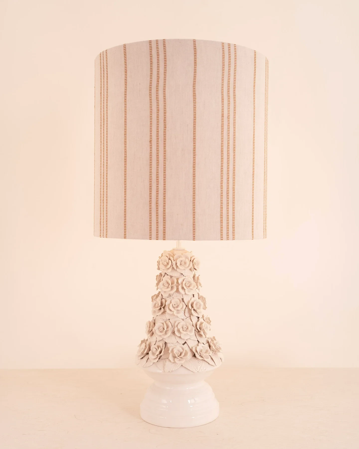 Una lámpara de lino con rayas en tono beige y tostada, ideal para combinar con otras lámparas de porcelana. Pregunta al servicio de personalización de Borgia Conti para otras medidas.