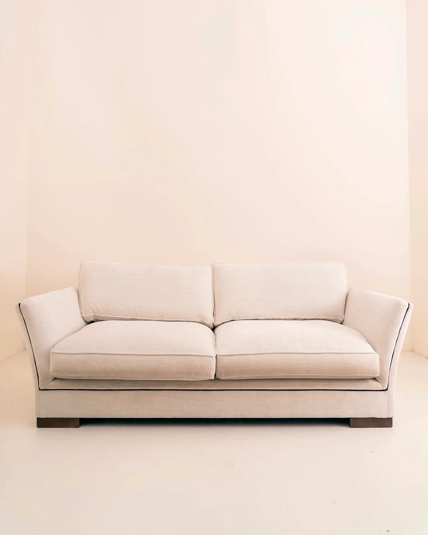 Si sois el grupo de amigas de la novia, este sofá a medida tapizado en tela aqua clean de color beige en el que podréis hablar durante horas. El toque definitivo es su forma de brazos en color negro.
