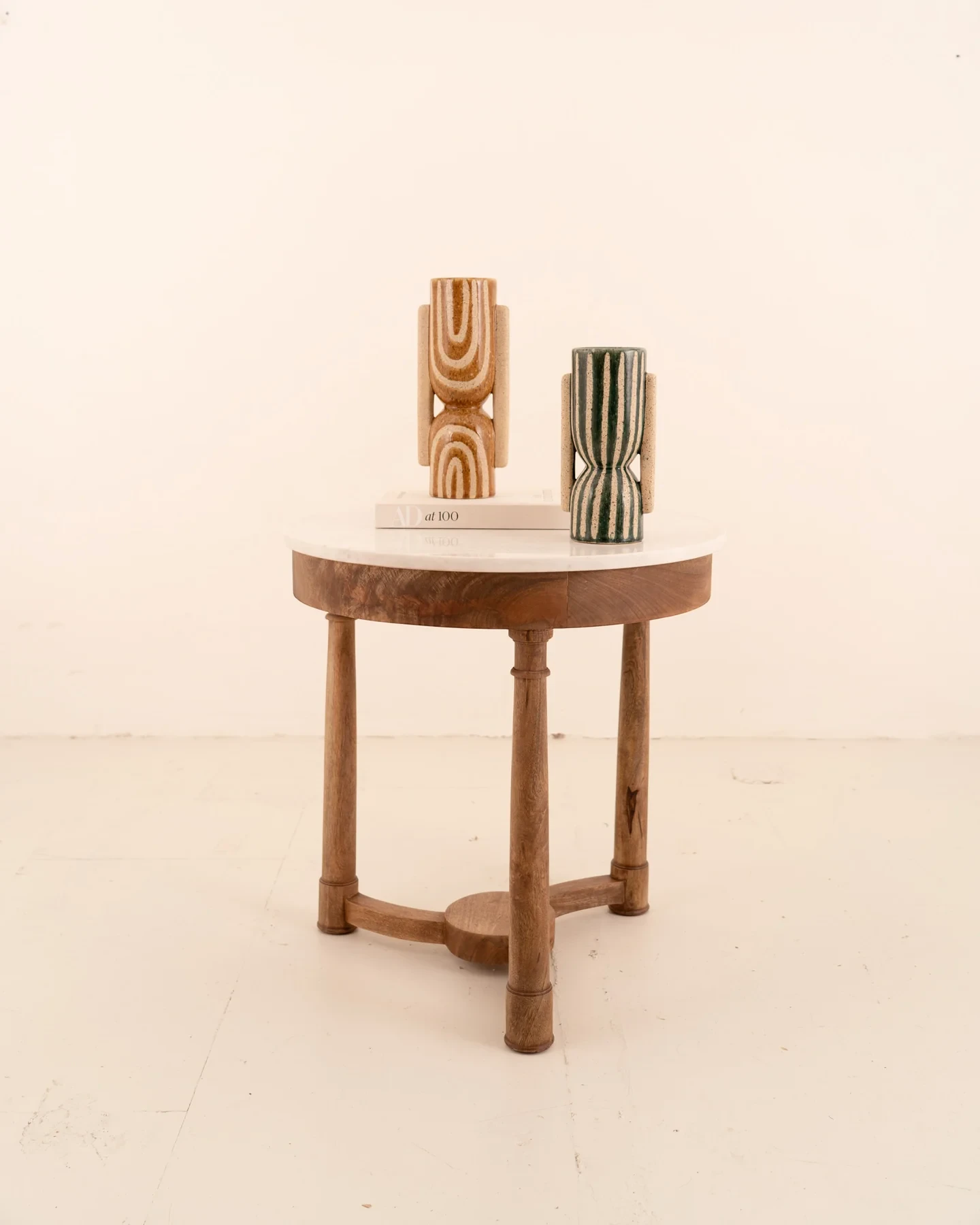 ¿Eres amante de lo clásico? Este velador, fabricado en madera de mango con acabado colonia y tapa circular en mármol blanco, es una apuesta elegante y atemporal.