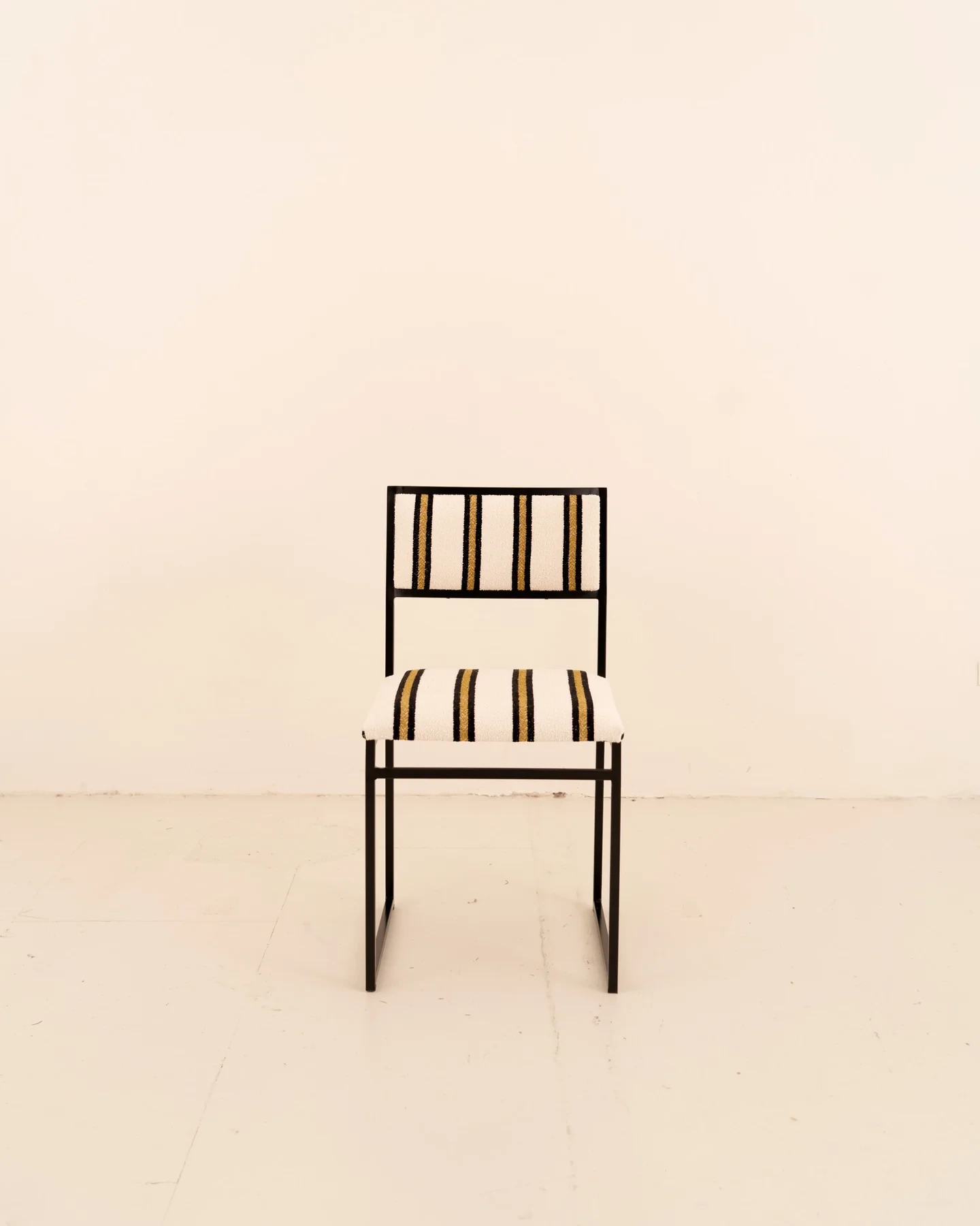 Silla con estructura en hierro negro y asiento con tela de rayas verticales en blanco, mostaza y negro. Un diseño clásico y elegante que también vale para zonas exteriores ¿Y si cada amiga le regala una silla a la novia?