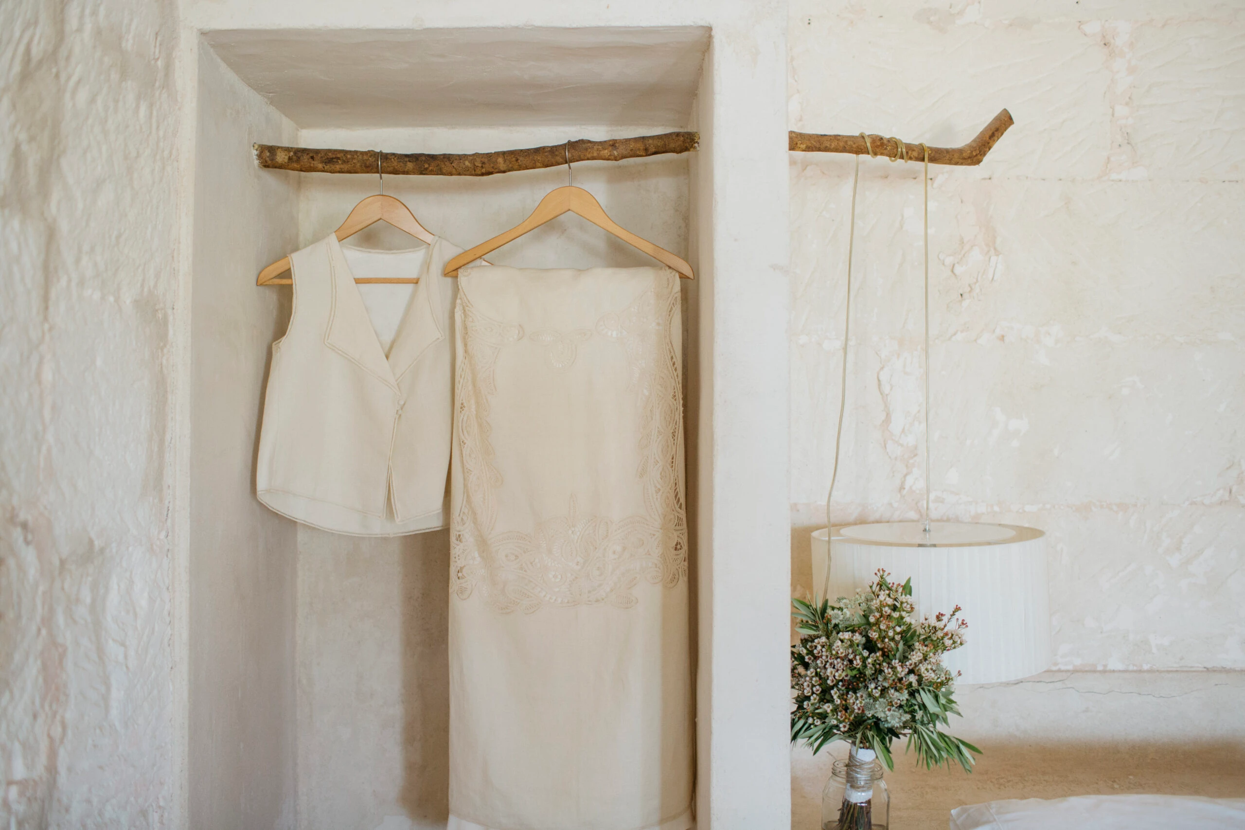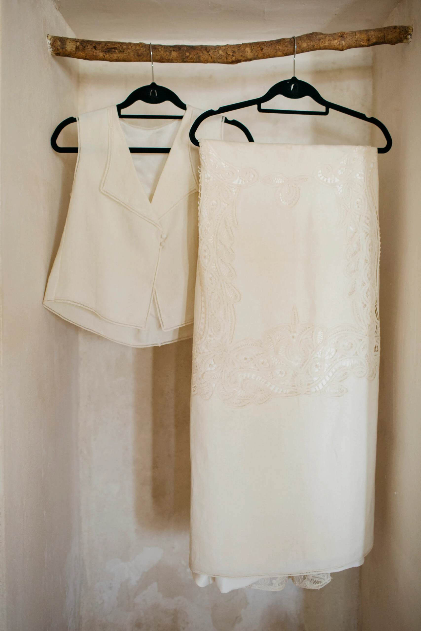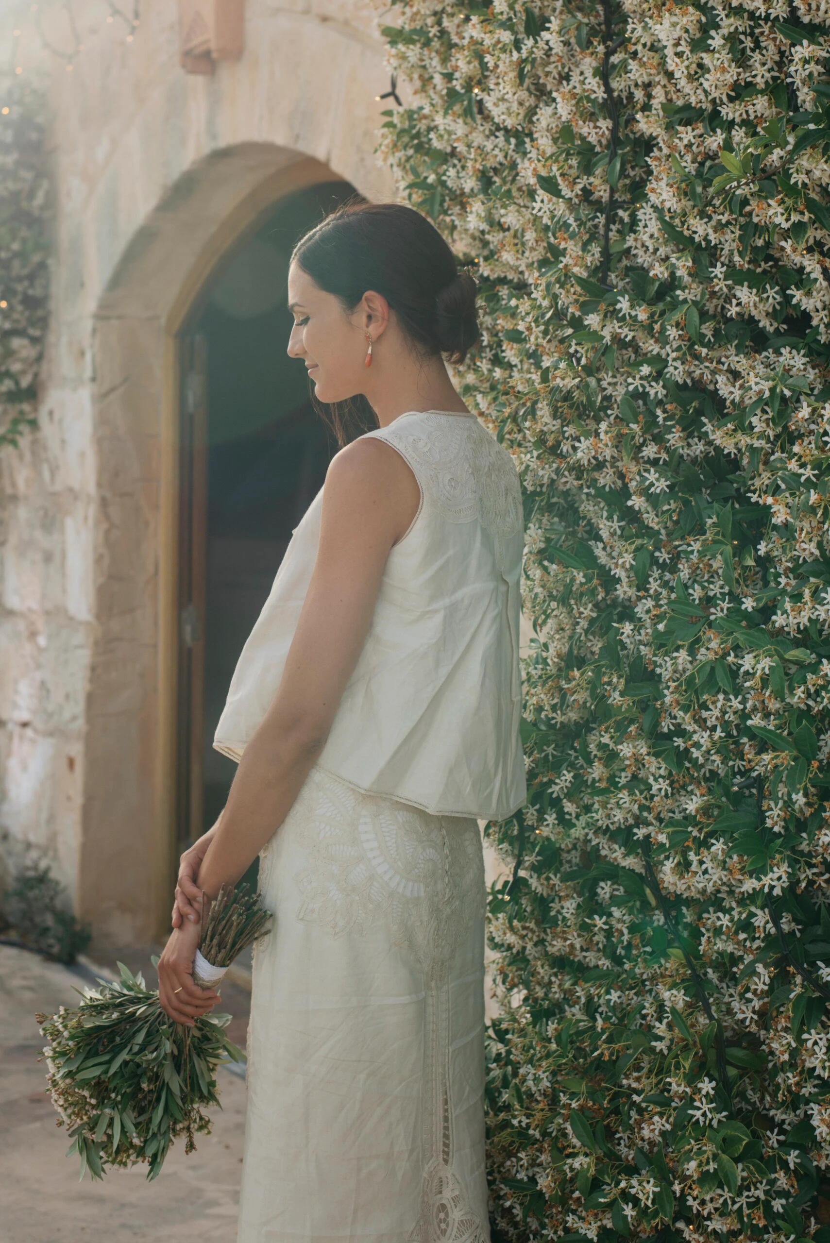 El vestido lo diseñó Flor Fuertes: «Tuve una conexión muy especial con ella desde el primer día y ambas quisimos encontrar algo que fuese ligero, por eso optamos por un dos piezas hecho con una mantelería antigua de lino lavado y bordados preciosos que Flor encontró en un anticuario. El top me lo sigo poniendo religiosamente cada 9 de junio».