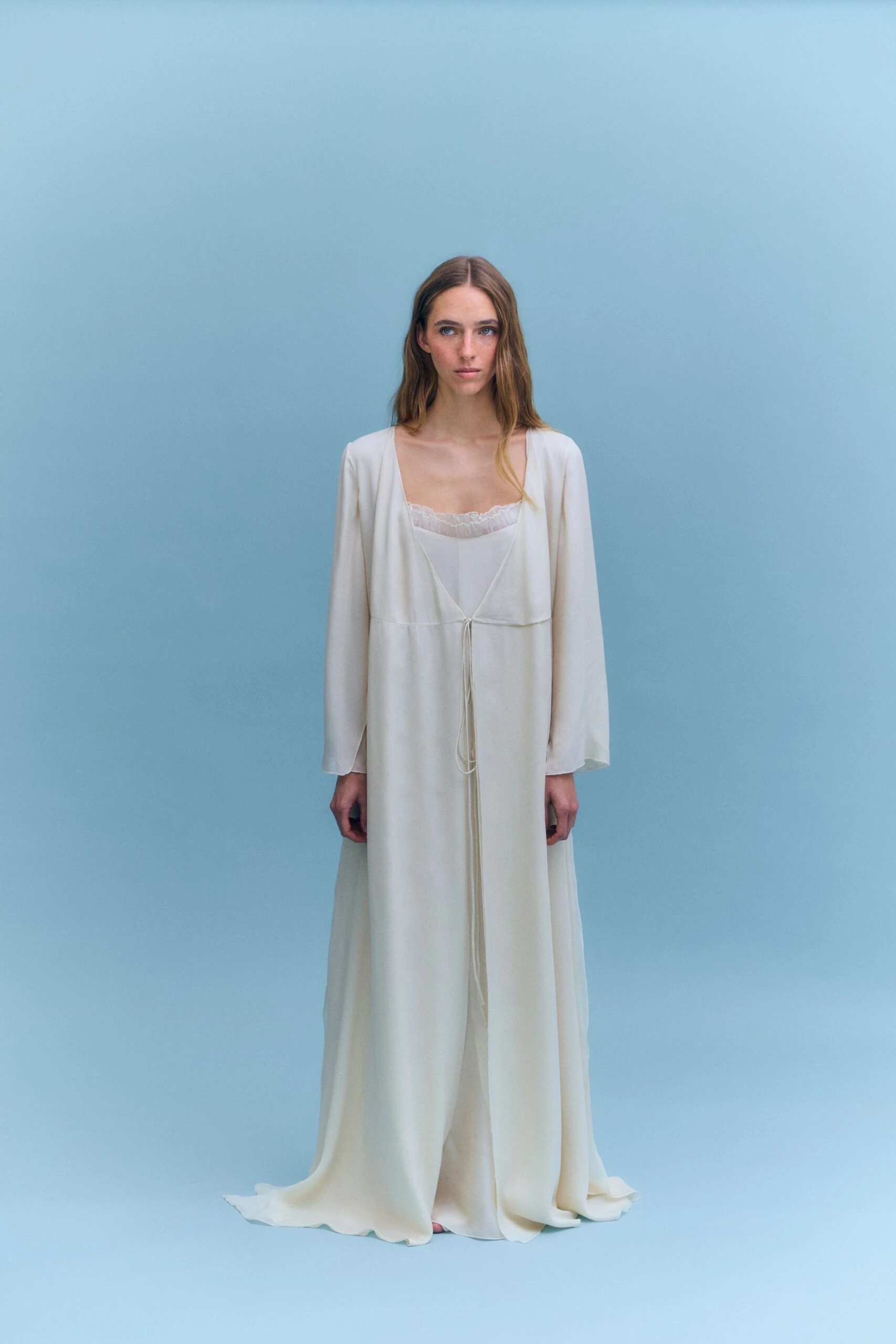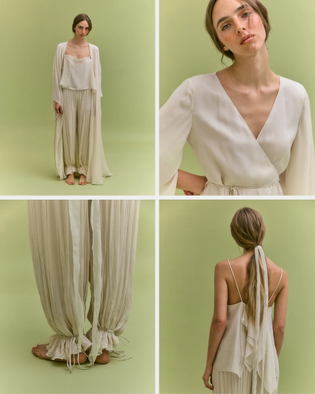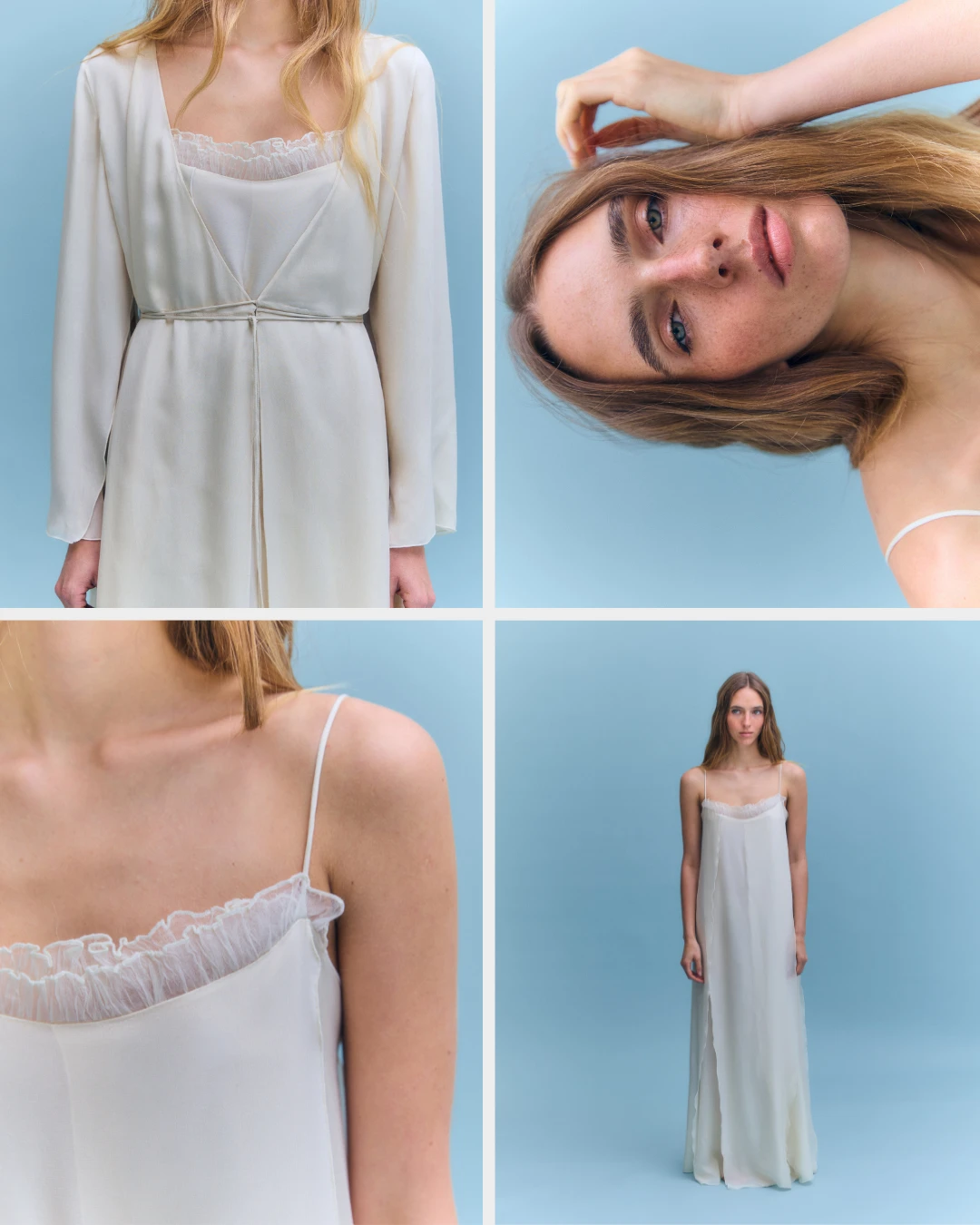 Ambos productos están confeccionados en crespón ligero color marfil y aportan un aire romántico. El camisón, un diseño fluido con capas asimétricas y volantes sutiles en la parte frontal, tiene escote en V y tirantes finos. El escote de la bata, de mangas amplias tipo kimono con abertura lateral, detalle de lazos finos y un cierre cruzado con lazada, es en pico.