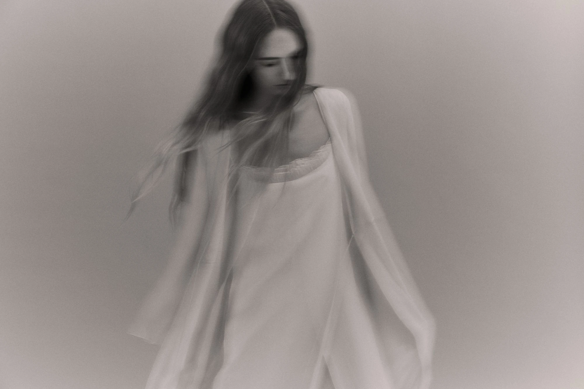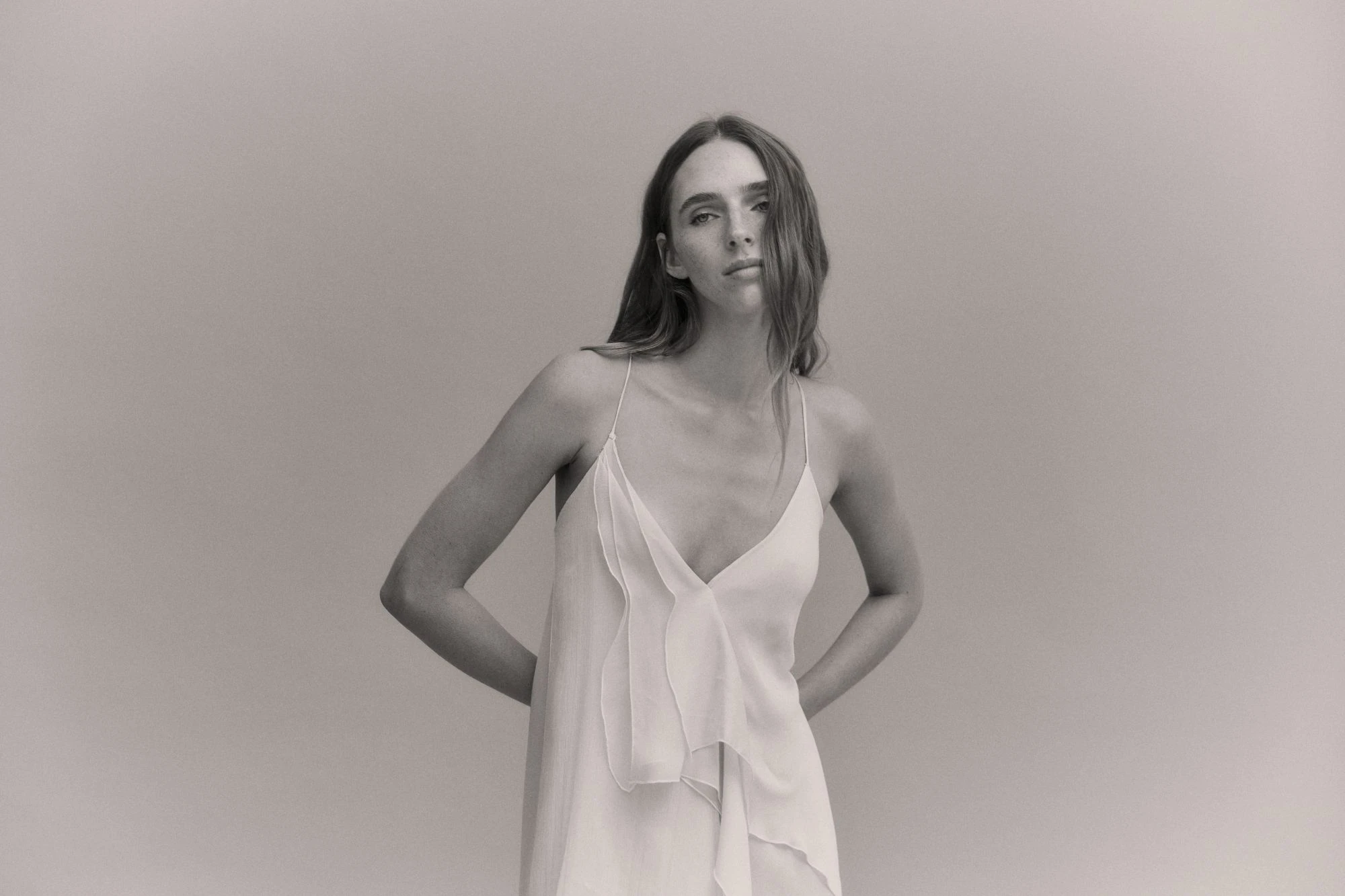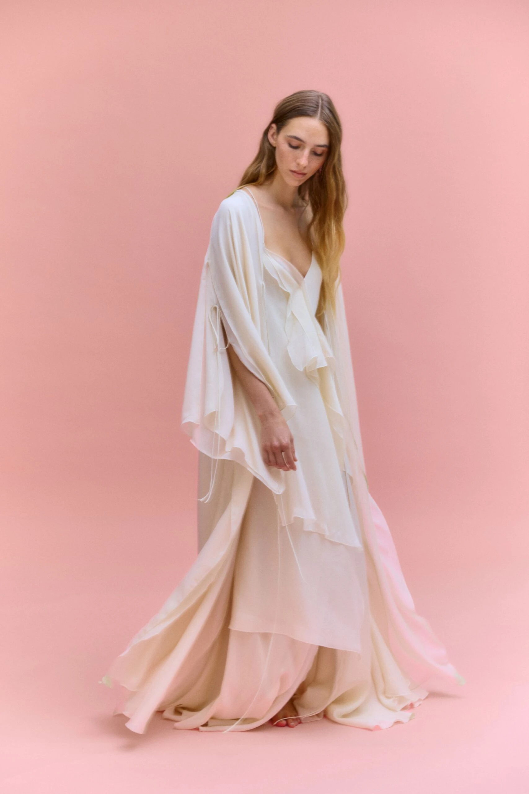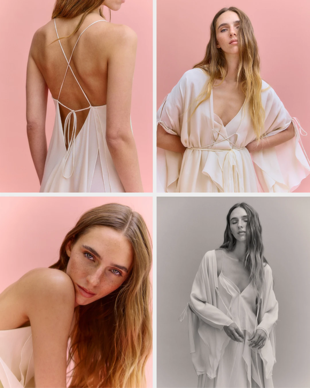 Ambos productos están confeccionados en crespón ligero color marfil y aportan un aire romántico. El camisón, un diseño fluido con capas asimétricas y volantes sutiles en la parte frontal, tiene escote en V y tirantes finos. El escote de la bata, de mangas amplias tipo kimono con abertura lateral, detalle de lazos finos y un cierre cruzado con lazada, es en pico.