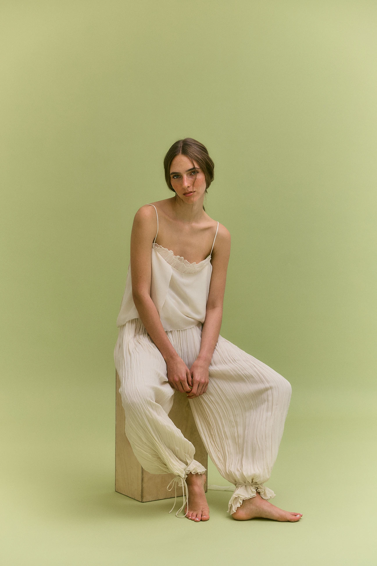 Top de escote recto y detalle de seda en el escote rematado con tirantes finos. El pantalón, con efecto plisado y pernera acabada en lazos ajustables, aporta la versatilidad de poder llevarlo abullonado o suelto. También confeccionado en crespón color marfil, su silueta amplia lo convierten en una pieza elegante y sofisticada.