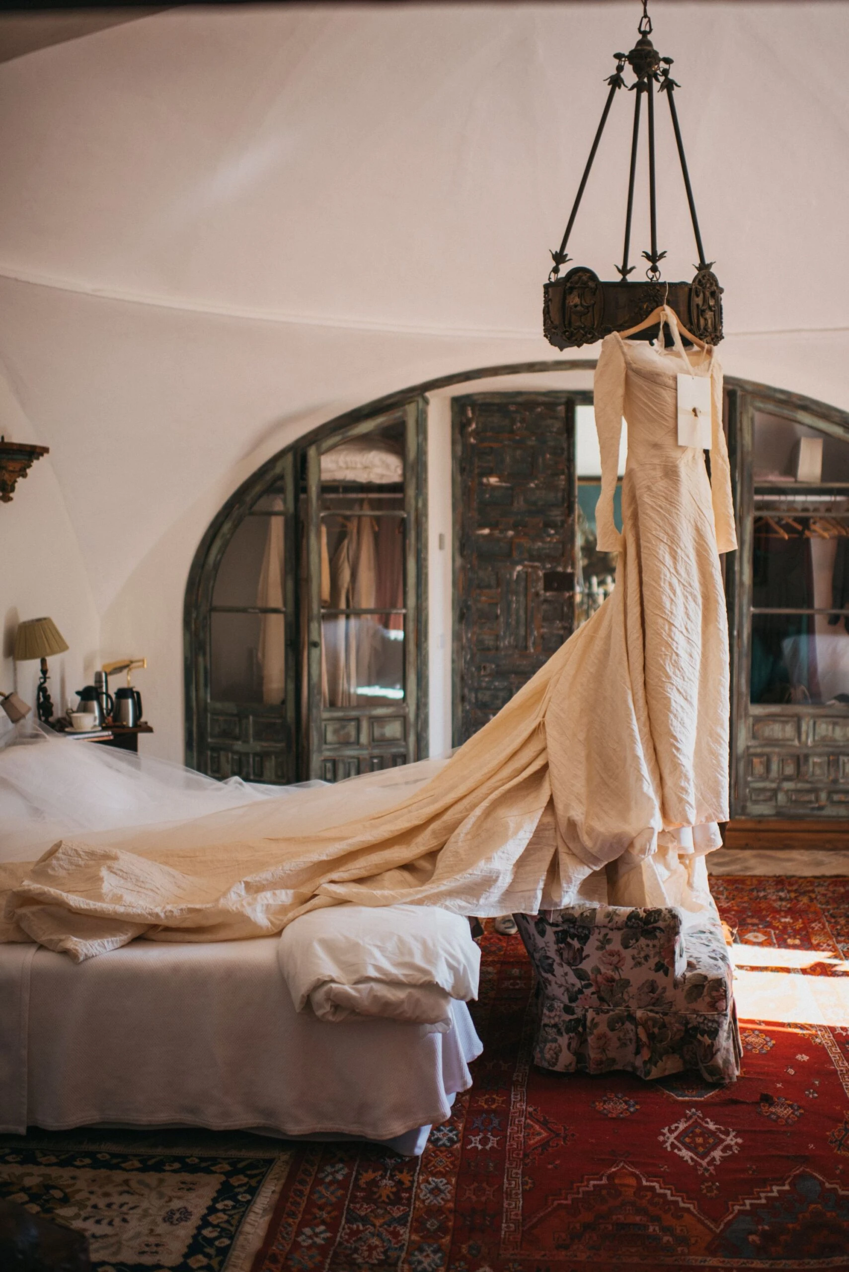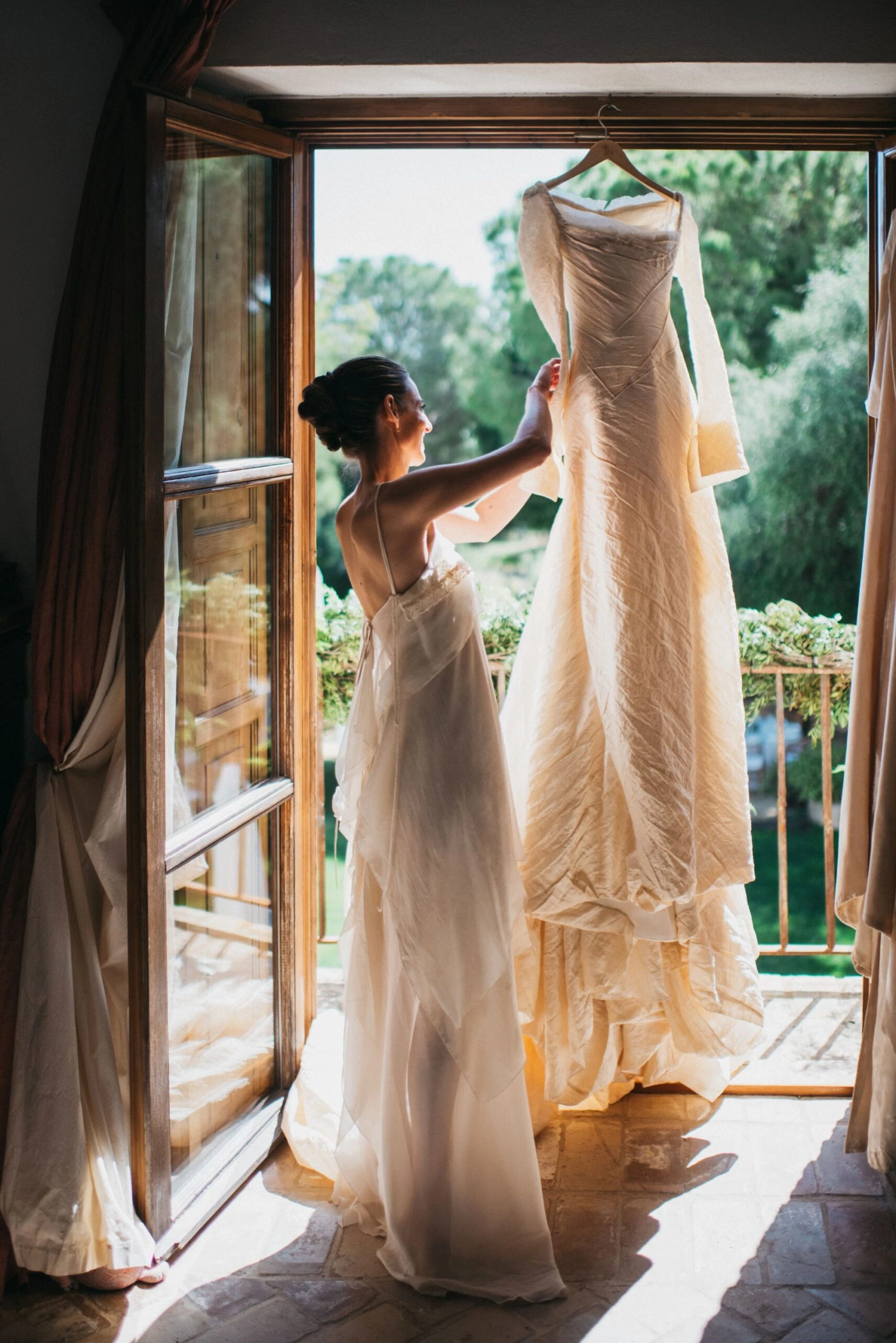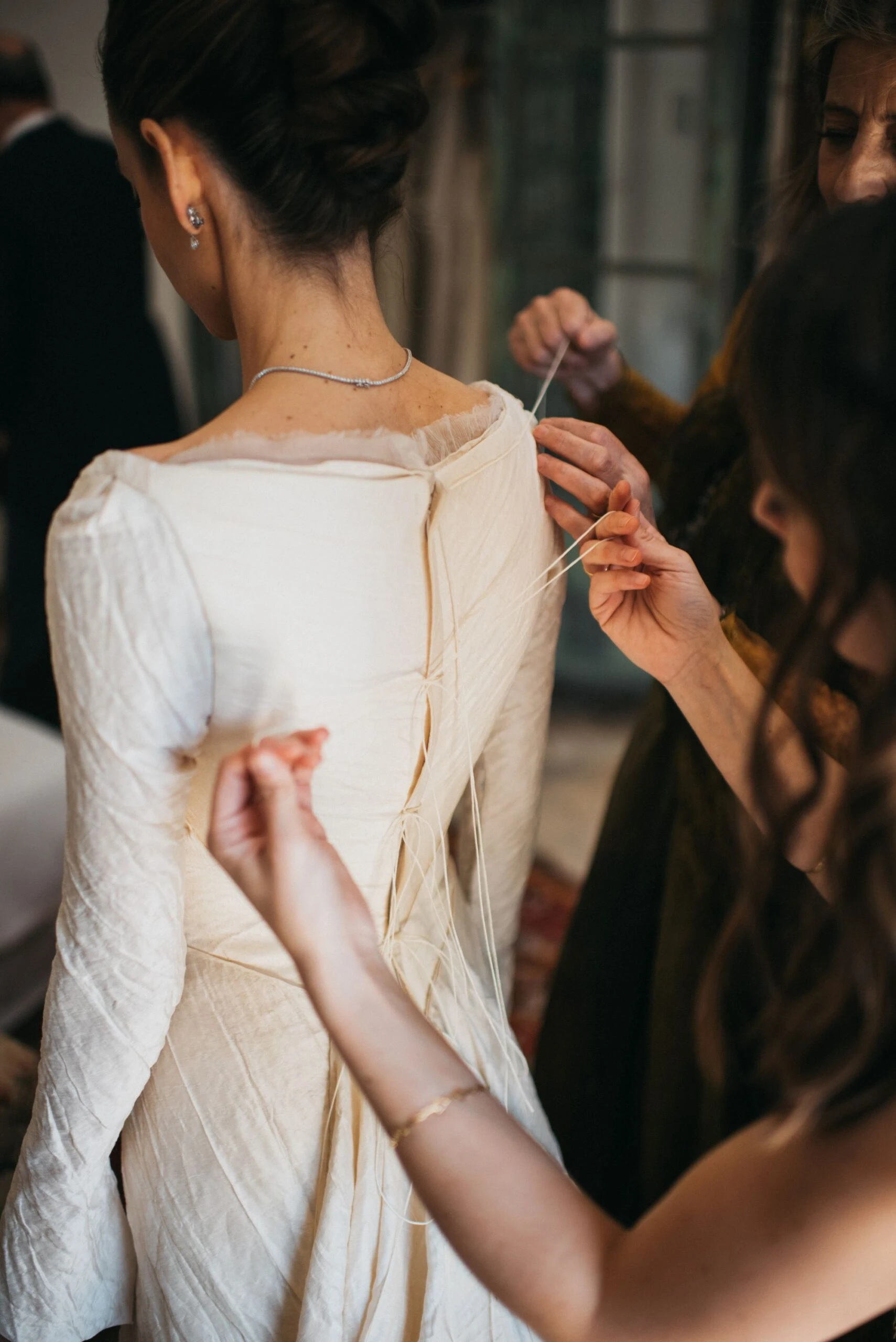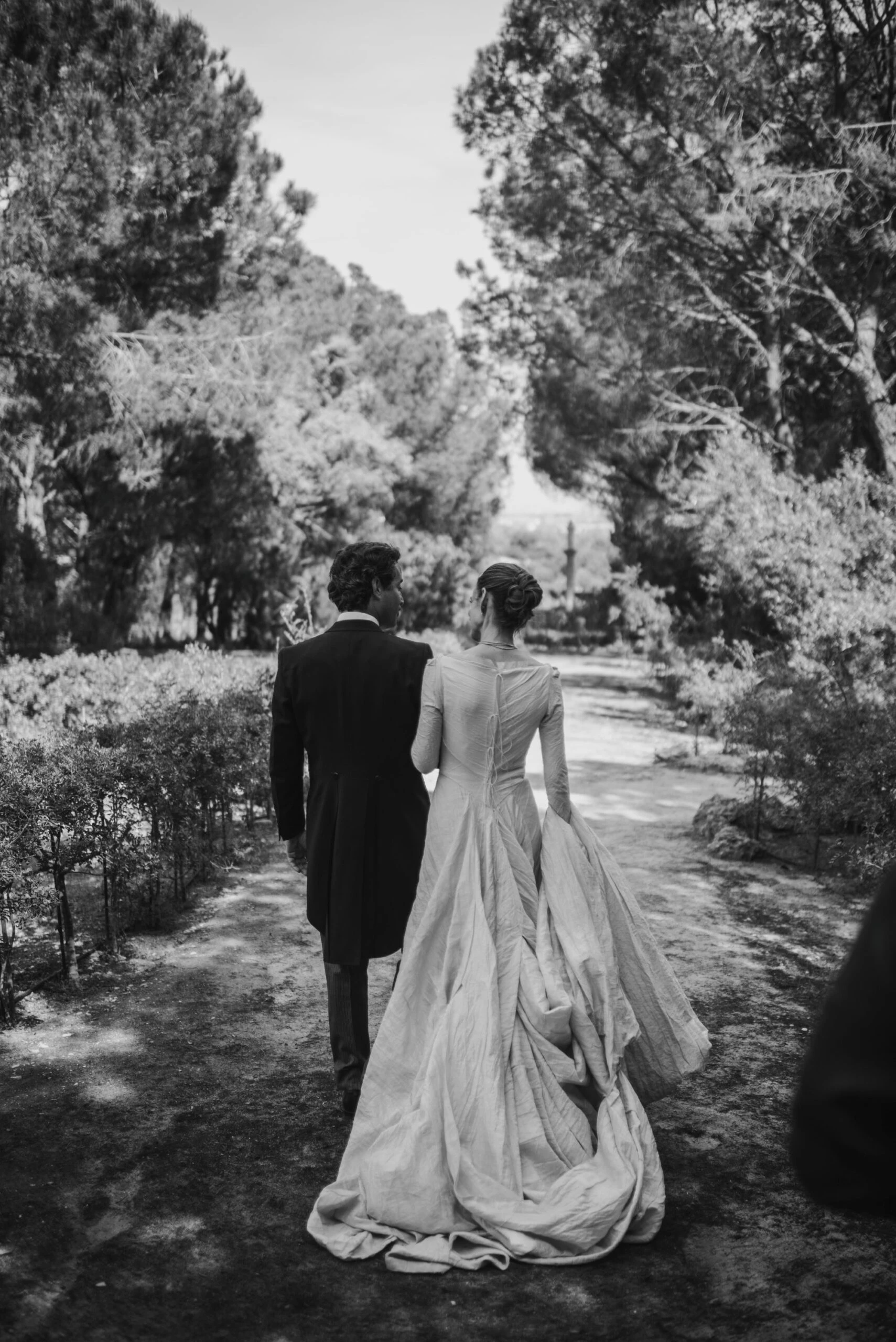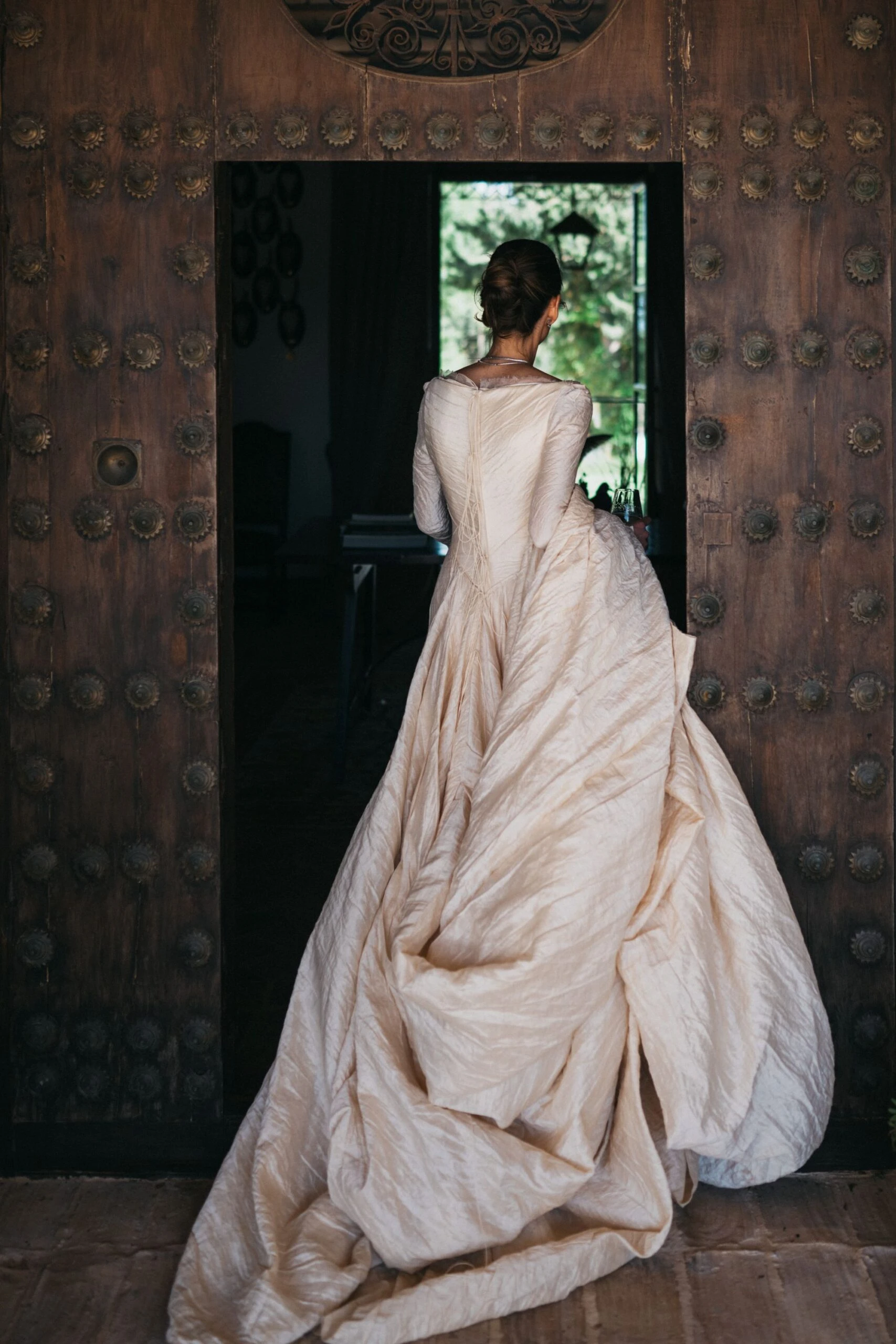 El vestido — como no podía ser de otra manera — lo hicieron ‘en casa’ en el taller de T.ba Brides: «Lo único que le pedí a Sol es que me hiciera un vestido al que le pudiese cortar las mangas y la cola. Tiene una habilidad muy especial para saber que es lo que te favorece y, a los pocos días de contar que nos casábamos, me presentó una idea hecha y me encantó. El mayor reto de todos fue encontrar un hueco para hacerme las pruebas, pero entre reuniones y citas de otras novias bajaba corriendo al showroom e improvisábamos como podíamos».