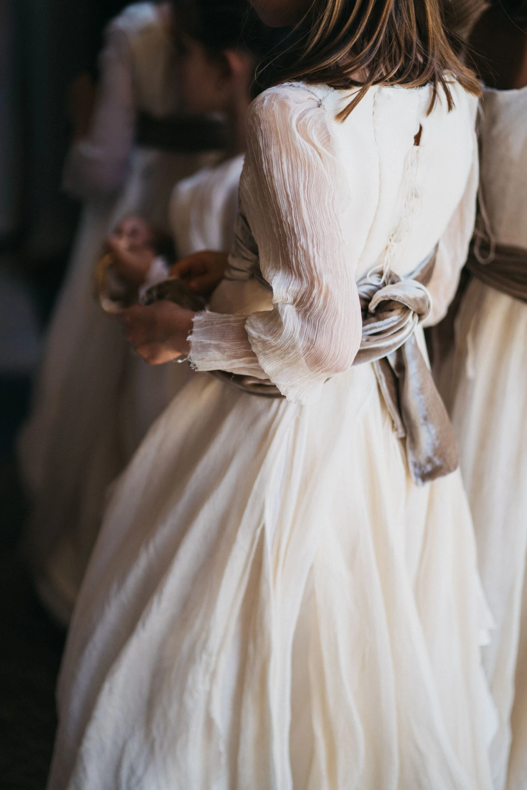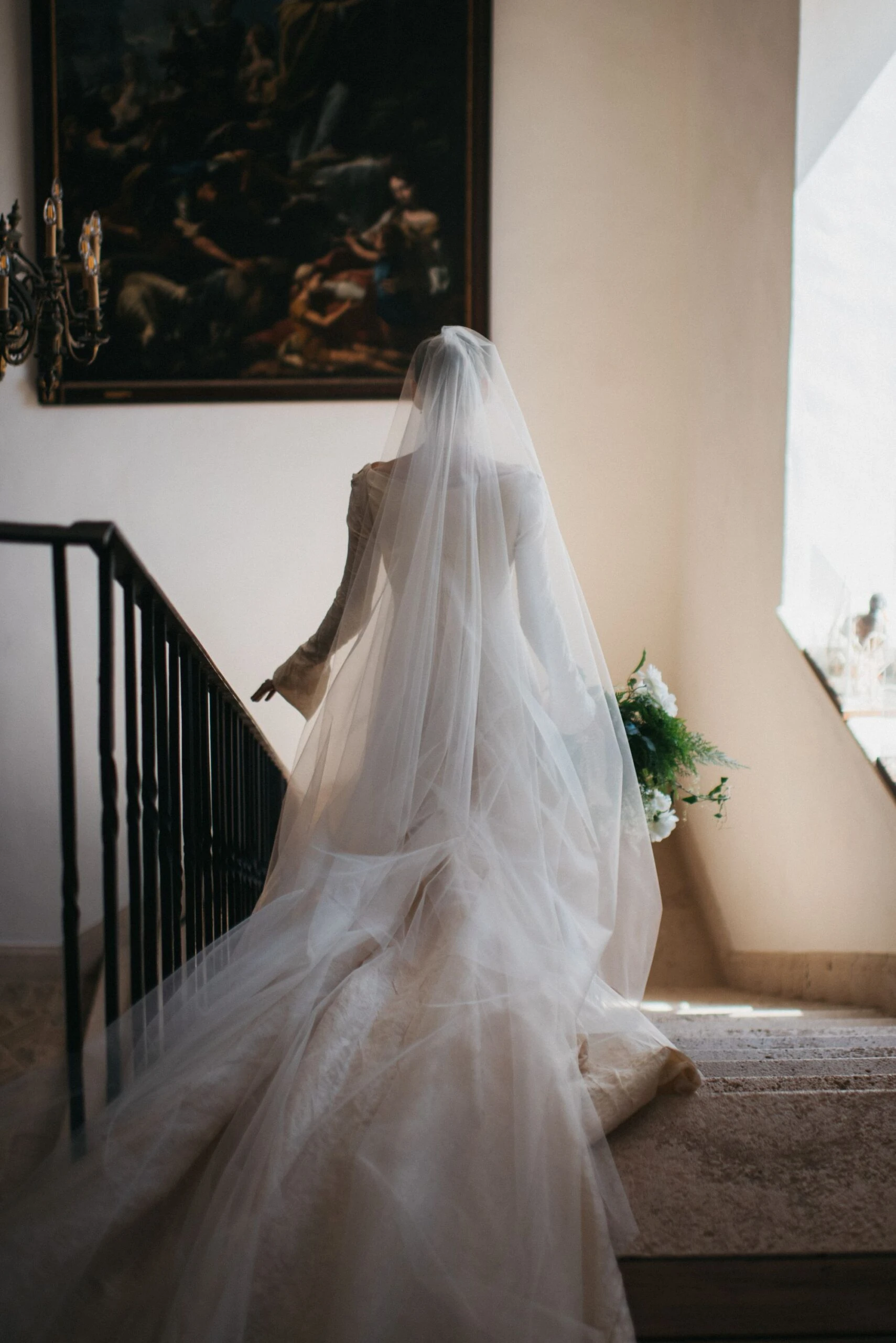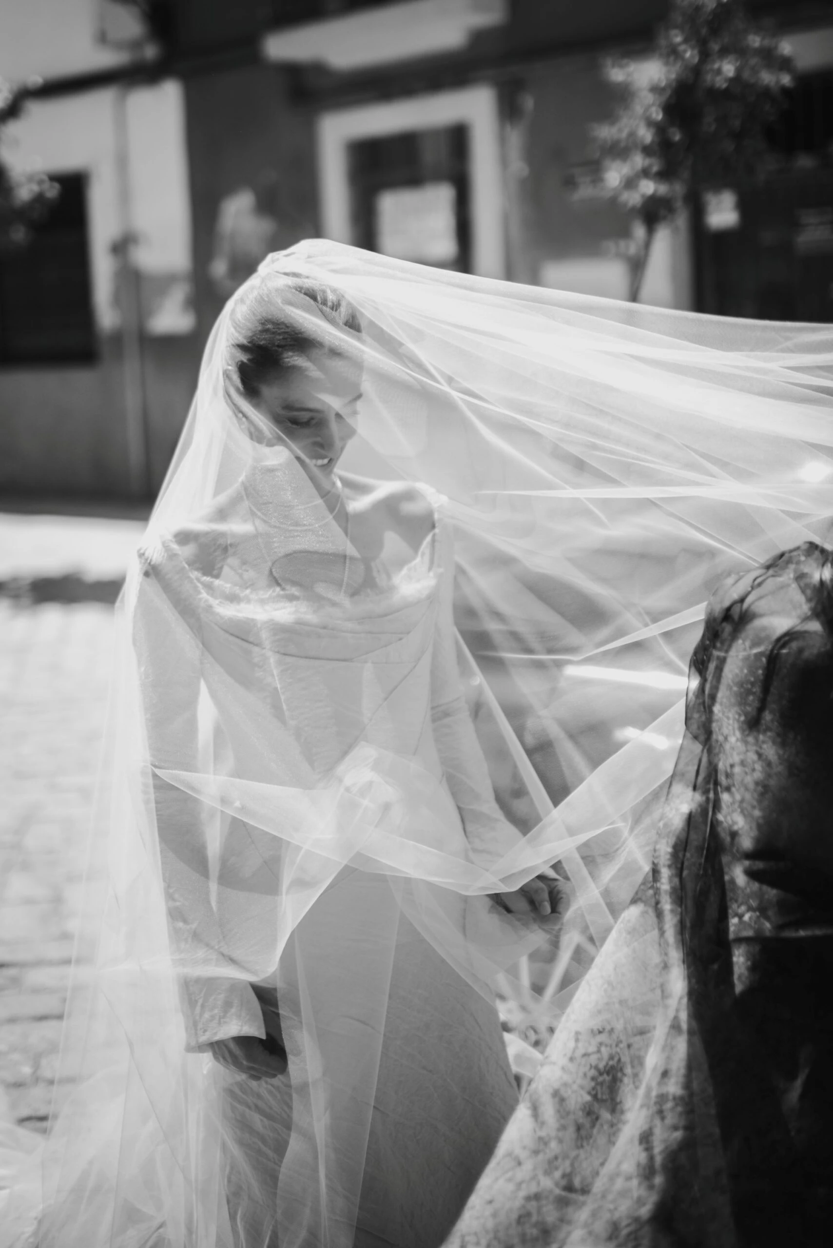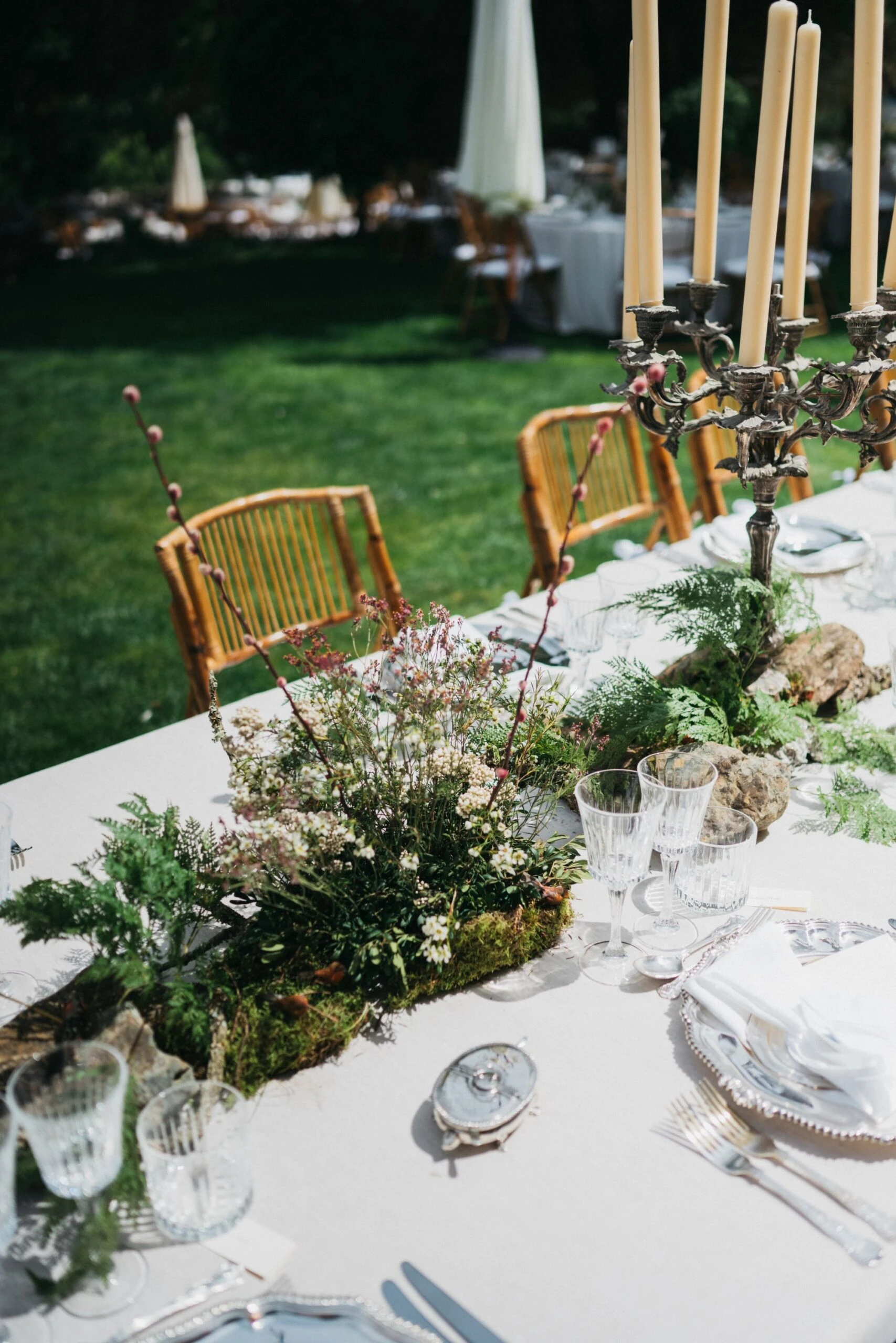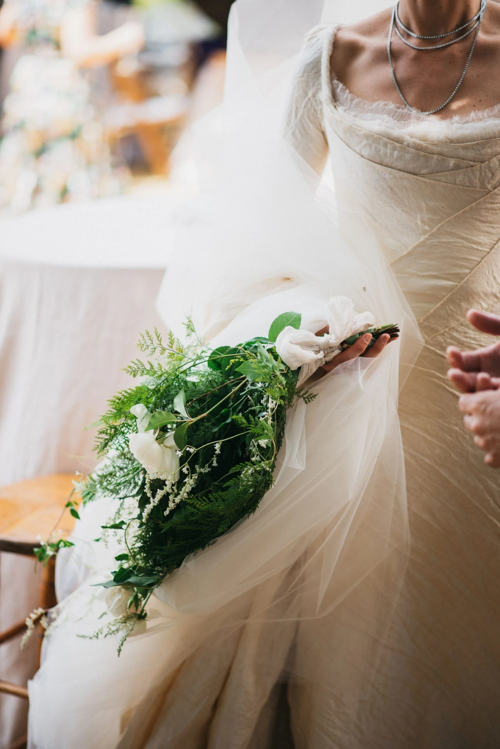 El vestido — como no podía ser de otra manera — lo hicieron ‘en casa’ en el taller de T.ba Brides: «Lo único que le pedí a Sol es que me hiciera un vestido al que le pudiese cortar las mangas y la cola. Tiene una habilidad muy especial para saber que es lo que te favorece y, a los pocos días de contar que nos casábamos, me presentó una idea hecha y me encantó. El mayor reto de todos fue encontrar un hueco para hacerme las pruebas, pero entre reuniones y citas de otras novias bajaba corriendo al showroom e improvisábamos como podíamos».