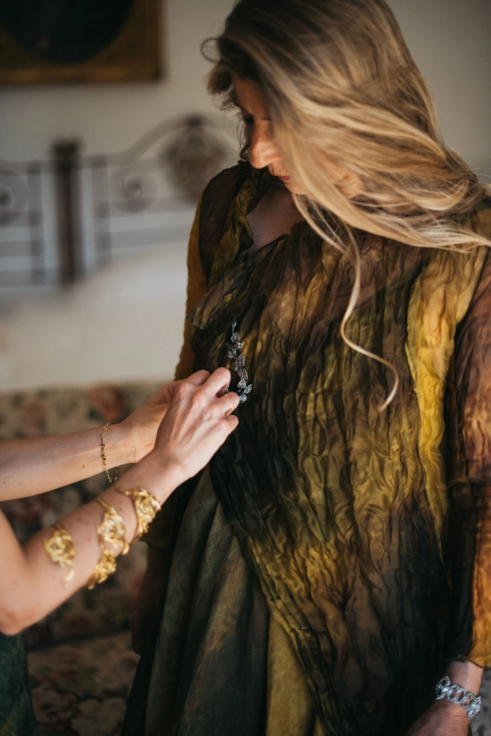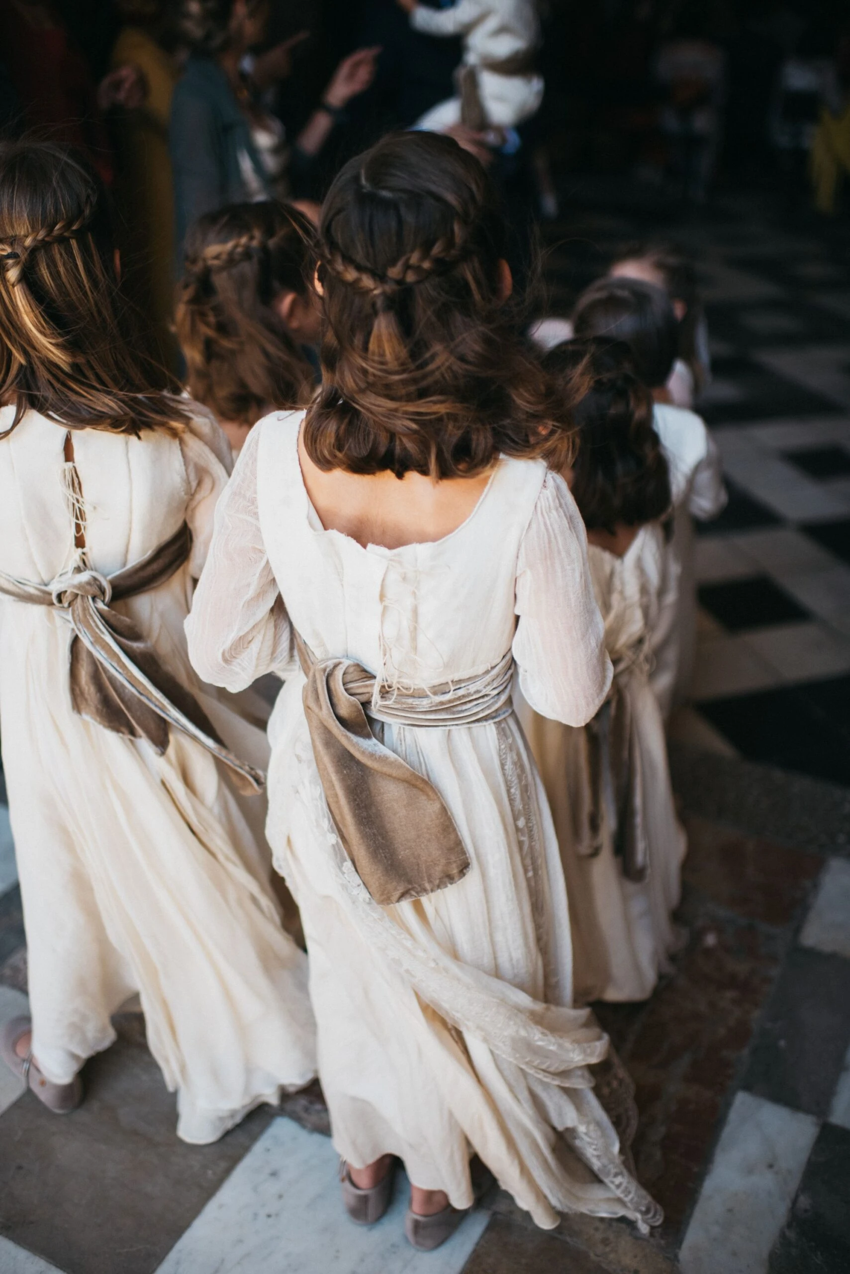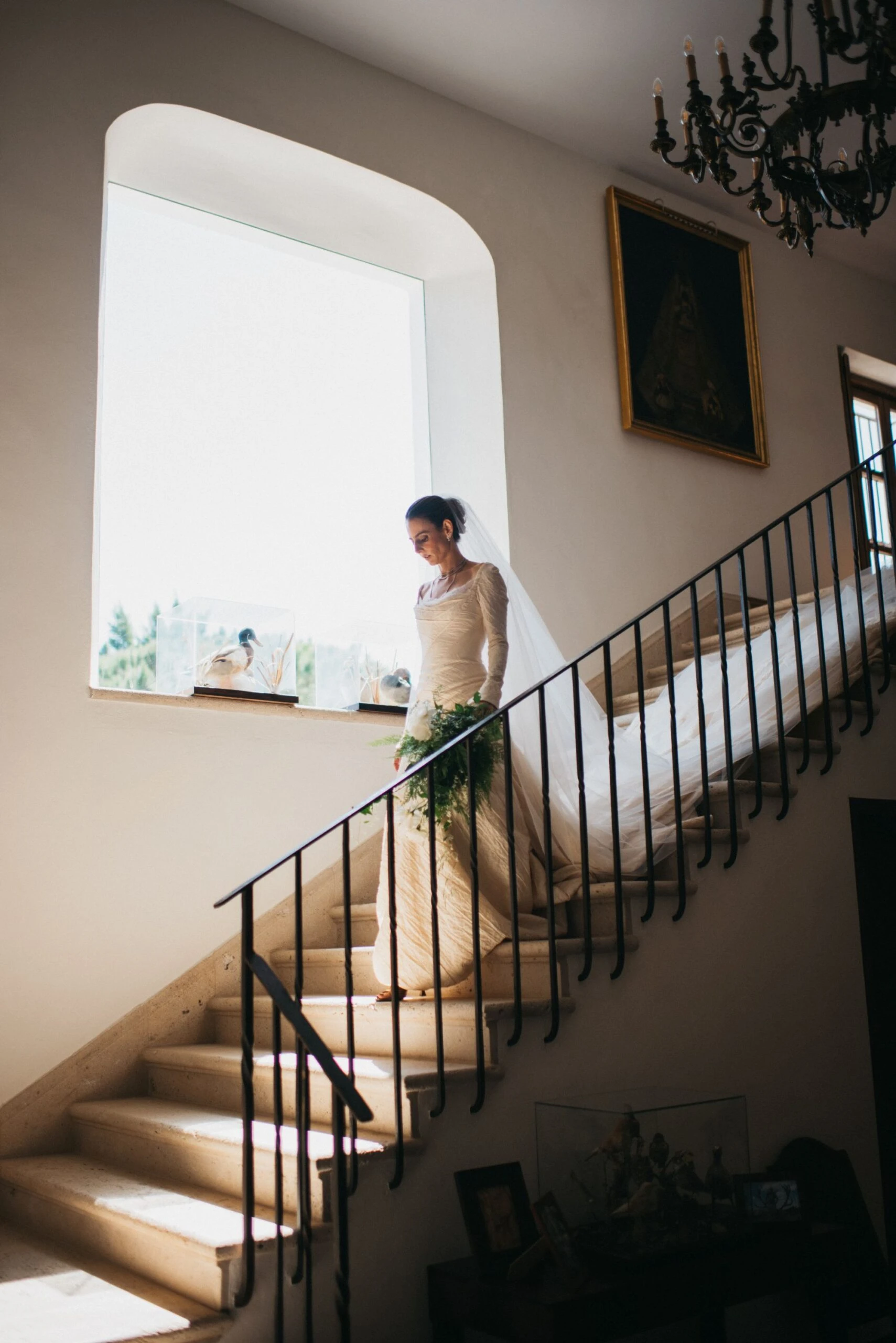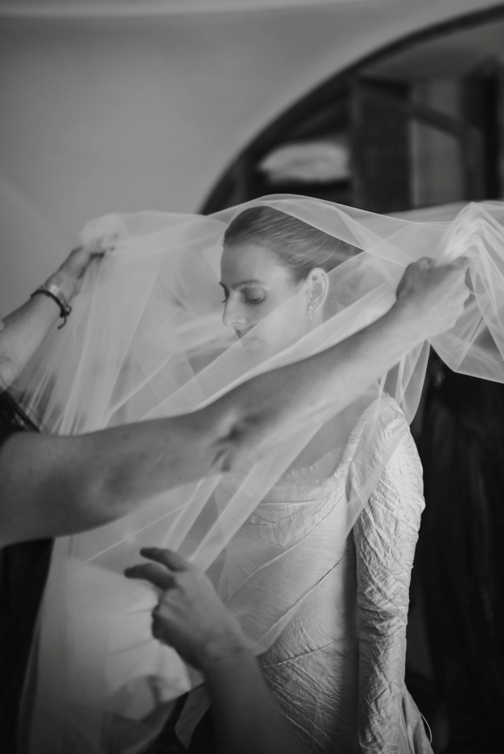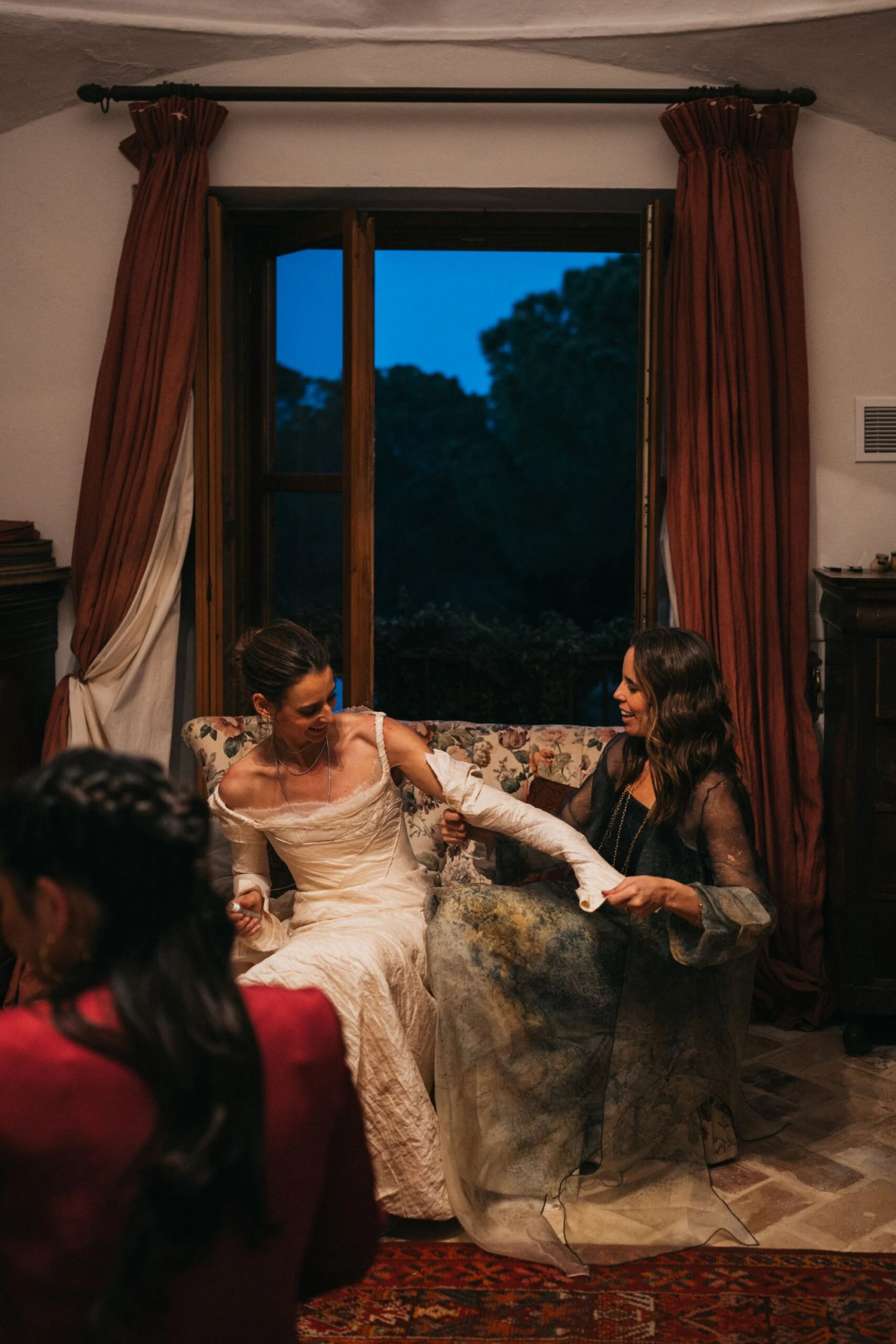 El vestido — como no podía ser de otra manera — lo hicieron ‘en casa’ en el taller de T.ba Brides: «Lo único que le pedí a Sol es que me hiciera un vestido al que le pudiese cortar las mangas y la cola. Tiene una habilidad muy especial para saber que es lo que te favorece y, a los pocos días de contar que nos casábamos, me presentó una idea hecha y me encantó. El mayor reto de todos fue encontrar un hueco para hacerme las pruebas, pero entre reuniones y citas de otras novias bajaba corriendo al showroom e improvisábamos como podíamos».