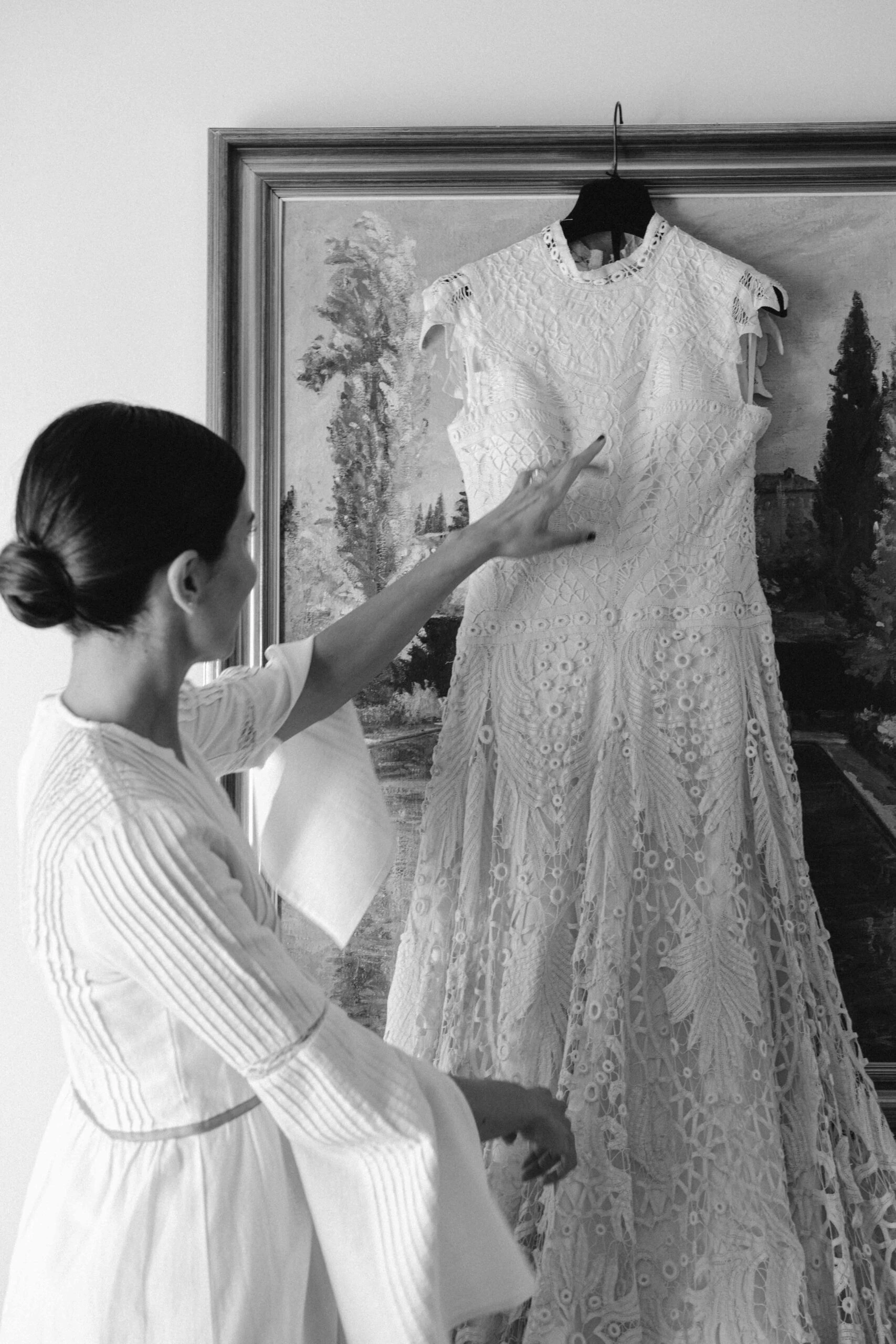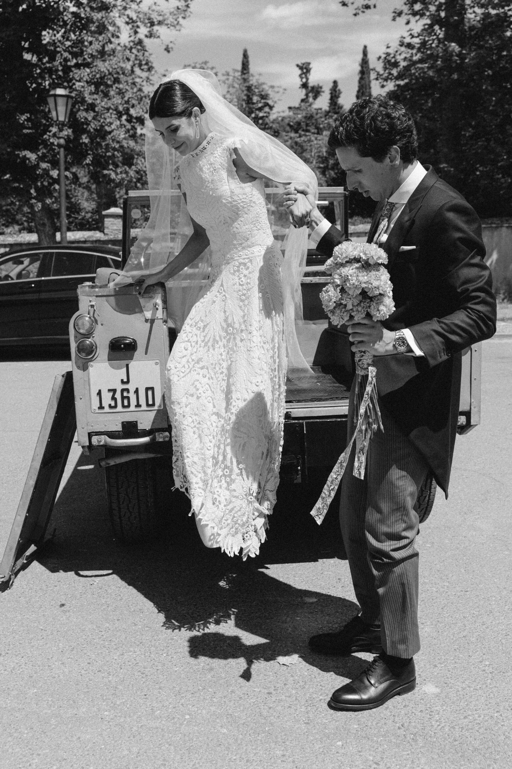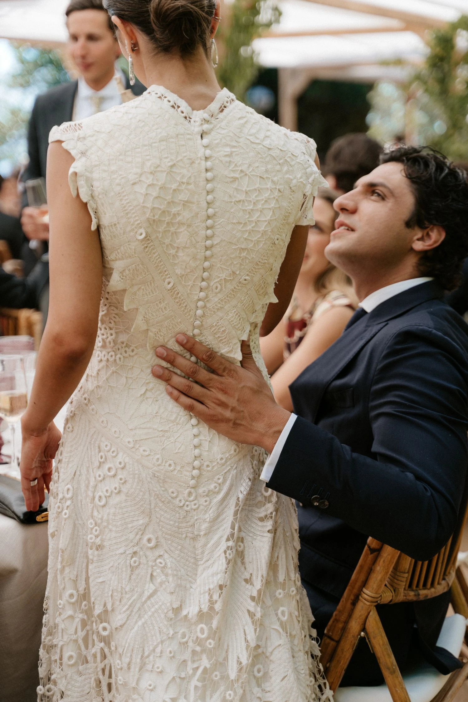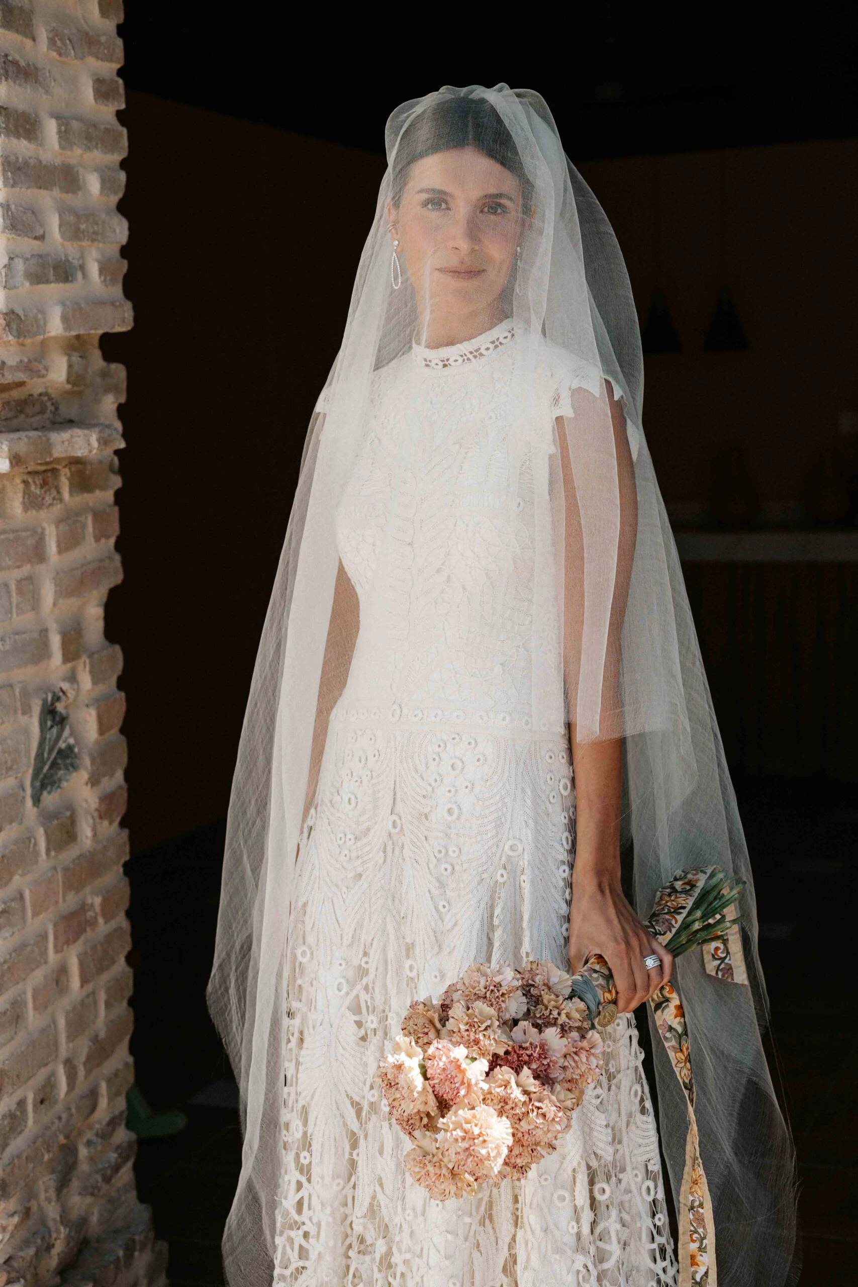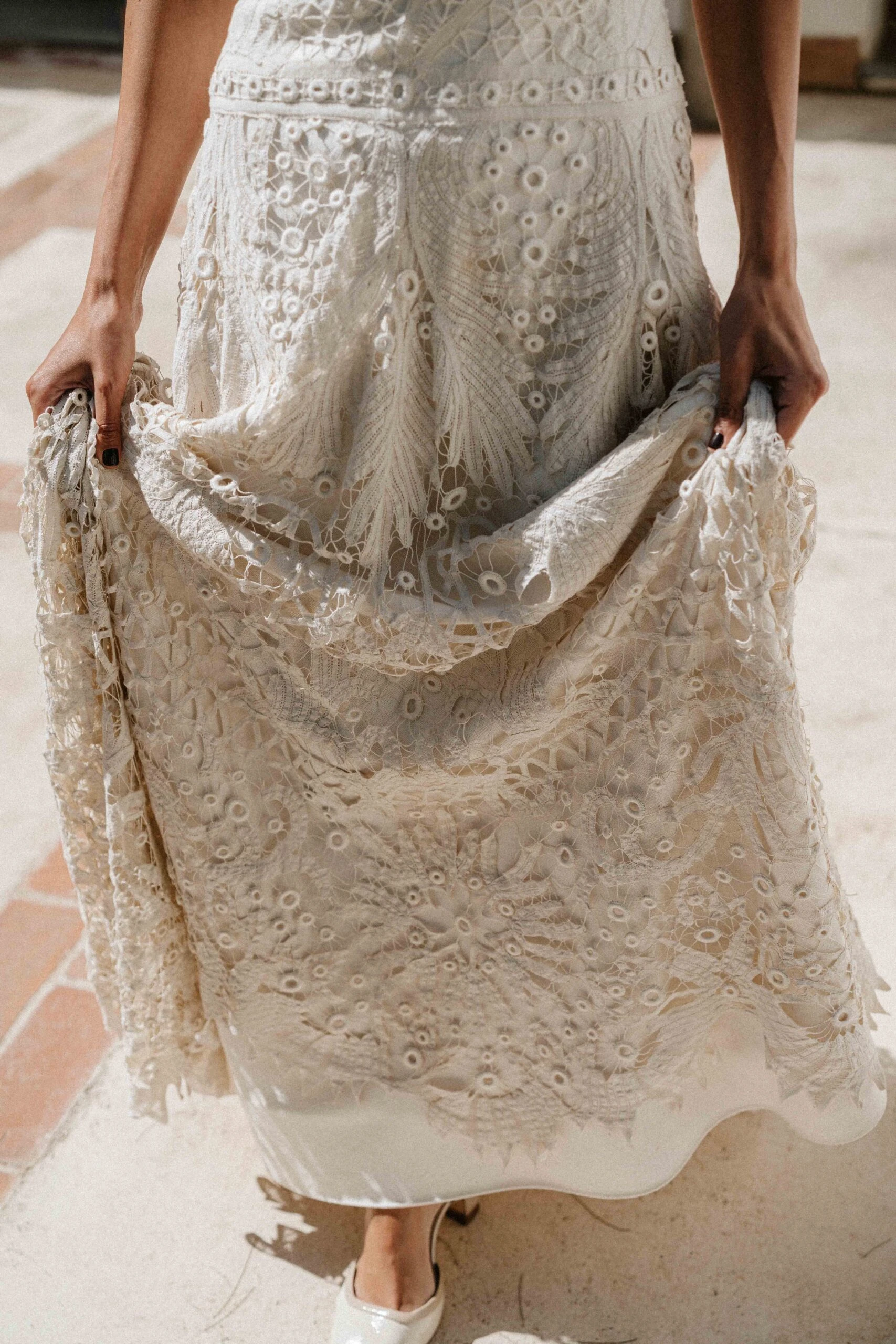 «Tenía claro que quería un vestido de encaje, así que una íntima amiga mía me recomendó acudir a Sofía Delgado. En cuanto vi esa pieza de cintas de finales del siglo XIX en el taller supe que era la mía y, a partir de ahí, construimos el diseño. La utilizamos para dar vuelo a la falda y la integramos con otra pieza similar que encontramos y tiñeron a mano, colocándola sobre el cuerpo hasta conseguir la silueta que buscábamos. También añadimos un interior de seda rústica que lo hacía más moderno y un velo de organza de seda con corte irregular».